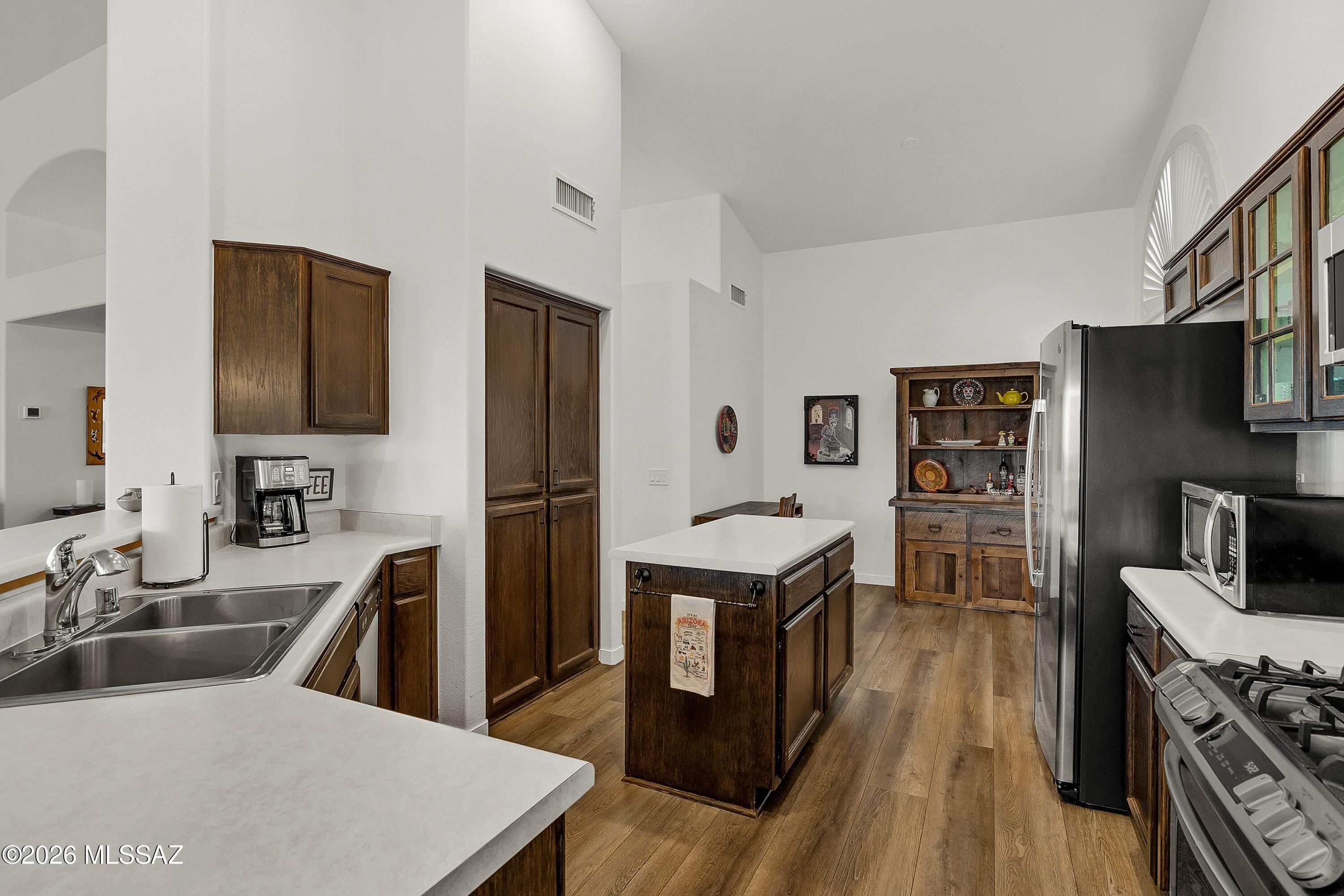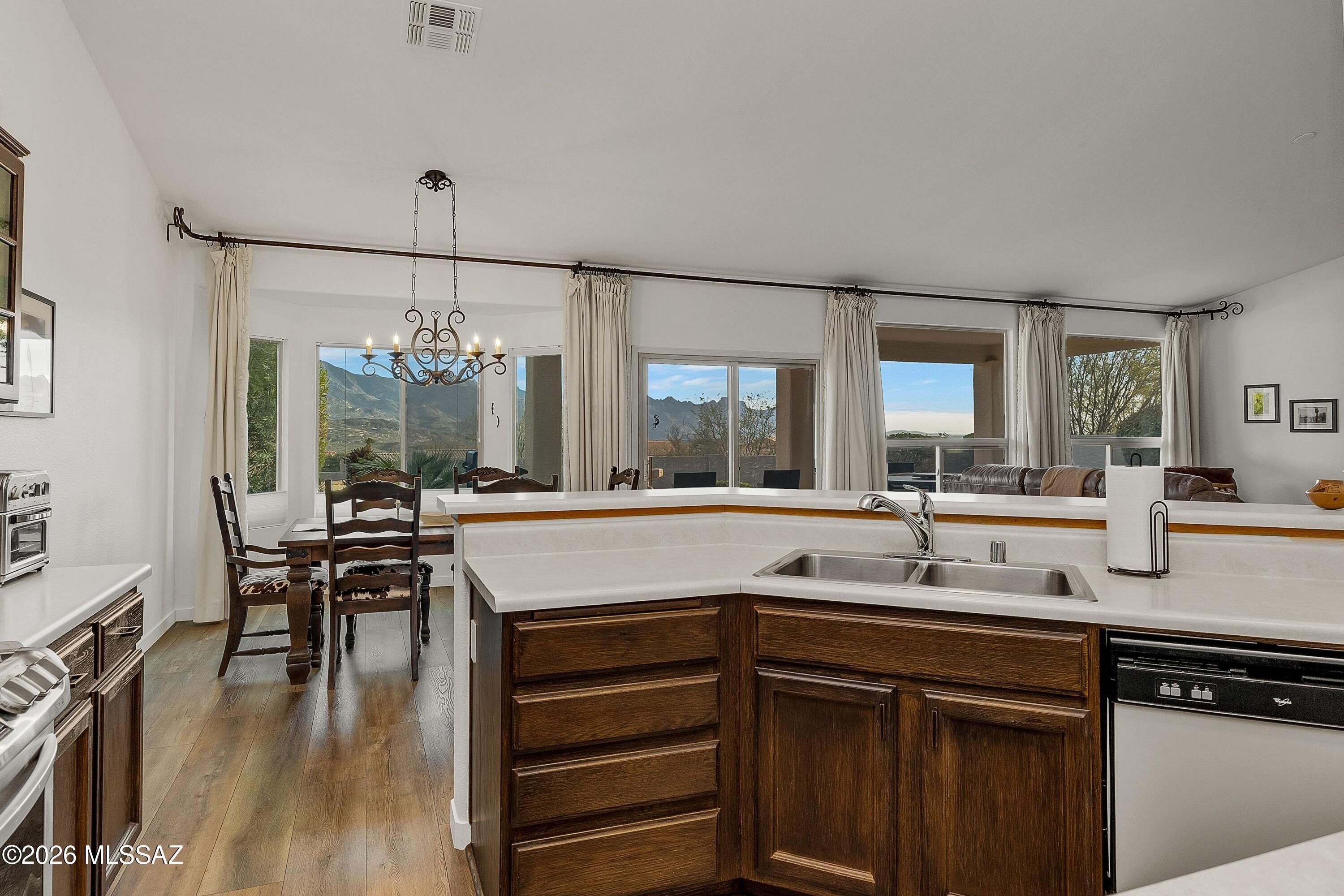 Well-maintained and thoughtfully refreshed Sedona plan at the end of the cul-de-sac with a PRIVATE backyard & MOUNTAIN VIEWS in the active adult community of SaddleBrooke, in HOA 1. Interior improvements include new luxury vinyl plank flooring and baseboards throughout, fresh interior paint, and additional electrical outlets for enhanced functionality. Cabinetry in the kitchen and bathrooms has been resurfaced, creating a clean, updated look. Kitchen upgrades feature a new oven/range, microwave/vent (exhaust rerouted to the exterior), refrigerator, and updated faucet. Major system updates provide added peace of mind, including a newer HVAC system and water heater, a replaced irrigation system, and new Low-E glass in south-facing windows for improved energy efficiency.