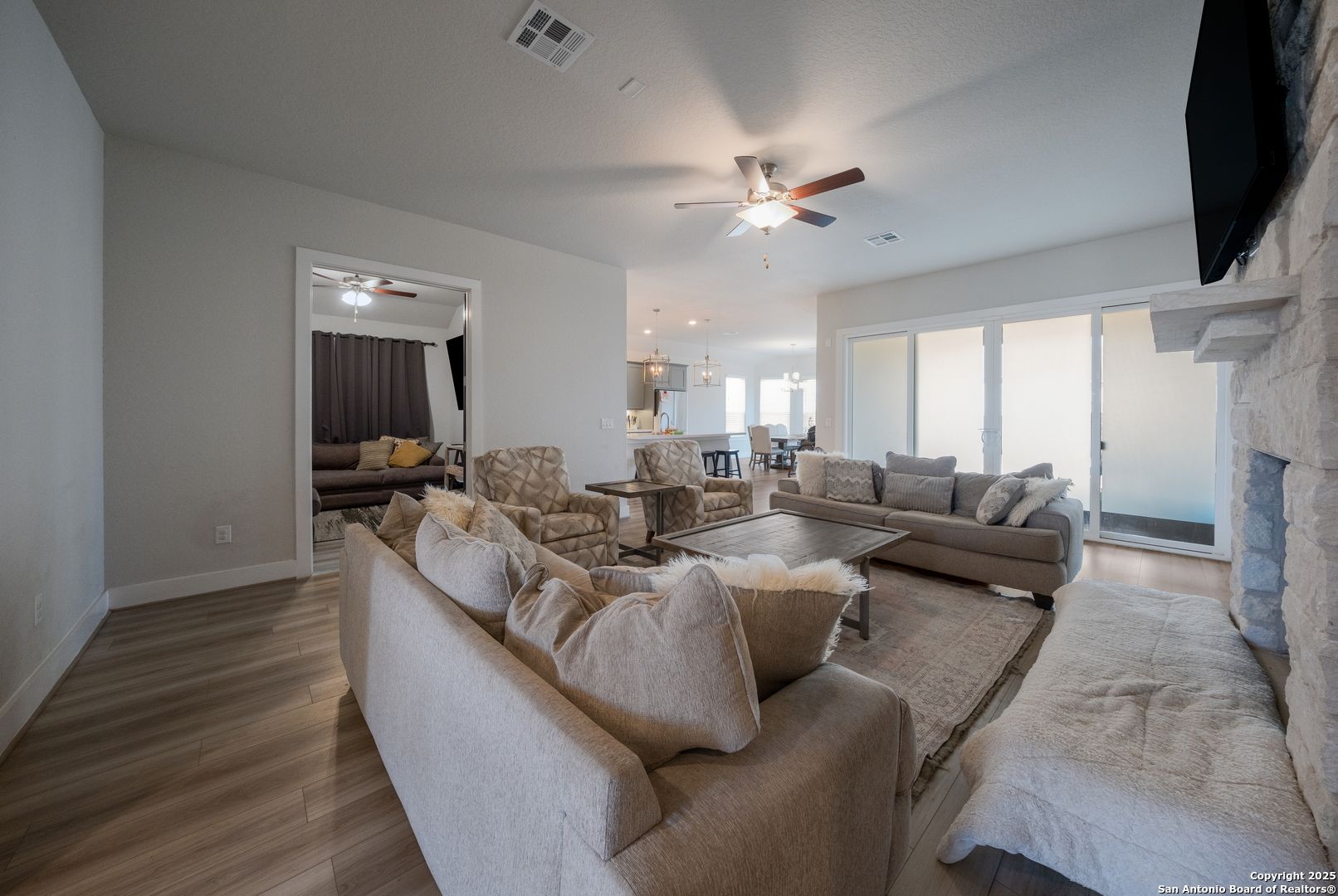 **Assumable Loan and Owner Finance available** Welcome to this stunning home in The Grove at Vintage Oaks, located in a quiet cul-de-sac! Offering 4 bedrooms, 3 bathrooms, and nearly 2,800 sqft of living space, this spacious home is designed for comfort and style. As you enter, you'll be greeted by high ceilings and an open-concept living area, highlighted by a cozy fireplace and large windows that fill the space with natural light. The chef-inspired kitchen is perfect for entertaining, featuring granite countertops, stainless steel appliances, a generous island, a roomy walk-in pantry, and ample storage. For added convenience, the kitchen includes an osmosis water system at the sink. The home also features a HEPA air filtration system located in the attic and a water softener for your comfort. The primary suite, located on the main level, boasts an ensuite bath with a soaking tub, separate shower, and dual vanities. A versatile flex room is ideal for a home office or game room. Outside, enjoy the beautiful Texas weather on the covered patio, perfect for grilling and relaxation.