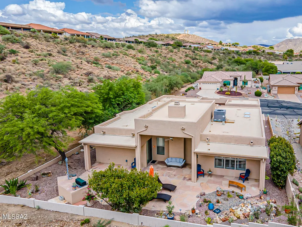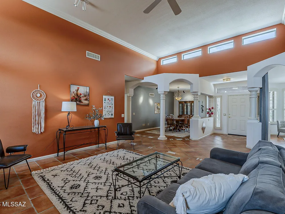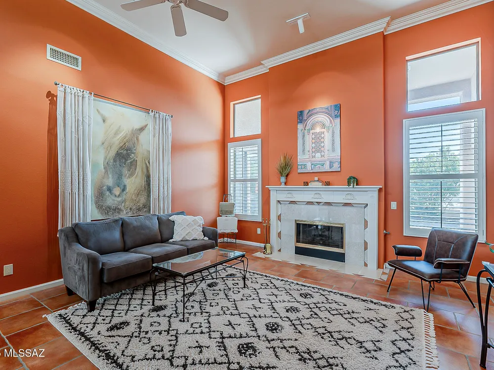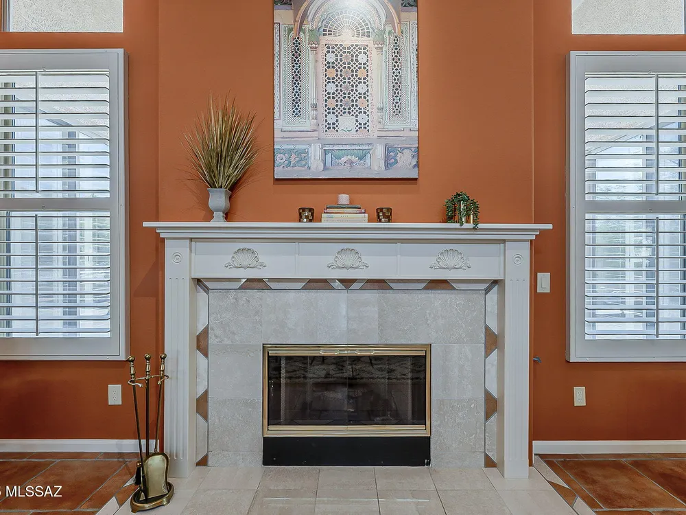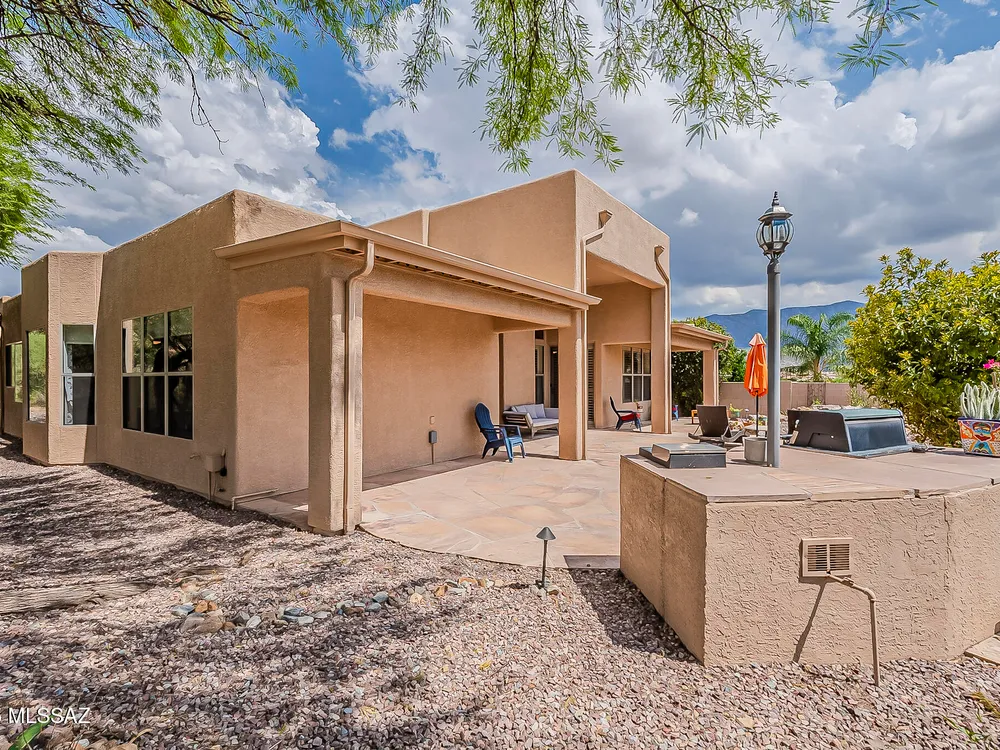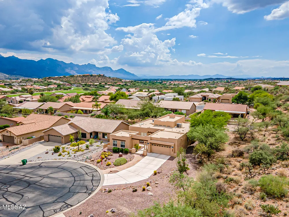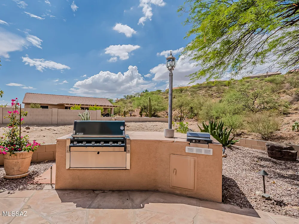 Nestled at the end of a quiet cul-de-sac on a premium elevated lot, this partially furnished Estancia model w/ the coveted private Casita offers a rare blend of elegance, space & serenity. Surrounded by open common areas and featuring a coveted north/south orientation, the home captures breathtaking views of the Catalina Mountains. Inside, you'll find cathedral ceilings, built-in shelving, ceramic tile throughout (no carpet), classic shutters, a cozy gas fireplace, a den, and a formal dining room with a wine cooler just steps away. The culinary-inspired kitchen is both stylish and functional, boasting marble countertops, a generous island, high-end appliances, and a garden window perfect for growing herbs while overlooking the natural desert--frequented by birds, deer, rabbits, and mo
