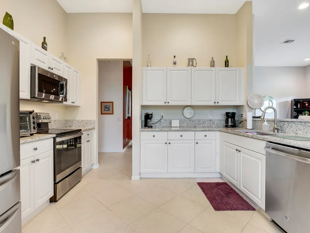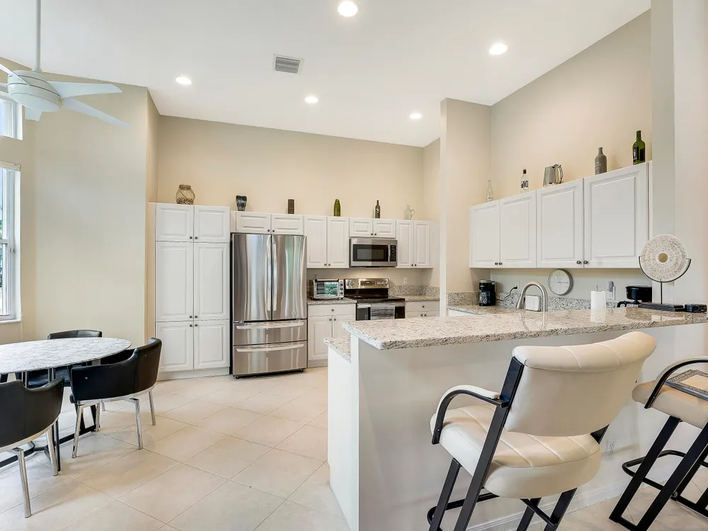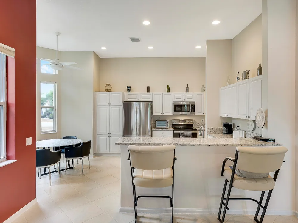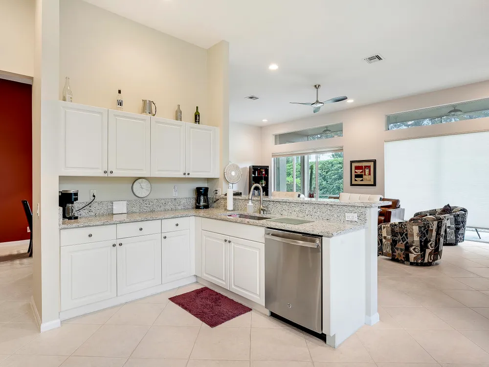 Welcome to Beautiful Bellaggio! This Alexander Model is highly sort after, and one of the most Popular Homes. People love this Layout due to the Open Floor Plan and Breakfast Nook. This is a 3 Bedroom, 2 Bath home in which the 3rd Bedroom is being used as a Den. Kitchen has Bright White Cabinets, Granite Countertops and updated Stainless Steel Appliances. Guest Bedroom & Den have Wood Floors. Master Bathroom & Guest Bathroom have Vanities with Granite Countertops. Master Bathroom has a ''Jacuzzi Tub.'' Washer & Dryer were replaced a few years ago with a Utility Sink inside the Laundry Room. Air Conditioner replaced a year ago. There are Accordion Hurricane Shutters throughout the house. All Built-in Remain with House including the Desk in the Den.
