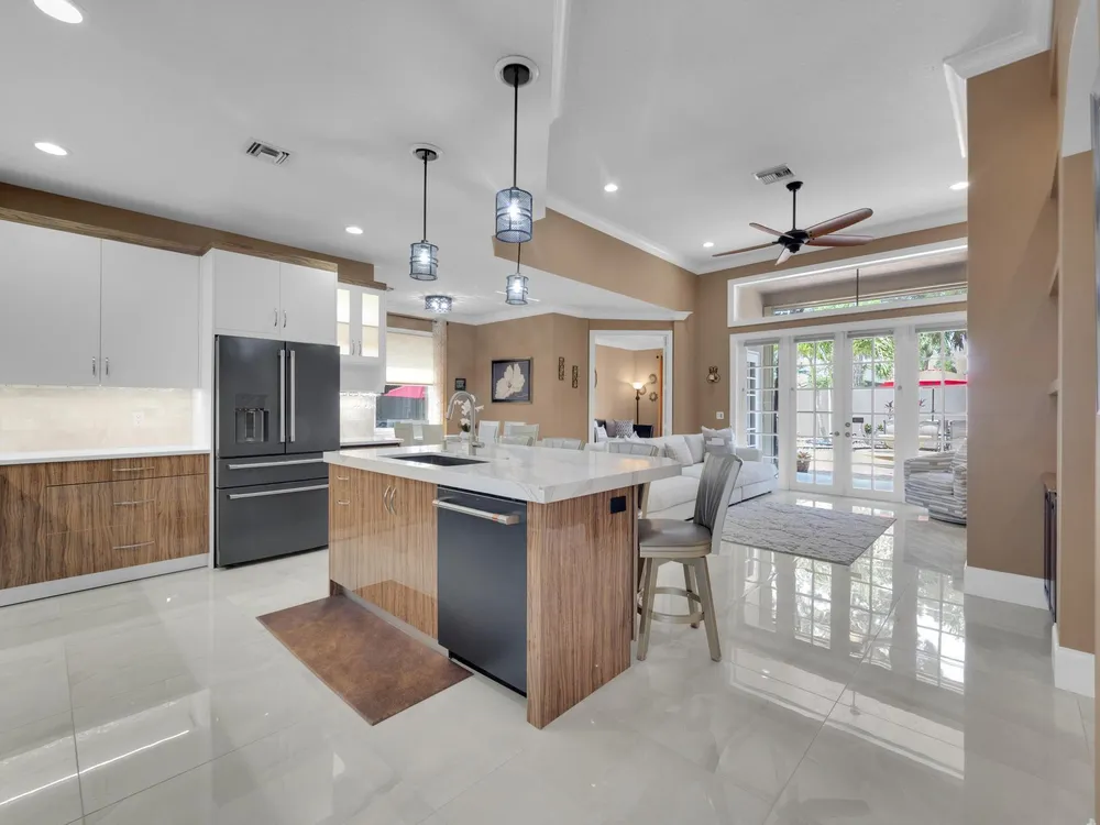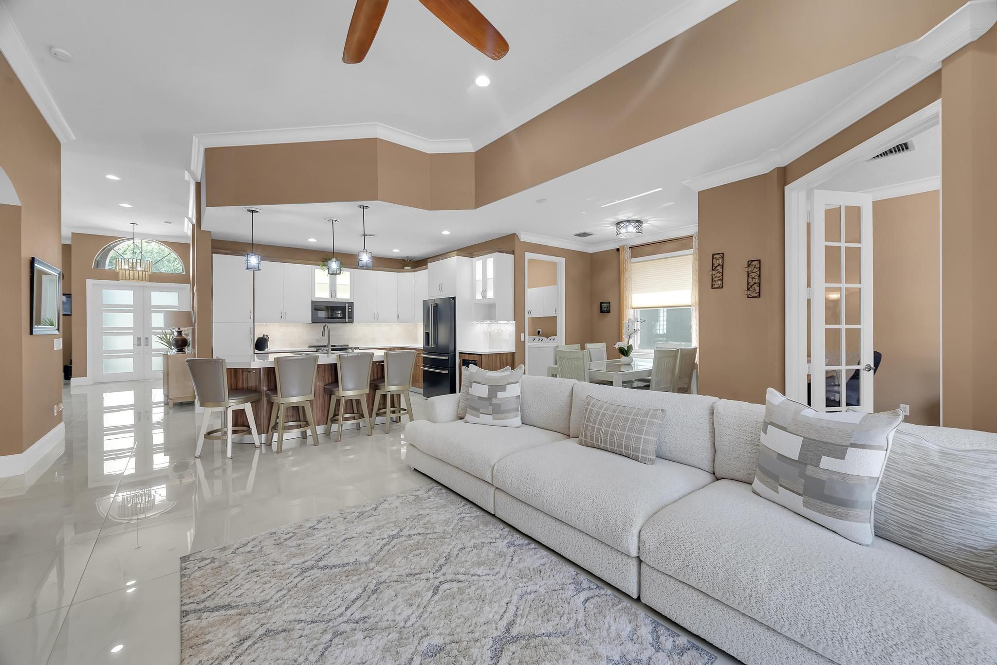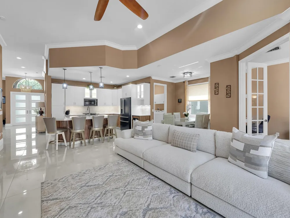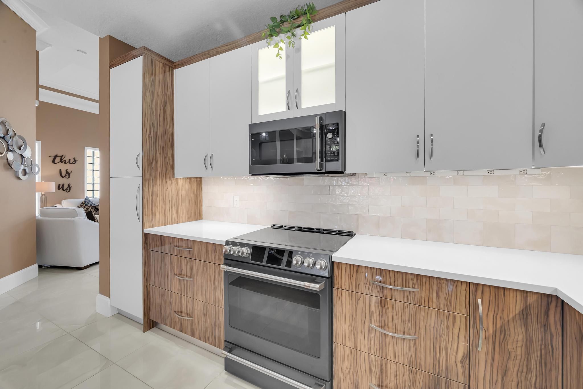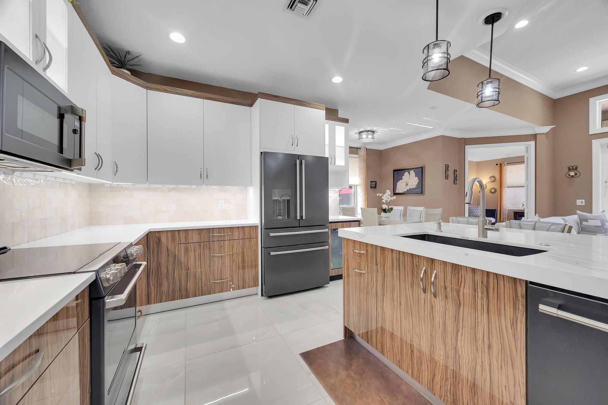 PRICE REDUCTION -SELLER MOTIVATED Nestled within the sought-after Aberdeen Golf & Country Club, this stunning 2 bedroom, 2 bathroom plus den home offers a seamless blend of modern luxury and resort-style living. Fully remodeled and move-in ready, every detail of this residence has been meticulously upgraded to create a sanctuary of sophistication and comfort. Step inside to discover an open-concept floorplan bathed in natural light, soaring high ceilings, crown molding and high end finishes throughout. The heart of the home is the brand-new gourmet kitchen, featuring sleek natural stone countertops, soft-close cabinetry, and top-tier GE CAFE appliances- perfect for both casual meals and entertaining.