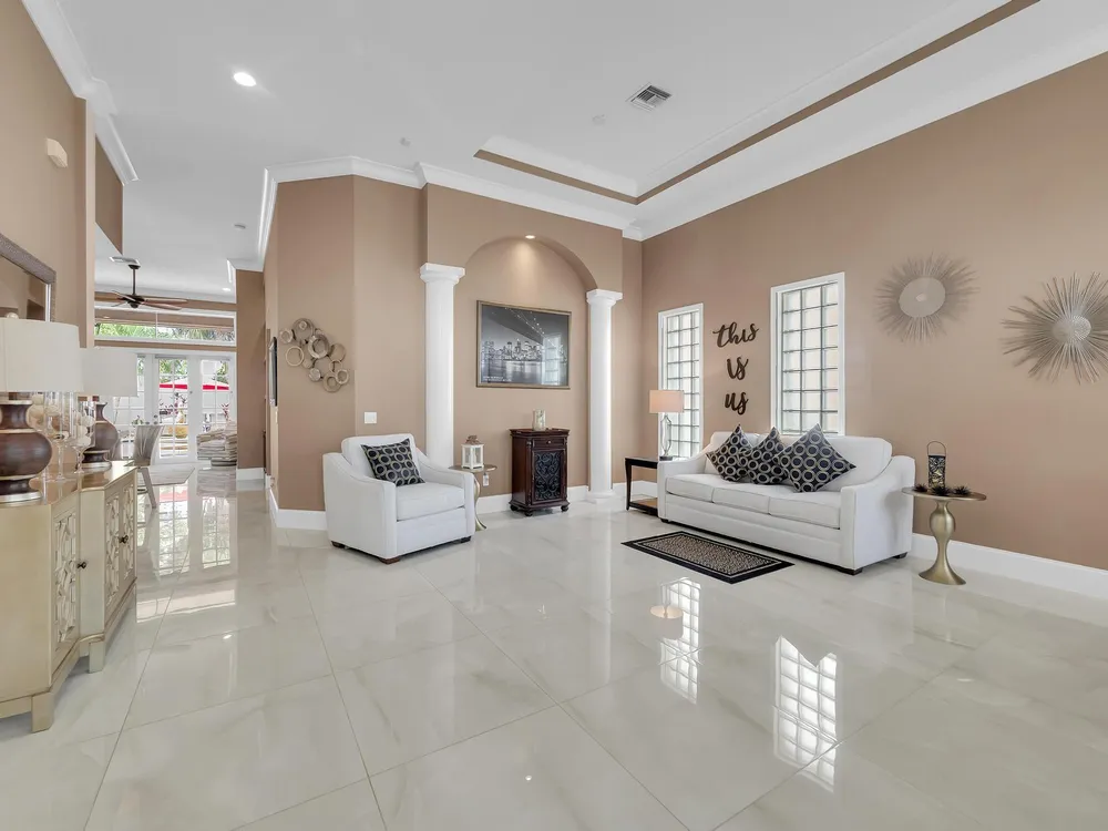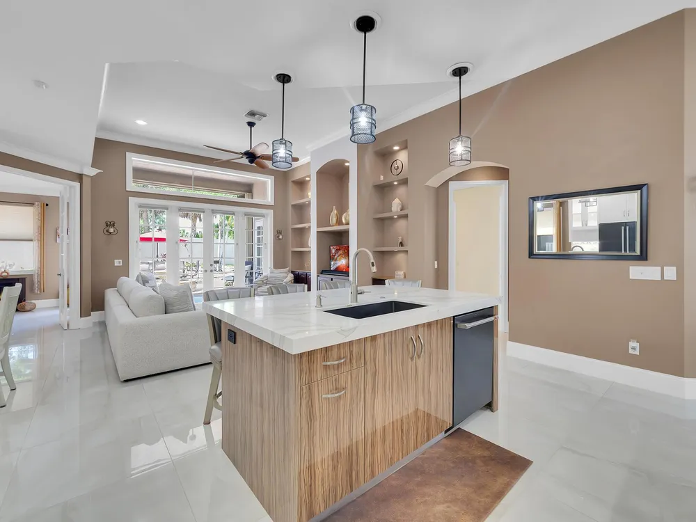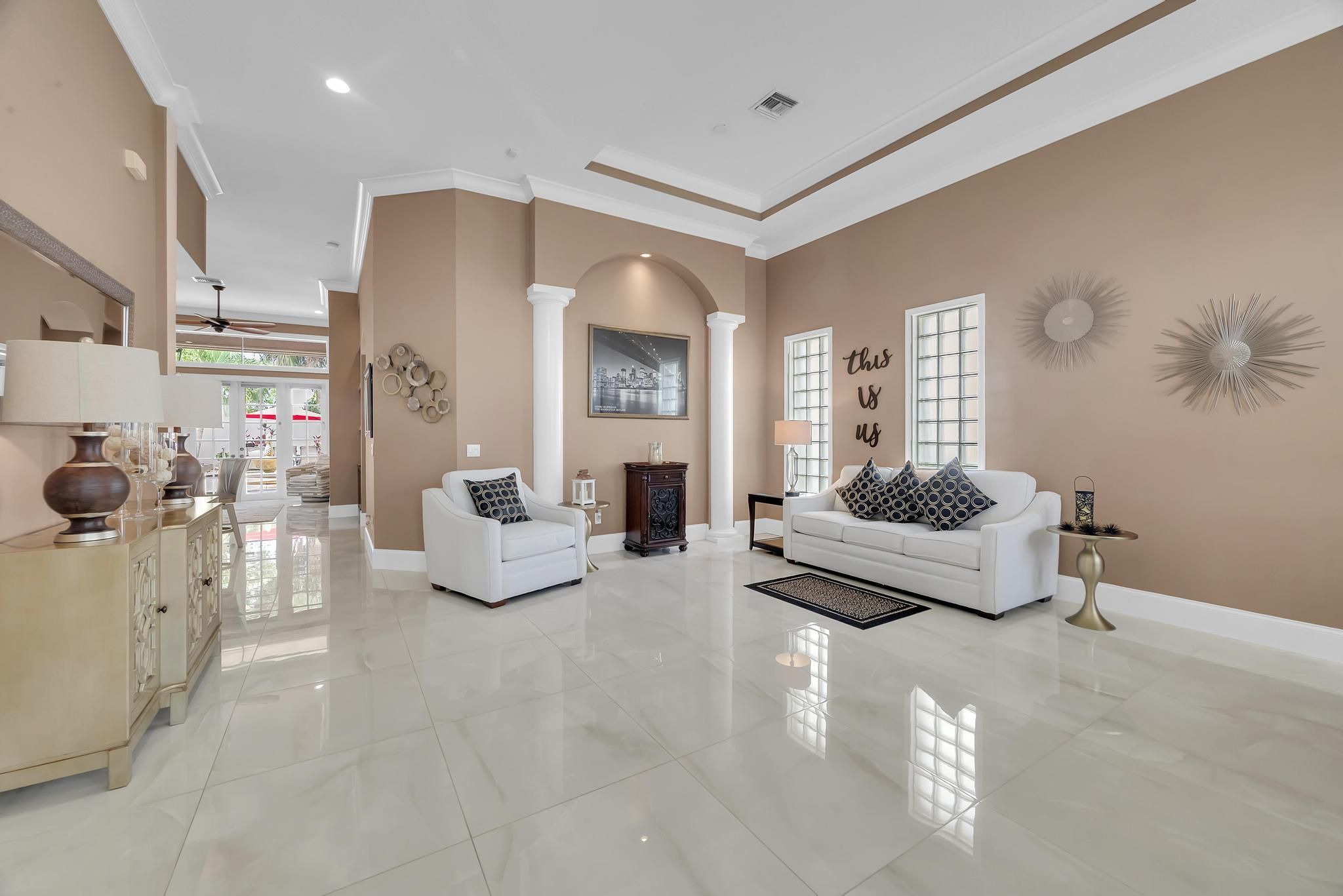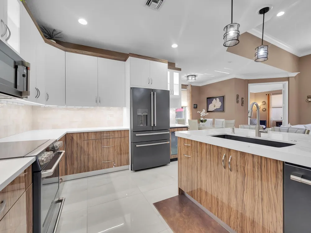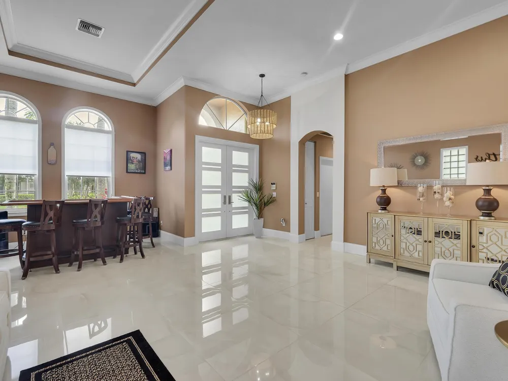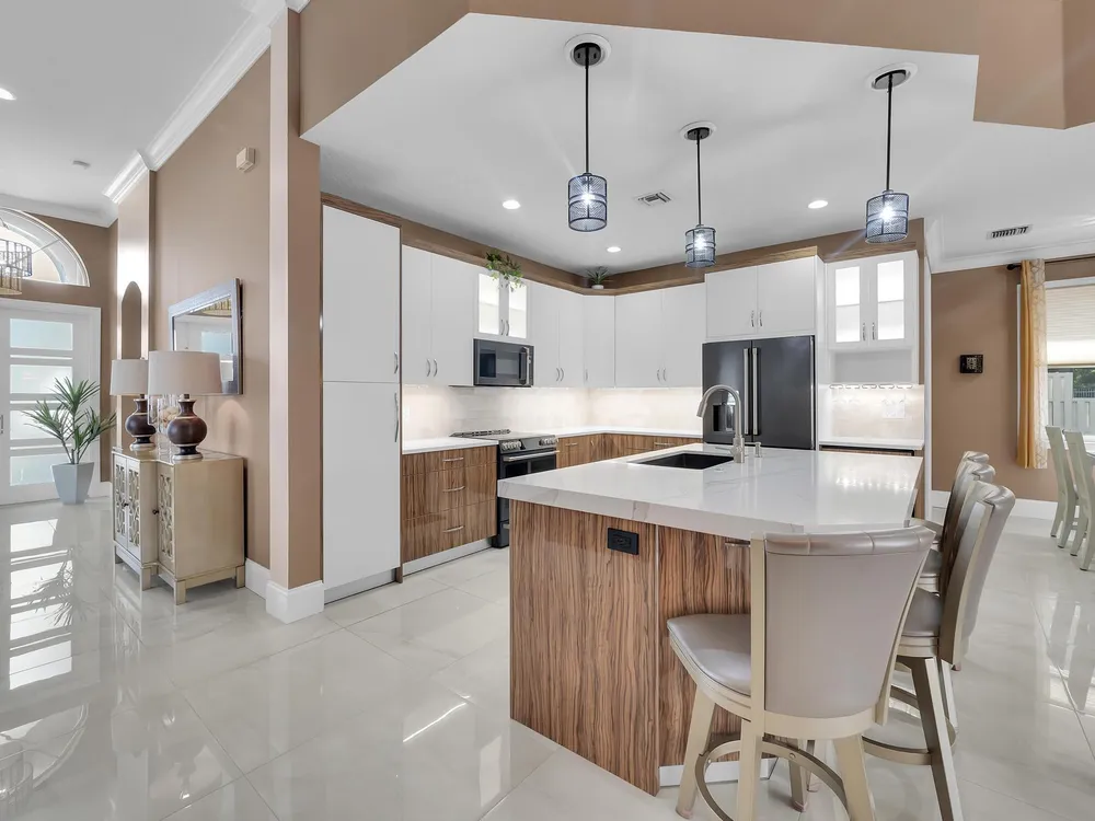 PRICE REDUCTION -SELLER MOTIVATED Nestled within the sought-after Aberdeen Golf & Country Club, this stunning 2 bedroom, 2 bathroom plus den home offers a seamless blend of modern luxury and resort-style living. Fully remodeled and move-in ready, every detail of this residence has been meticulously upgraded to create a sanctuary of sophistication and comfort. Step inside to discover an open-concept floorplan bathed in natural light, soaring high ceilings, crown molding and high end finishes throughout. The heart of the home is the brand-new gourmet kitchen, featuring sleek natural stone countertops, soft-close cabinetry, and top-tier GE CAFE appliances- perfect for both casual meals and entertaining.
