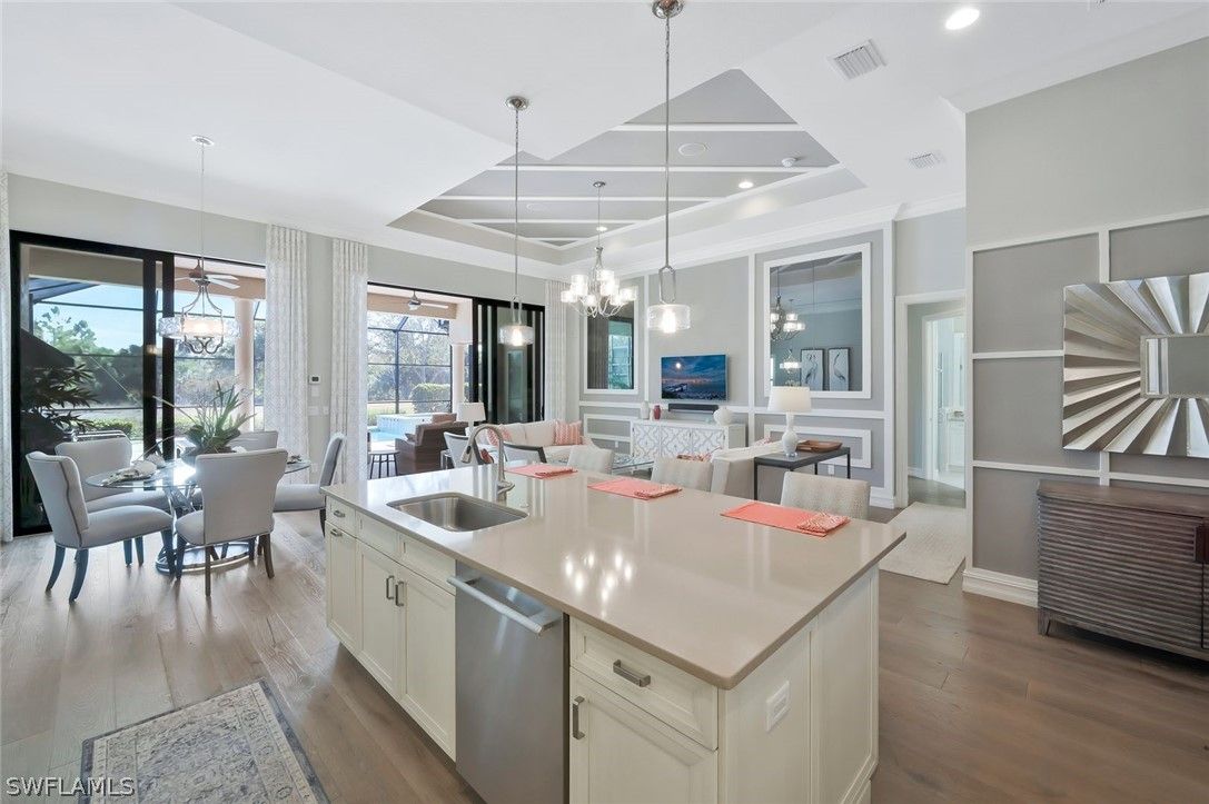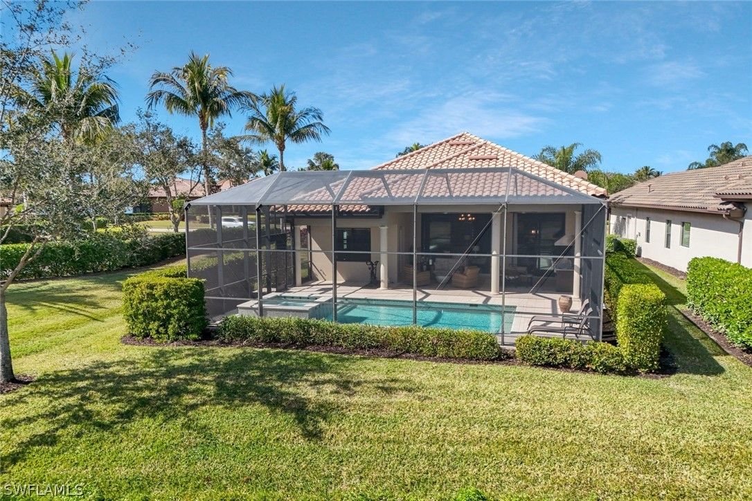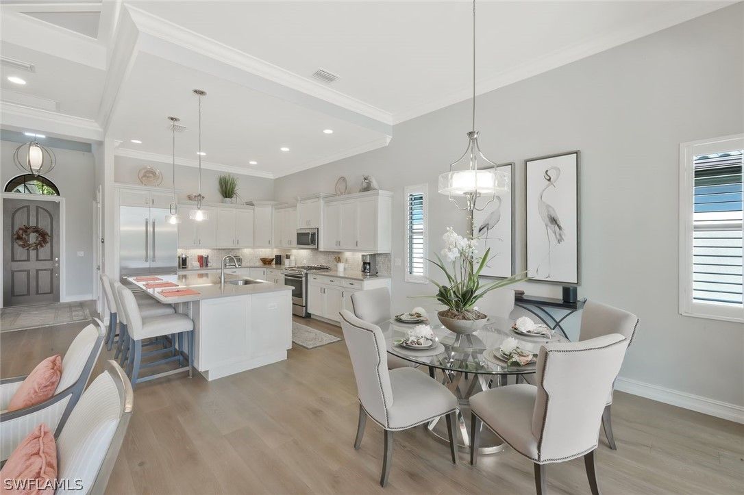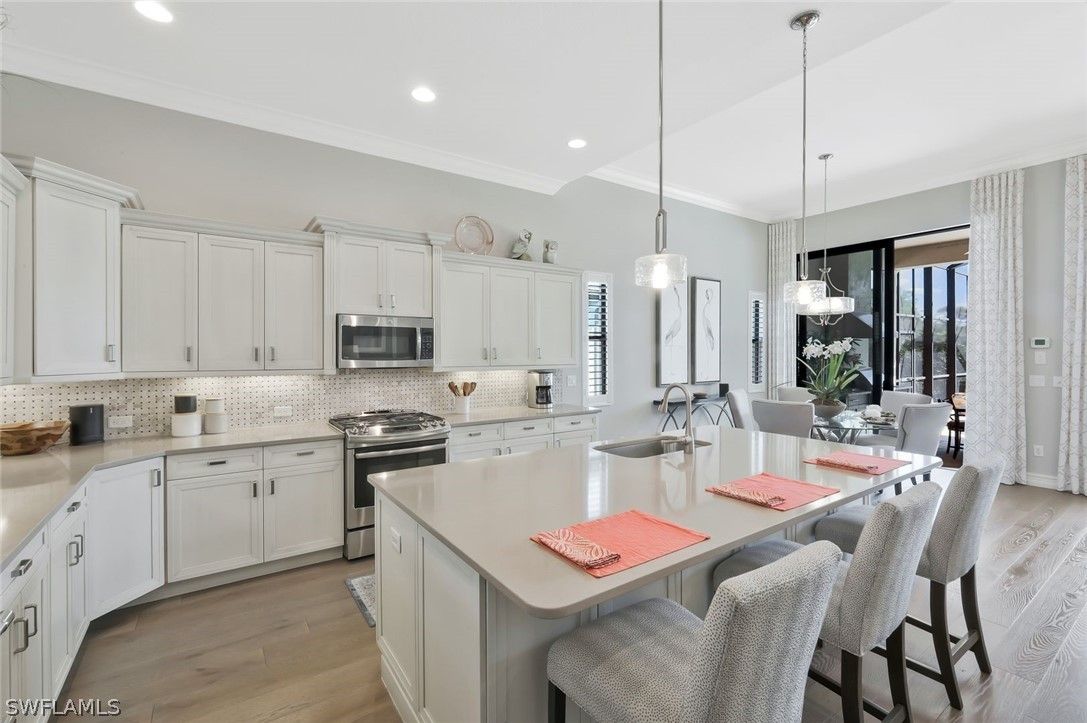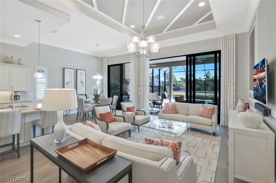 Welcome to the exquisite former San Remo III Model Home, a professionally furnished and impeccably maintained residence offering 3 bedrooms and 2 baths of refined living. Being offered turnkey, this exceptional home presents a rare opportunity to move right in and enjoy designer-curated elegance and premium upgrades throughout. From the moment you enter, you’ll appreciate the thoughtful details and elevated finishes that set this home apart. The spacious living areas are enhanced by rich hardwood flooring, crown molding throughout, and an abundance of natural light streaming through impact-resistant windows and doors. The chef-inspired kitchen is beautifully appointed with upgraded cabinetry, stunning granite and quartz countertops, and newer stainless-steel appliances including a brand-new refrigerator and dishwasher. Stylish upgraded wall and floor tile selections add a sophisticated touch to both the kitchen and baths. Step outside to your private retreat featuring a heated pool and spa, perfectly positioned to capture tranquil pond views. Whether enjoying a quiet morning coffee or entertaining guests, the outdoor living space offers both privacy and serenity in a picturesque setting. This former model home showcases quality craftsmanship, designer furnishings, and premium upgrades rarely found at this price point. A true blend of comfort, style, and luxury — this is Florida living at its finest.