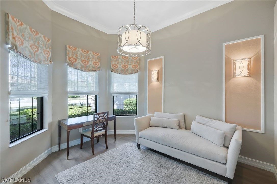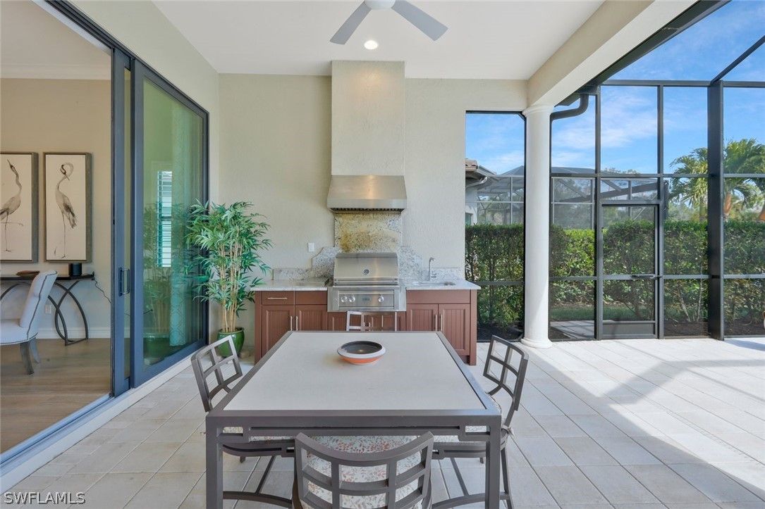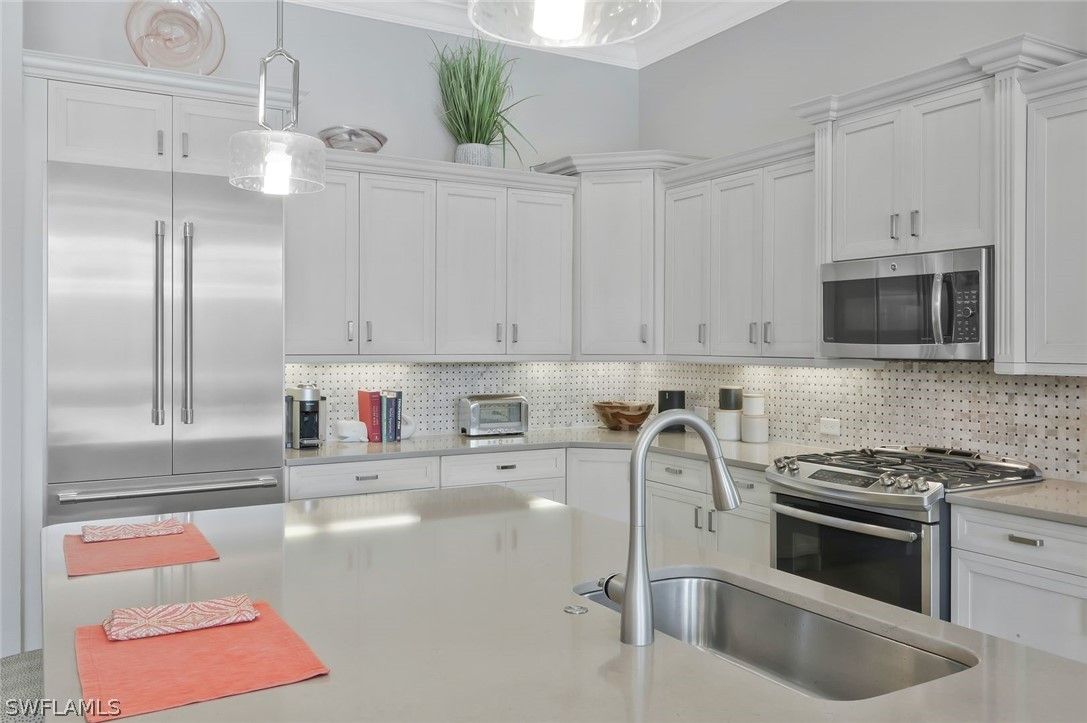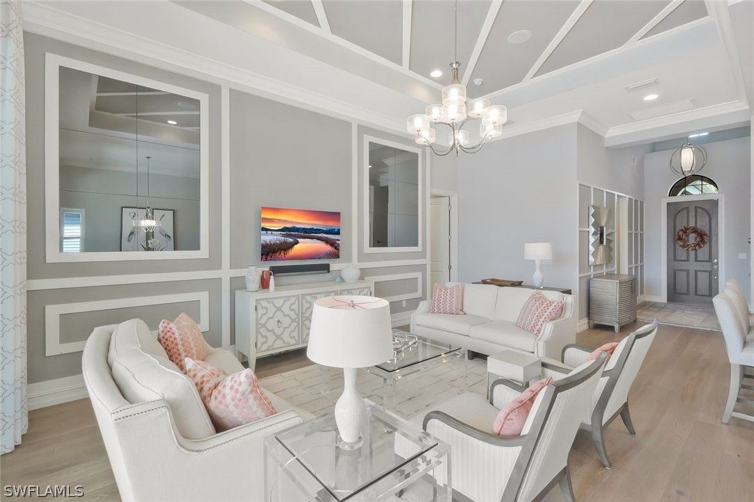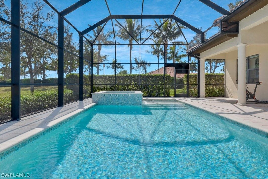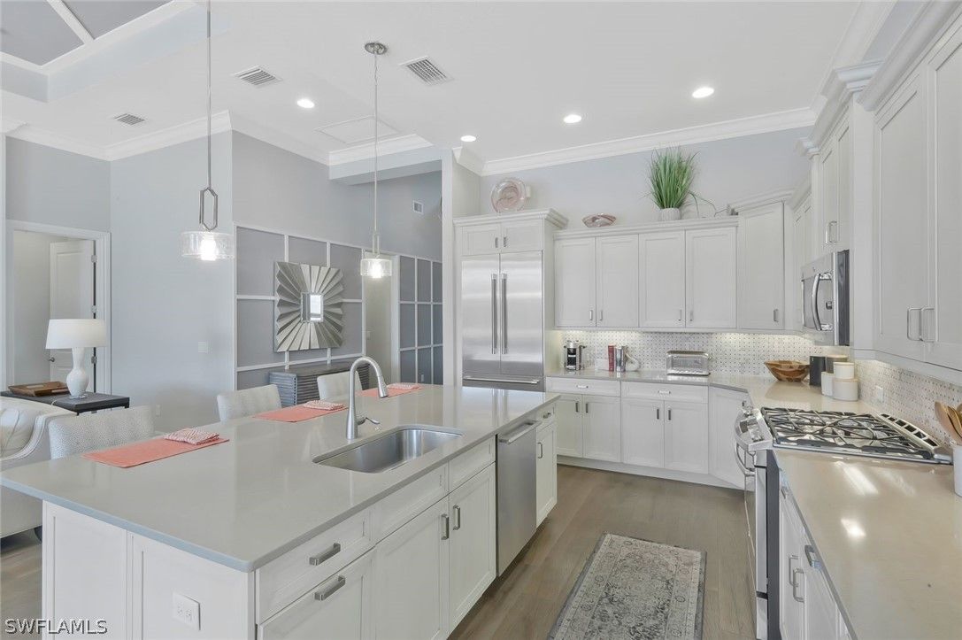 Welcome to the exquisite former San Remo III Model Home, a professionally furnished and impeccably maintained residence offering 3 bedrooms and 2 baths of refined living. Being offered turnkey, this exceptional home presents a rare opportunity to move right in and enjoy designer-curated elegance and premium upgrades throughout. From the moment you enter, you’ll appreciate the thoughtful details and elevated finishes that set this home apart. The spacious living areas are enhanced by rich hardwood flooring, crown molding throughout, and an abundance of natural light streaming through impact-resistant windows and doors. The chef-inspired kitchen is beautifully appointed with upgraded cabinetry, stunning granite and quartz countertops, and newer stainless-steel appliances including a brand-new refrigerator and dishwasher. Stylish upgraded wall and floor tile selections add a sophisticated touch to both the kitchen and baths. Step outside to your private retreat featuring a heated pool and spa, perfectly positioned to capture tranquil pond views. Whether enjoying a quiet morning coffee or entertaining guests, the outdoor living space offers both privacy and serenity in a picturesque setting. This former model home showcases quality craftsmanship, designer furnishings, and premium upgrades rarely found at this price point. A true blend of comfort, style, and luxury — this is Florida living at its finest.