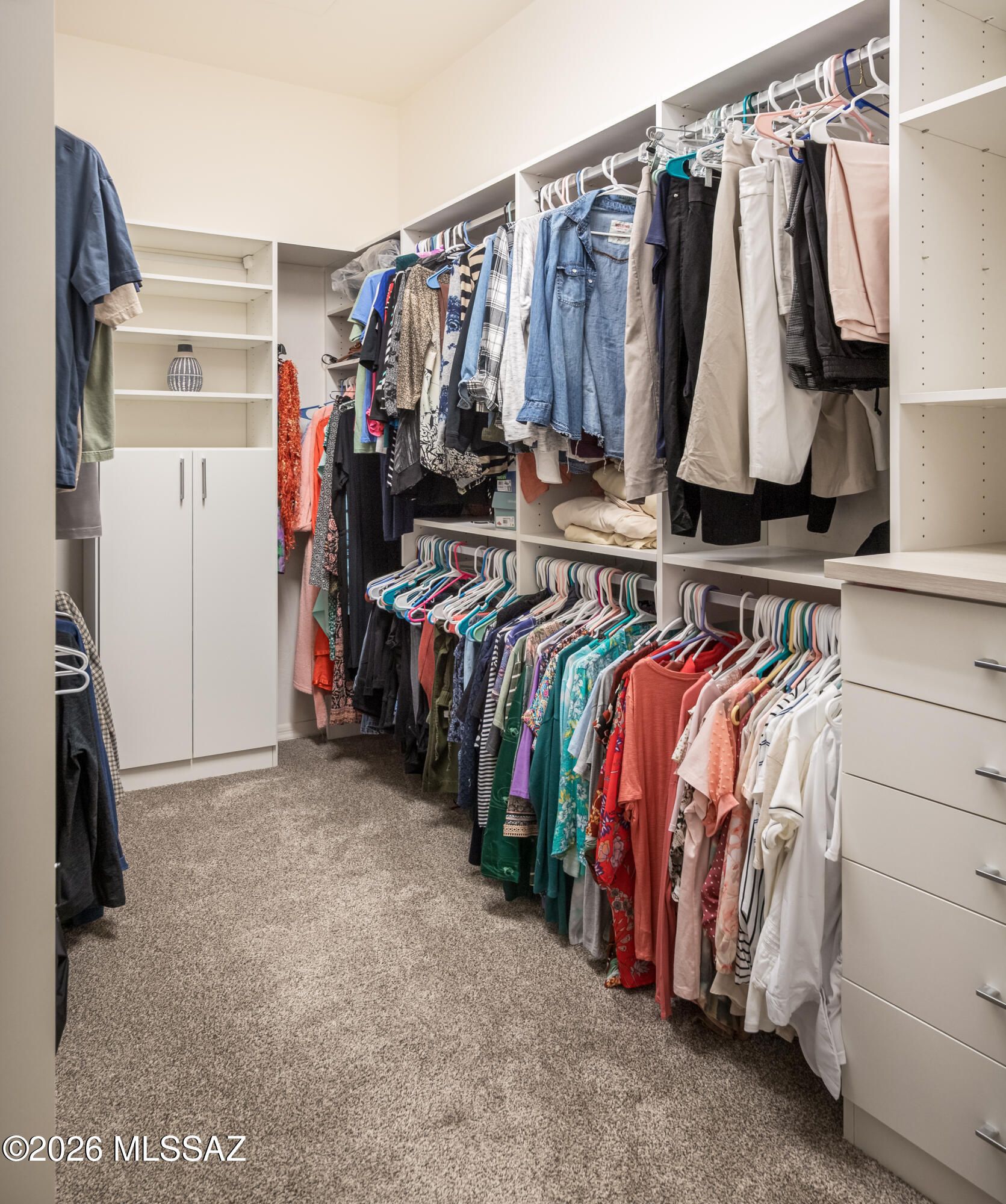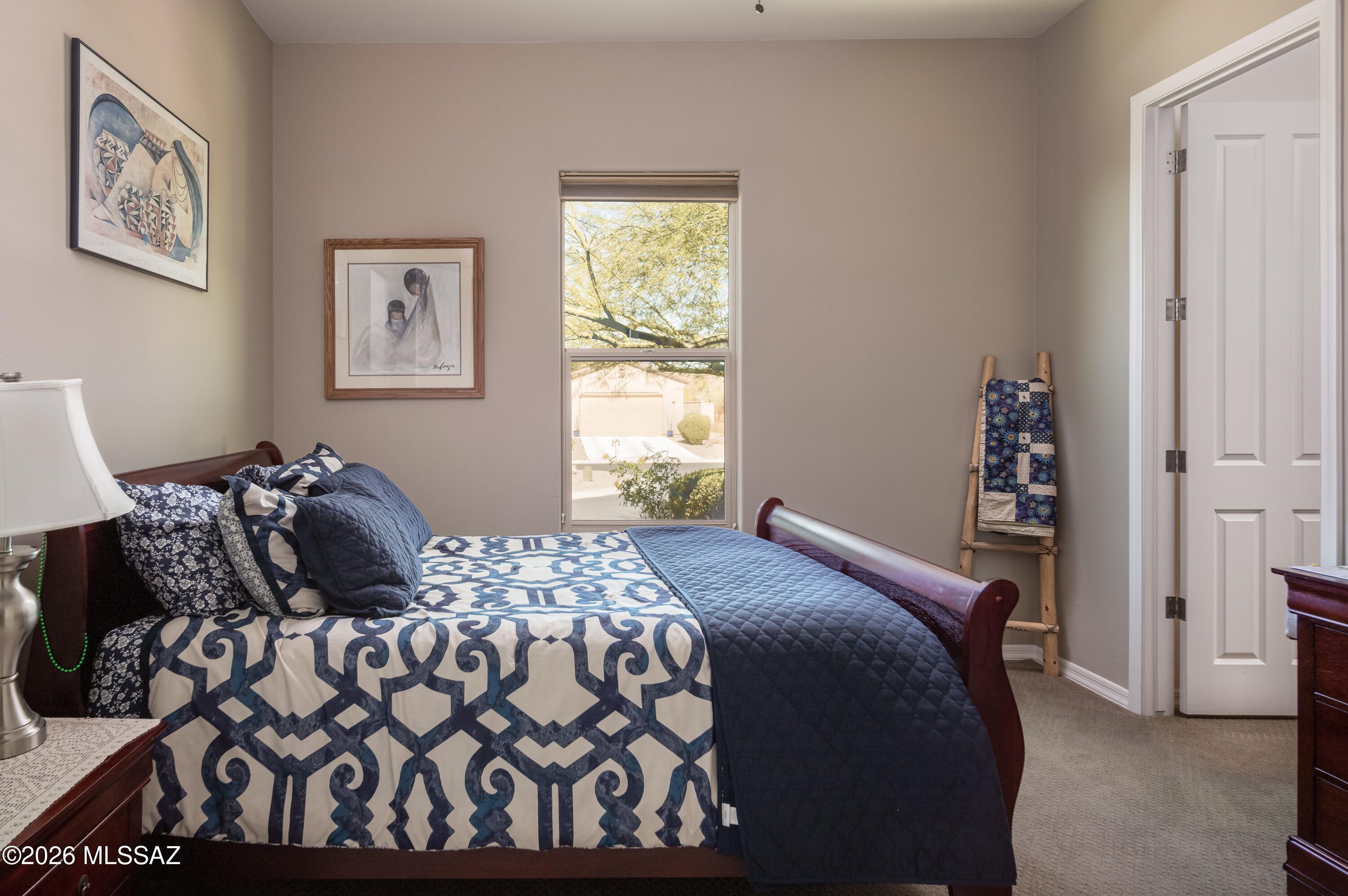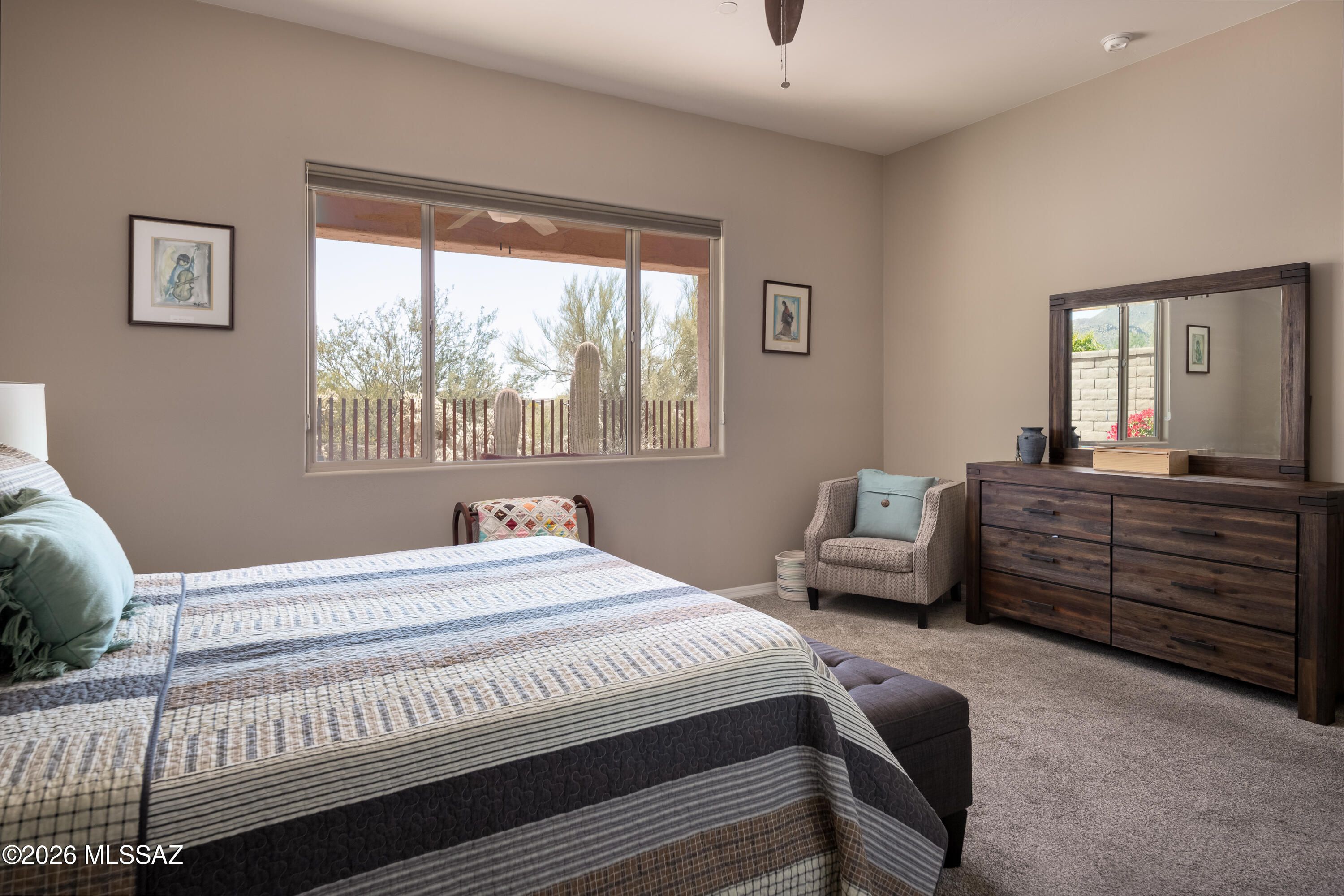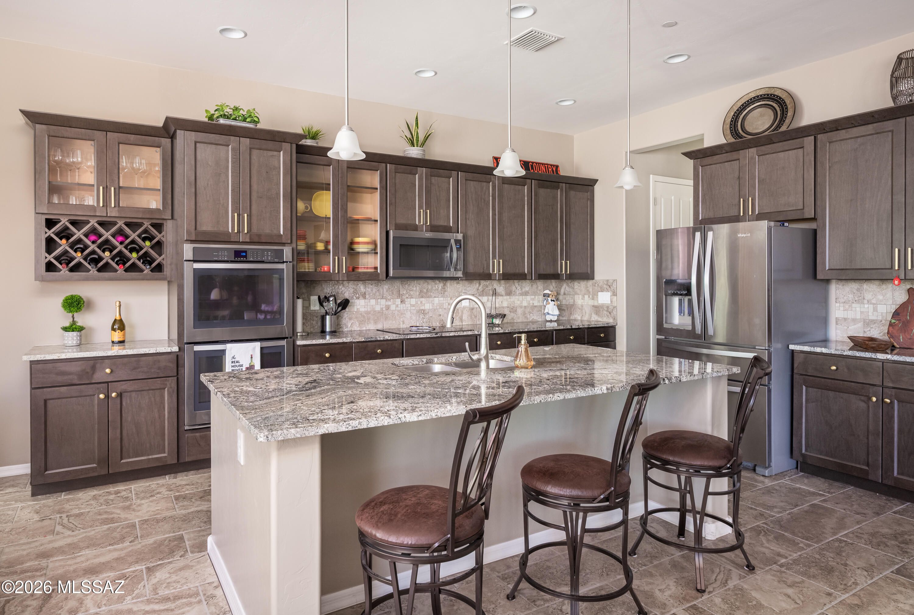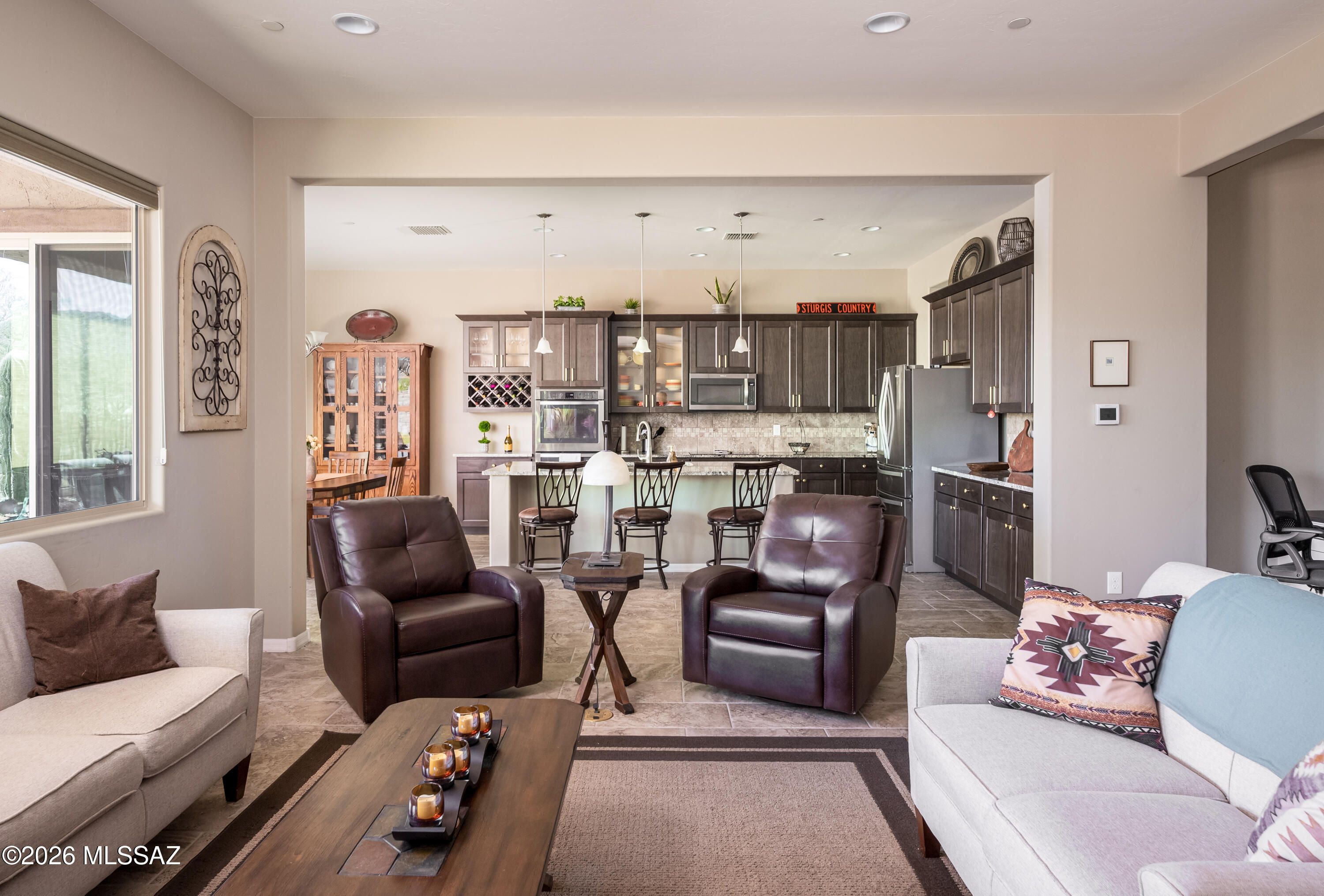 Enjoy spectacular sunrise views over the golf course from this beautifully designed home located in the desirable Los Saguaros community of Dove Mountain.This spacious residence features 3 bedrooms plus a dedicated office/den and a 3-car tandem garage, offering both flexibility and functionality. The thoughtfully designed open floor plan showcases tile flooring throughout the main living areas with comfortable carpet in the bedrooms, creating both durability and warmth where it matters most.The well-appointed kitchen is perfect for everyday living and entertaining, featuring double ovens, a cooktop, a natural stone island, and abundant cabinetry with soft-close doors and drawers, along with glass-front cabinet accents.