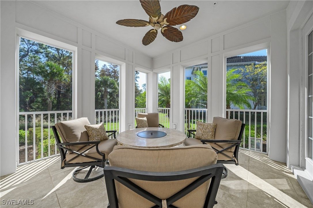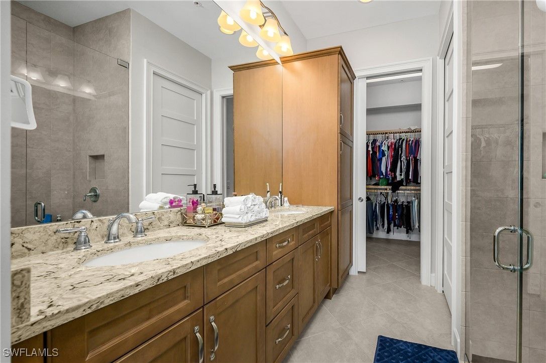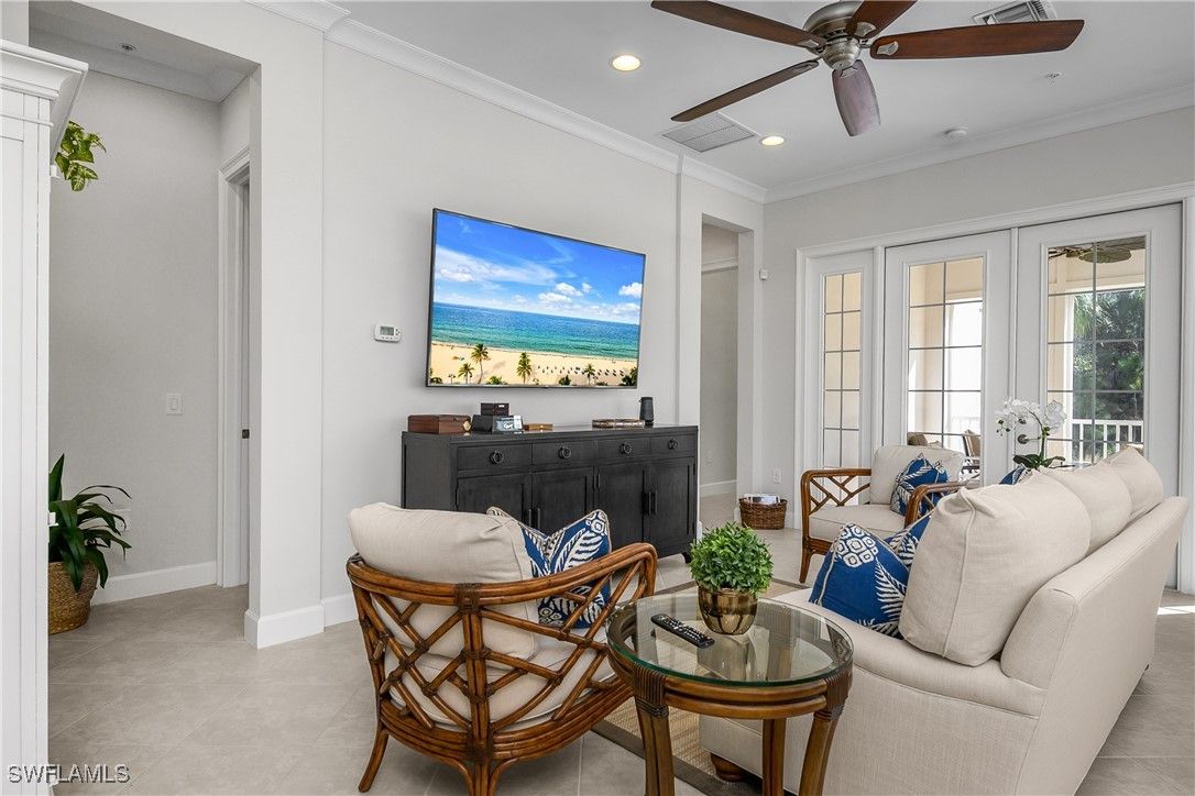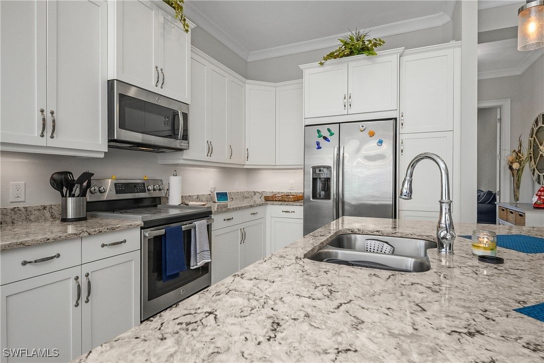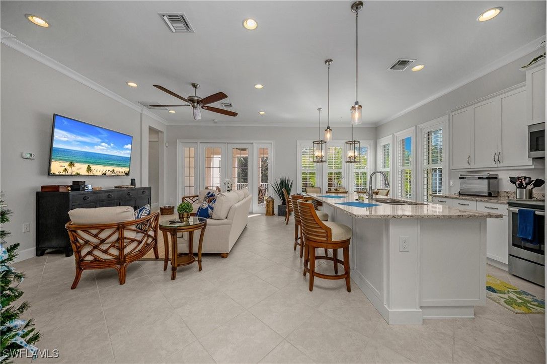 Welcome back to this ideal ground-floor coach home in The Isles of Collier Preserve, offering 1,621 sq. ft. of single-level living, featuring three bedrooms, two bathrooms, and a private, attached two-car garage. This garage is a dedicated enthusiast's space, featuring a durable epoxy floor and an installed lift (which stays), which strategically allows for the storage of a third vehicle and a golf cart while providing effortless, zero-step access. The highly functional open floor plan showcases premium aesthetics like plank-style porcelain tile, crown molding, quartz countertops, and impact-resistant windows. The spacious lanai is perfect for entertaining, accommodating dining for 6-8 guests while offering privacy and serene preserve views where abundant wildlife is your closest neighbor. Residents benefit from The Isles Club’s robust amenities, including the resort and lap pools, fitness center, 14 pickleball courts, and the on-site Overlook Bar & Grill, all strategically located adjacent to the National Pickleball Championship courts and less than five miles from Downtown Naples.