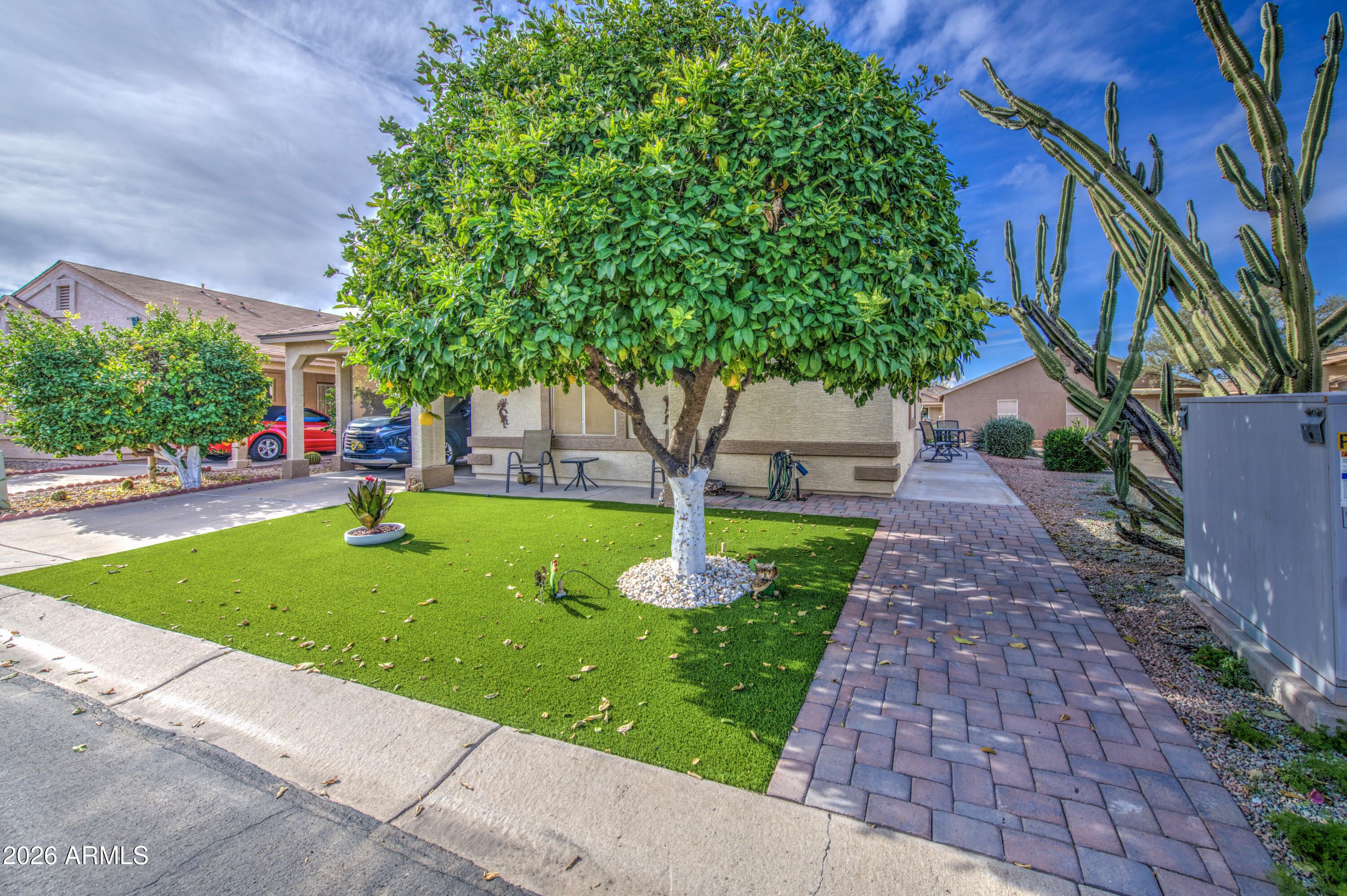 Welcome to AFFORDABLE resort style living! Tahoe model beautifully updated w/quartz counters, backsplash, soft close & dove tailed drawers, move in ready. REPLACED ROOF (7/22) , HVAC (12/ 2025) WATER HEATER. (12/24) .Curb appeal 3 FRUIT TREES walk outside and pick your fruit and ENJOY!, Golf cart garage is currently a workshop but seller will convert. back patio can house cart w/ sun shades & is totally covered & protected (also cover for it). Relax on your extended covered patio or meet at the on-site restaurant. SunBird offers golf, pickle ball, tennis, swimming, fitness center, library, billiards, social clubs, dance pavillion, & more! A FRIENDLY 55+ community where every day feels like vacation; FUN AND FULL OF LIFE RESIDENTS! FOR FULL PRICE OFFER GOLF CART CONVEYS