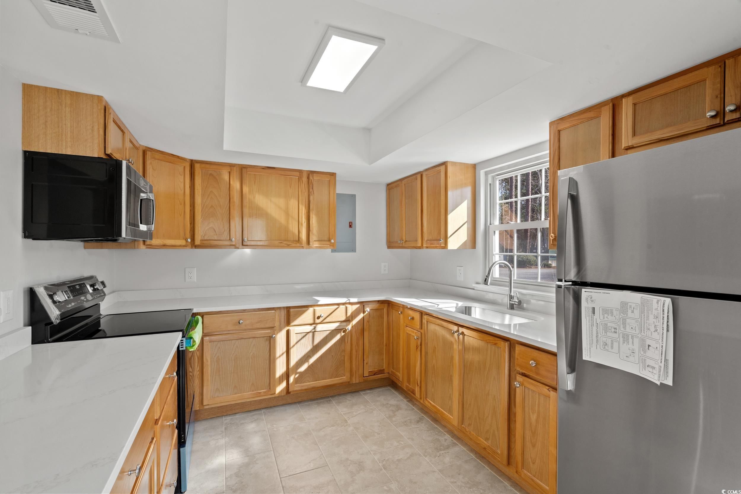Welcome to 6554 Laguna Point - a beautifully renovated 2-bedroom, 1-bath home situated on a corner lot within the desirable Myrtle Beach Golf & Yacht Club community. This home features a living/dining combo, a spacious kitchen, and a large back deck ideal for outdoor enjoyment. Since November 2025, the home has undergone an extensive, high-quality renovation. Major upgrades include a brand-new HVAC system, new laminate flooring professionally installed by Flooring Plus of Murrells Inlet throughout the living areas, bedrooms, and hallways, and new tile flooring in the kitchen and bathroom. The kitchen has been fully updated with new stainless steel appliances, new cabinetry, and new granite countertops professionally installed by Granite Quarry Direct, along with a large single-bowl sink and new faucet. The bathroom has been refreshed with a new bathtub/shower combo, new vanity and sink, and updated fixtures. Additional improvements include new interior doors, all new lighting and ceiling fans, smoothed and freshly painted ceilings, and fresh paint throughout the entire home. Located in a gated community offering an outdoor pool, tennis courts, and additional amenities, this property is an excellent option as a primary residence, second home near the beach, or investment property. Less than 5 minutes from the Intracoastal Waterway and approximately 15 minutes to Surfside Beach, the home is conveniently close to shopping, dining, and coastal attractions. This move-in-ready home offers peace of mind, quality craftsmanship, and modern style. Schedule your showing today!