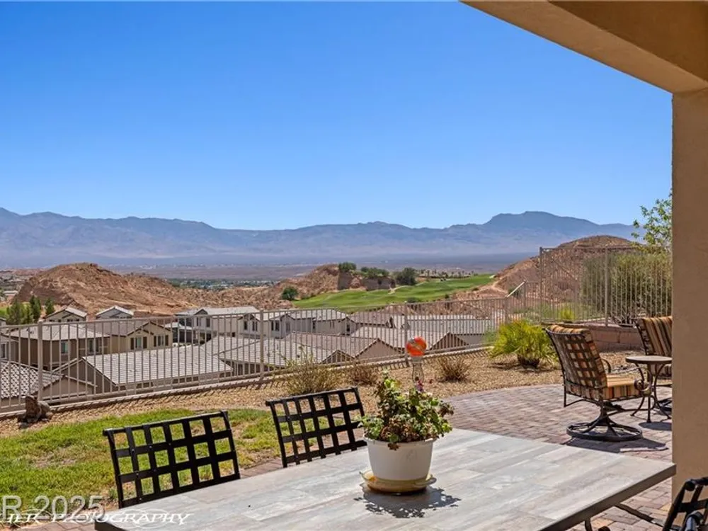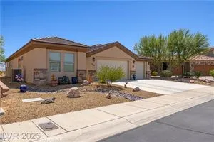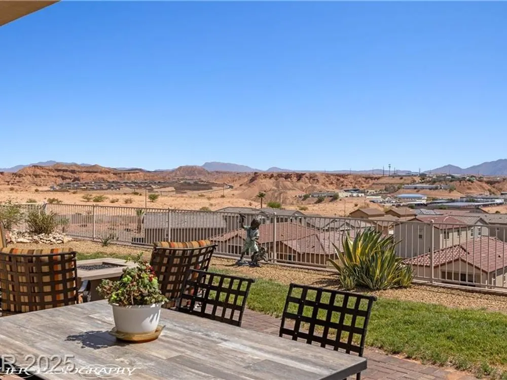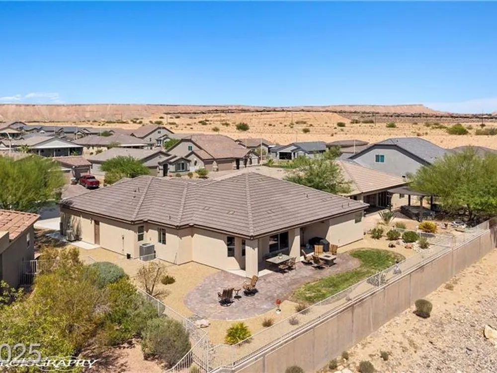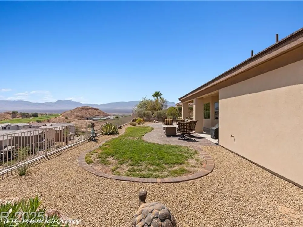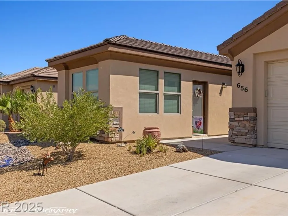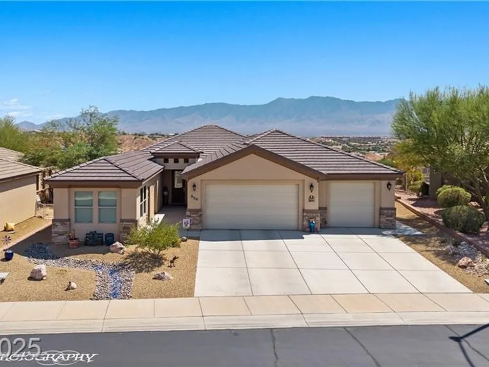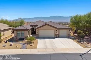 Welcome to 656 Shadow Ridge in the 55+ gated community of Shadow Crest! This beautiful 3BR, 3BA home with a 3-car garage sits on a .21-acre lot and offers panoramic views of the NV, AZ & UT mountains, the Oasis Golf Course, valley & city lights. Built in 2021 with quality 4x6 construction, the open concept floor plan includes a spacious den plus an additional office/work space. A highlight is the 240 sf attached casita featuring its own bedroom, bath, kitchenette & walk-in closet-perfect for guests or multi-gen living. Interior features include tile and carpet flooring, custom cabinets, stainless appliances, and a primary suite with a garden tub and walk-in shower. Epoxy-coated garage floors add durability and style. The fully fenced backyard with desert and lawn landscaping creates the perfect setting to relax and enjoy the views.
