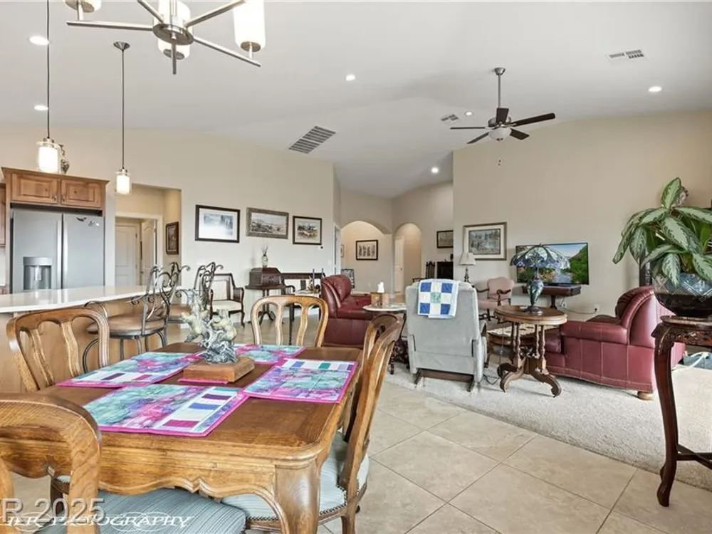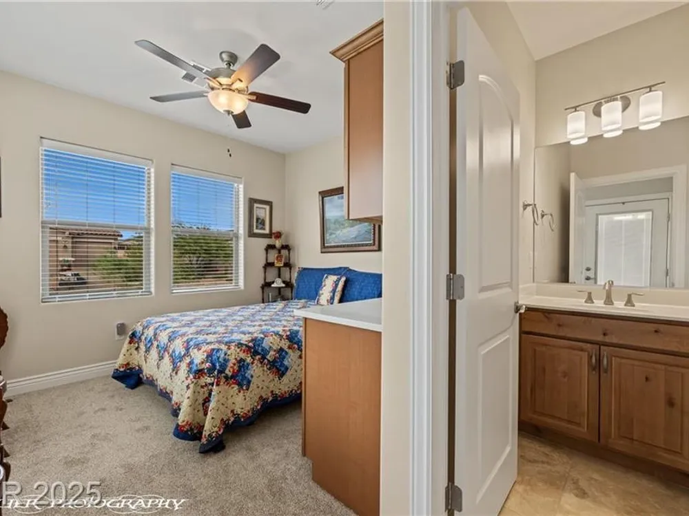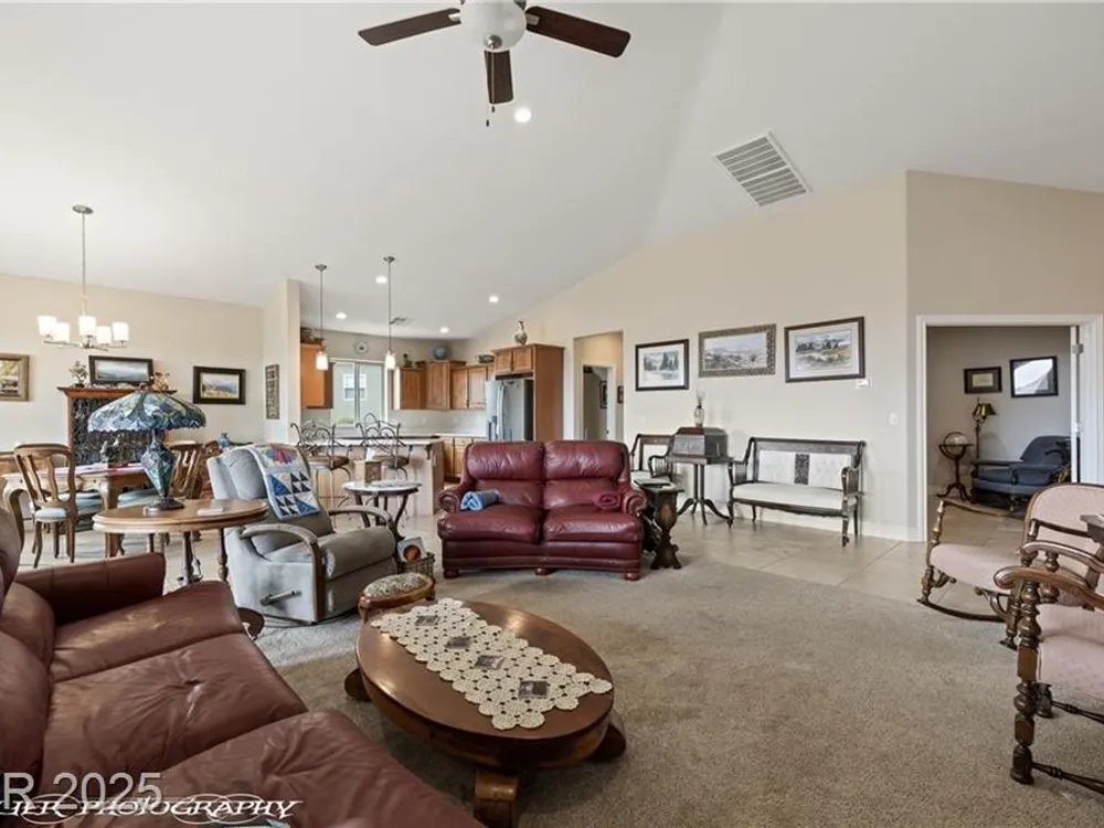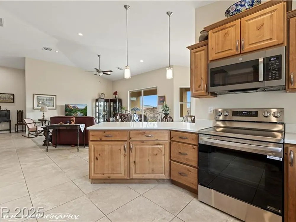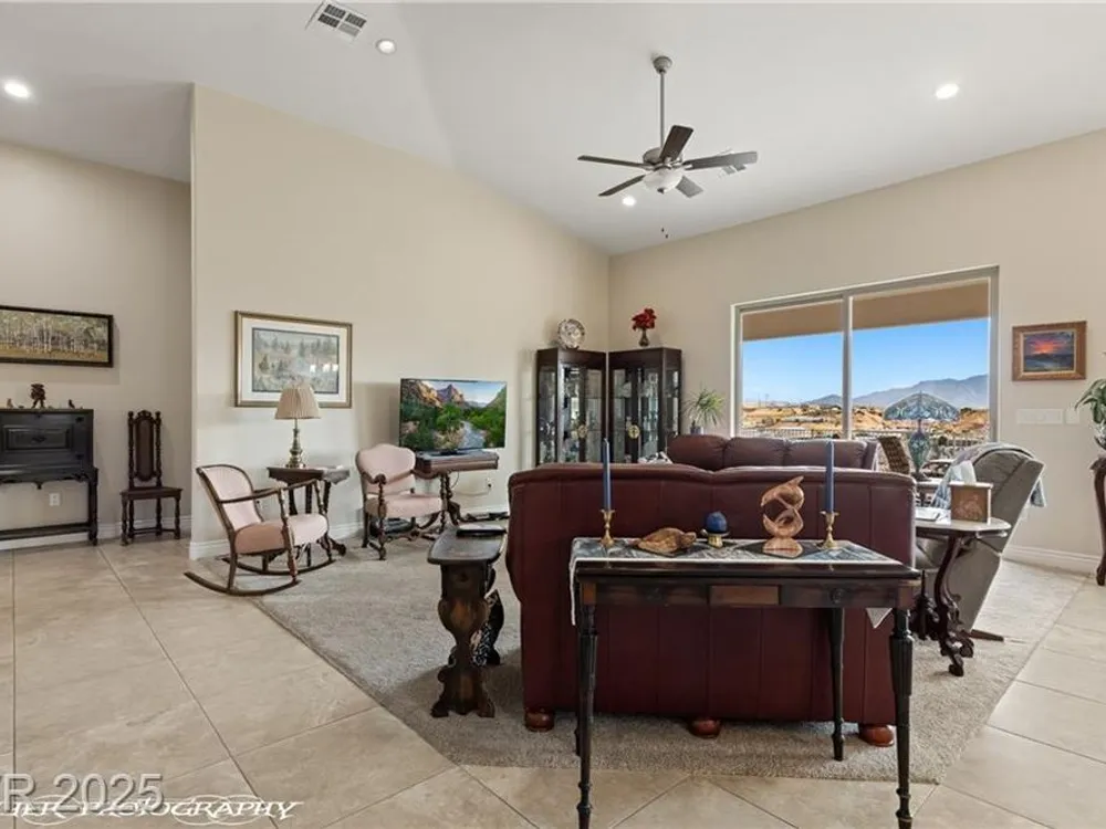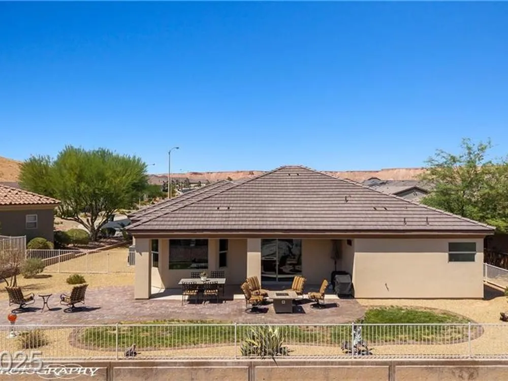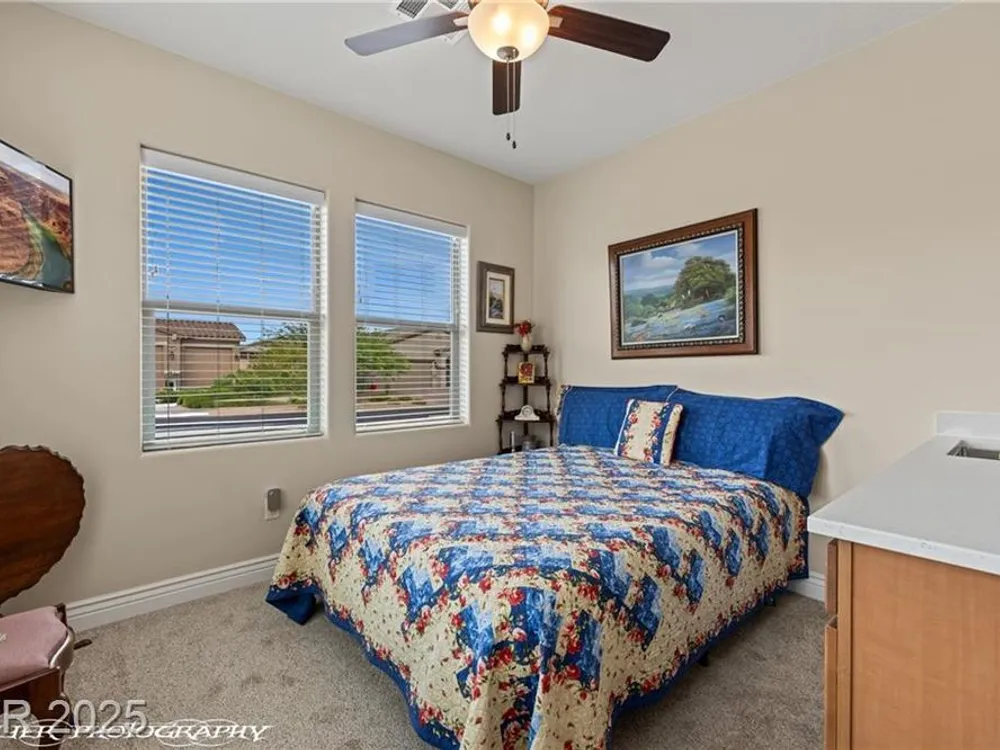 Welcome to 656 Shadow Ridge in the 55+ gated community of Shadow Crest! This beautiful 3BR, 3BA home with a 3-car garage sits on a .21-acre lot and offers panoramic views of the NV, AZ & UT mountains, the Oasis Golf Course, valley & city lights. Built in 2021 with quality 4x6 construction, the open concept floor plan includes a spacious den plus an additional office/work space. A highlight is the 240 sf attached casita featuring its own bedroom, bath, kitchenette & walk-in closet-perfect for guests or multi-gen living. Interior features include tile and carpet flooring, custom cabinets, stainless appliances, and a primary suite with a garden tub and walk-in shower. Epoxy-coated garage floors add durability and style. The fully fenced backyard with desert and lawn landscaping creates the perfect setting to relax and enjoy the views.
