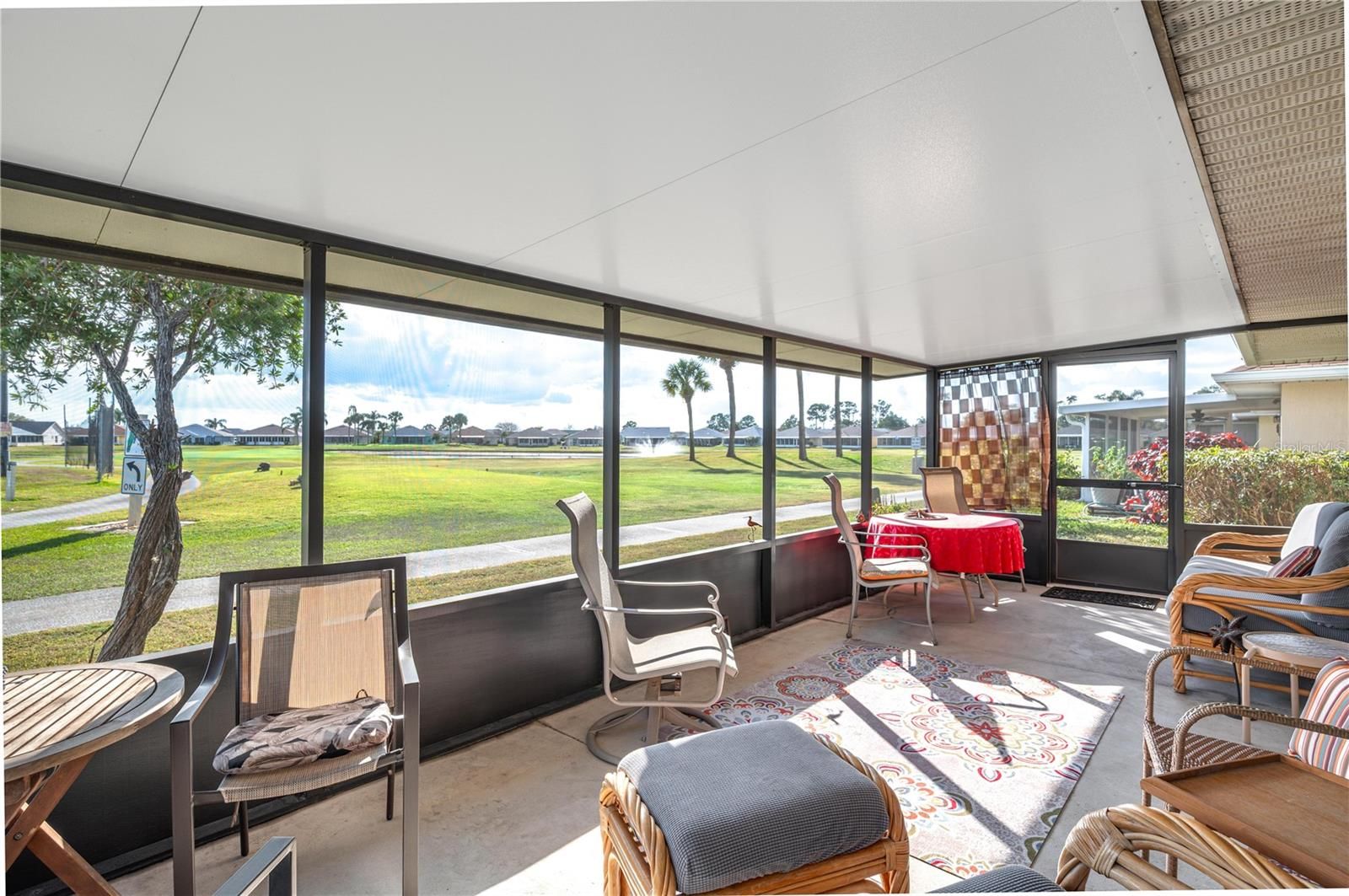 Welcome to Lake Henry Estates, a beautiful gated retirement community in Haines City! This 2br/2ba home has so many extras and no rear neighbors. Selling furnished. Enter this home through the front screened porch into the foyer with a coat closet. The large great room, with a vaulted ceiling and plant shelves, is open into the dining room and kitchen. The dining room has a tray ceiling that continues to make the home feel even roomier. The kitchen has two windows to let in natural light with one even having a garden window for your plants and herbs. There is a pass through into the Florida room plus a breakfast bar looking into the dining rm and living rm. The primary bedroom has a tray ceiling too along with a walk-in closet, linen closet, dual sinks, garden tub and separate shower. The front bedroom has a wonderful pop out window that brings in a lot of light. You can get to the Florida rm from both the primary bedroom and the great room. The screened room on the back of home allows for a restful place to watch the golfers as they come up to play the 7th hole. Washer/dryer hookup is in the garage. The garage also has sliding screen doors. Roof replace in 2024 and a/c in 2025. Lake Henry Estates has many things to do between the clubhouse, pickle ball, tennis courts, craft room, workshop etc. Close to shopping, medical and restaurants too.