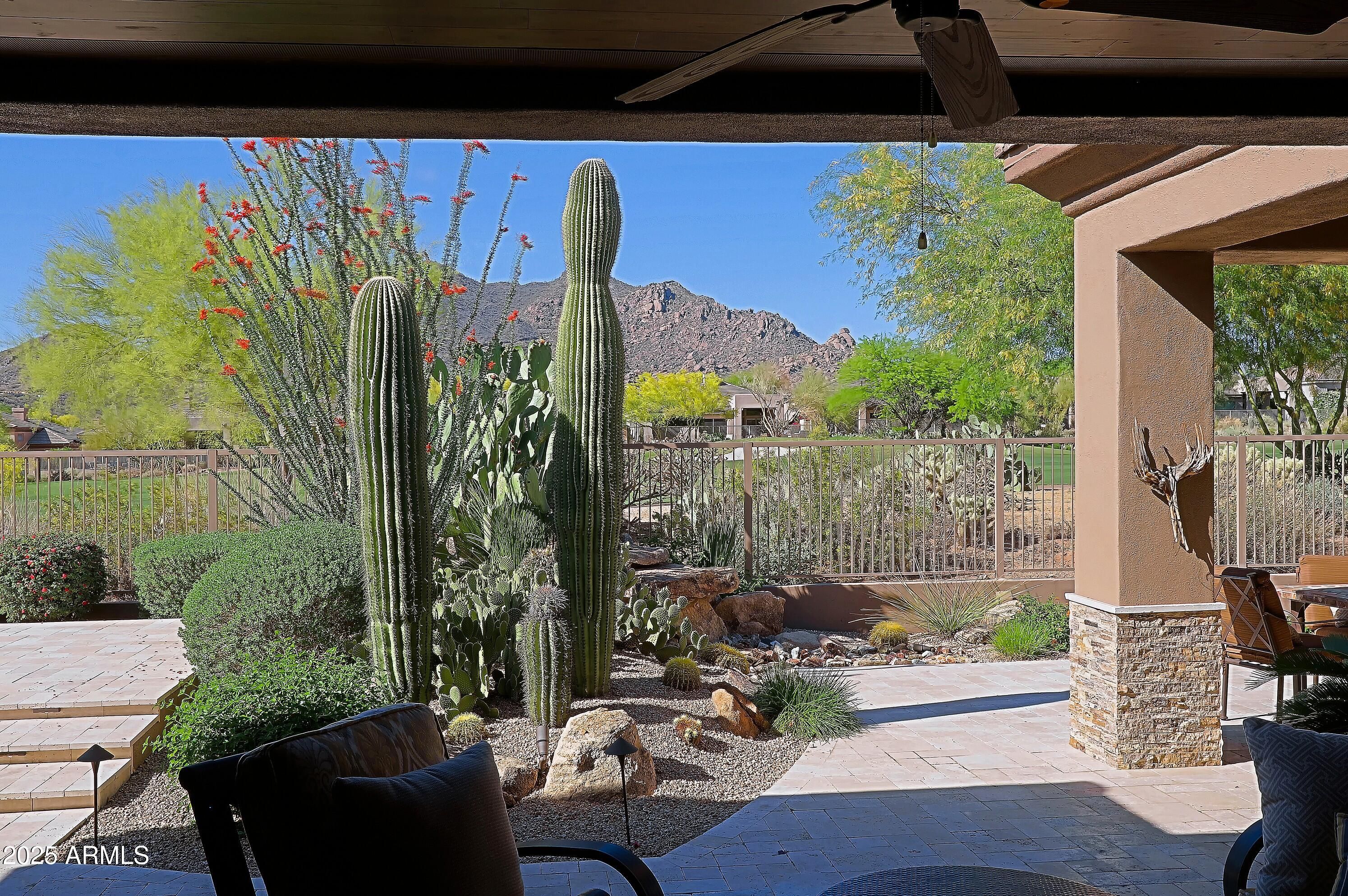 Terravita Aurora model on spectacular lot with fairway and Black Mountain views. Professionally landscaped front and back. Three bedrooms, 2.5 baths, den/study and 3 car garage. Backyard paradise! Walkway to front entrance through large door with top and side windows. An abundance of light and views greet you entering this lovely and well-maintained home. Travertine and carpet flooring. Living room and formal dining room are open to backyard views and door to patio. Den/study off entrance. Powder room also off entrance. Kitchen, breakfast nook and great room surrounded by windows and amazing views. Kitchen has island with sink and stacked stone front. Gas cooking top and wall microwave/oven. Primary bedroom and bathroom split from two additional bedrooms and bathroom. Primary is oversized with seating area and again - views and door to its own covered patio area. Trayed ceiling. Bathroom has dual vanities and large raised soaking tub. Walk-in shower. Walk-in closet. Separate two bedrooms have hallway with large linen closet and bath has dual vanities and tub/shower combo. Oversized laundry with sink and folding counter. Cabinets above appliances. Access to garage. Backyard - two covered patio areas both with tongue groove wood ceilings. Rock formations and matured plants. Travertine Versailles pattern flooring. Outdoor kitchen with seating area. Raised seating area with stacked stone fireplace. Again - Fairway and Black Mountain views. Stunning views! Large, well-maintained home! Perfect lot! A Terravita gem!