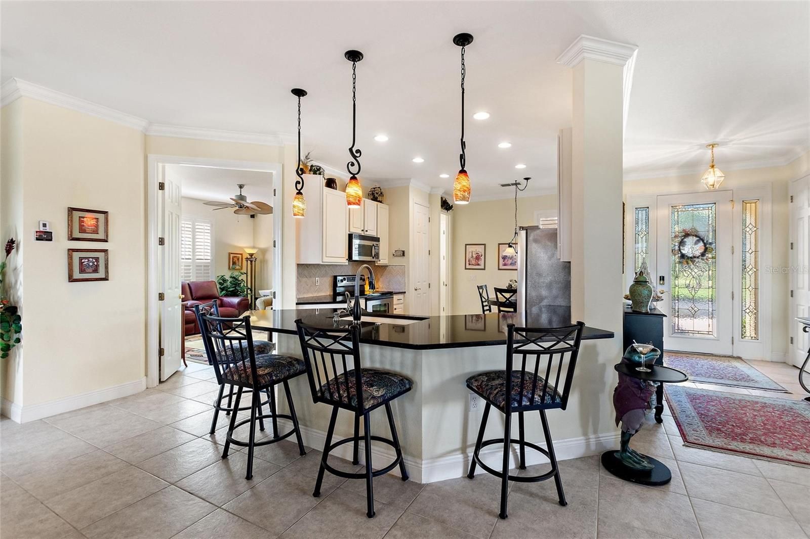 Welcome to your new Solivita home! This well maintained Savoy model has outstanding CURB APPEAL with upgraded landscaping and lighting, ample upgrades and an ideal location along the desirable Glendora/Shorehaven water corridor. Enjoy both the expansive water view from the comfort of your 16'x24' COVERED, TILED LANAI or the conservation view from your front porch..no front neighbors across the street! An added bonus is a COMMUNITY POOL just a short walk away. Stepping inside the home via the impressive leaded glass door with sidelights, you notice the the large welcoming great room, along with the quality tile and the crown molding. The home also boasts ceiling fans and plantation shutters throughout. The kitchen counters are black quartz and are accented with plenty of elegant white cabinets and stainless steel appliances. A patterned tile backsplash adds to the overall elegance of the kitchen. A brand new WATER FILTRATION system was installed in 2025, the HVAC was replaced in 2025, the ELECTRICAL SERVICE was upgraded in 2025, a new hot water heater was recently installed, the Interior was recently painted and the roof was replaced in 2016. The garage has a workbench for those home projects and the garage floor had a premium Sharkcoat coating installed in 2025. Arrange your showing of this outstanding home within Solivita’s dynamic 55+ community today! With amenities such as 14 pools, 2 championship 18-hole golf courses, tennis, pickle-ball, basketball, softball, and over 240 clubs, plus spa services and two state-of-the-art exercise facilities spread across 4,200 acres of conservation, you'll have everything you need at your fingertips. Enjoy additional perks such as landscaping, irrigation, high-speed fiber internet, and TV included in the HOA. For your convenience, HCA Florida Poinciana Hospital is directly across the street along with a 42,000 square-foot medical office building. Also recently opened across the street is the new Poinciana Lakes Plaza. Here are some of the stores that have already opened or will be opening soon: Sprouts Farmers Market, Petco, Rack Room Shoes, 5 Below, Ulta, TJ Maxx, Ross, Burlington, TD Bank, Outback Steak House, First Watch Restaurant, Five Guys, Popeye's, Bojangles, Coldstone; along with current Walgreens, Wells Fargo, Little Caesars, McDonald's and more! Please do not hesitate to come see this gorgeous home and perhaps make it YOUR new Solivita home!