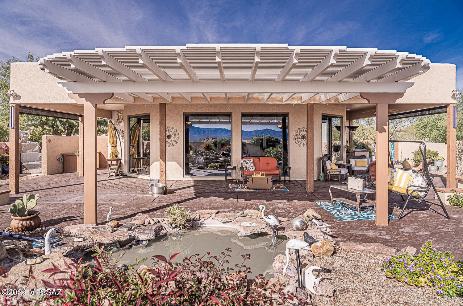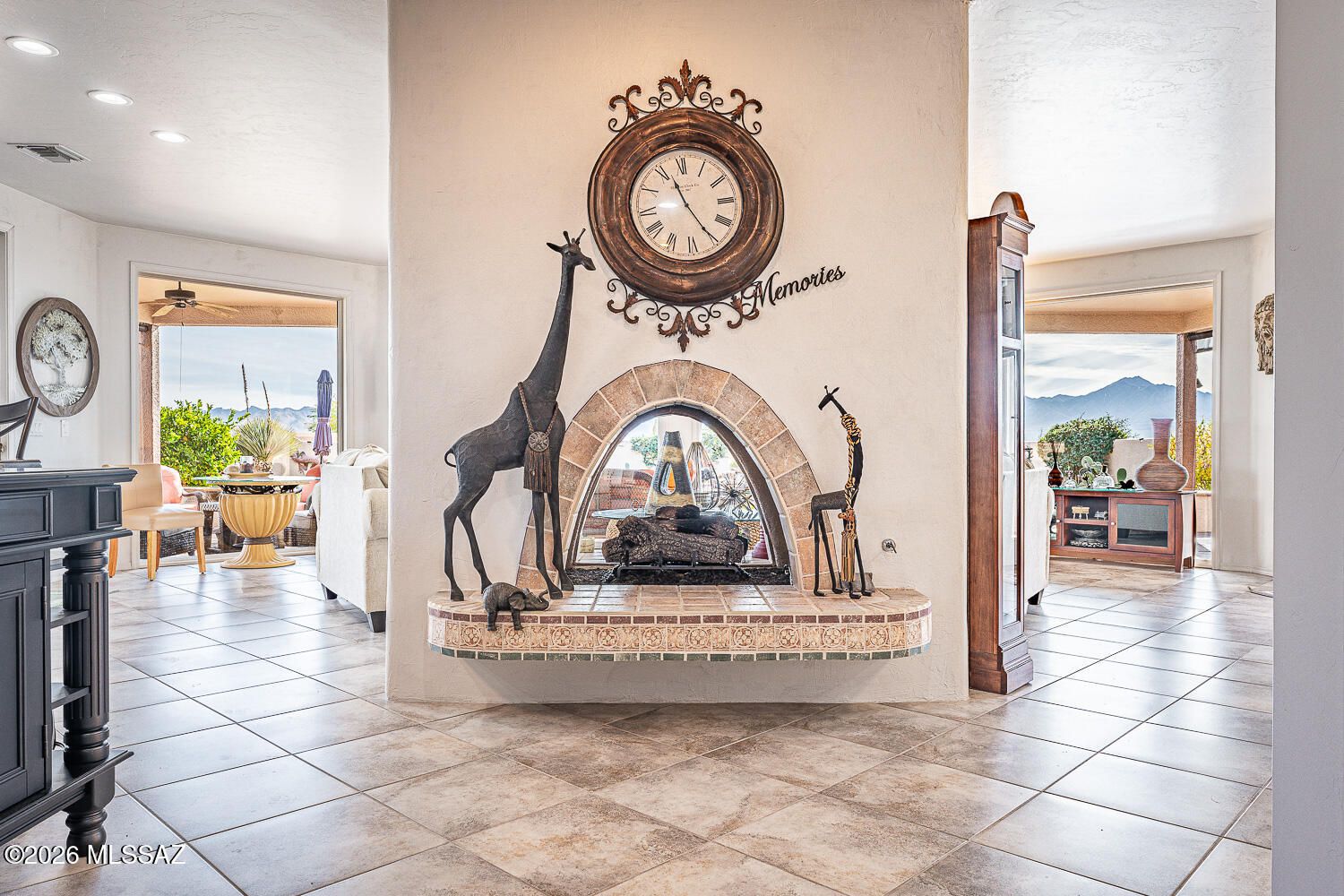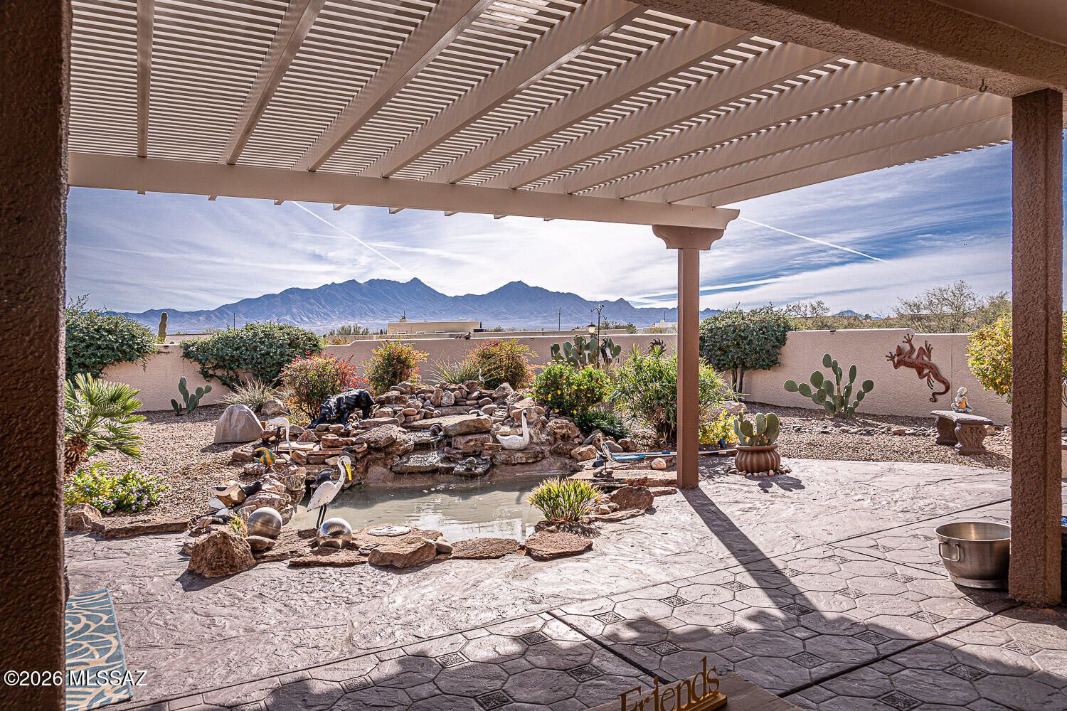 Spectacular mountain views define this highly desireable home, ideally situated at the end of a quiet cul-de-sac. Step inside to a welcoming elongated hallway that leads to a striking double-sided fireplace, seamlessly connecting the kitchen on one side and a cozy TV room on the other. Beyond, the formal living room is framed by floor-to-ceiling windows, flooding the space with natural light and perfectly capturing the breathtaking mountain vistas. Outdoor living is just as impressive, featuring a side bar area, ideal for entertaining and spacious covered back patio designed for exquisite indoor-outdoor living. A tranquil fountain adds soothing water sounds, creating a peaceful retreat perfect for relaxing or hosting guests. Some furniture available by SBOF.
