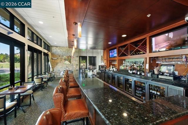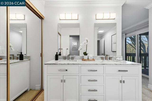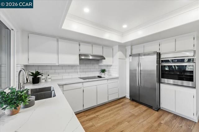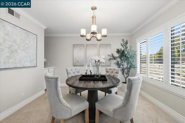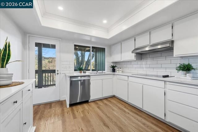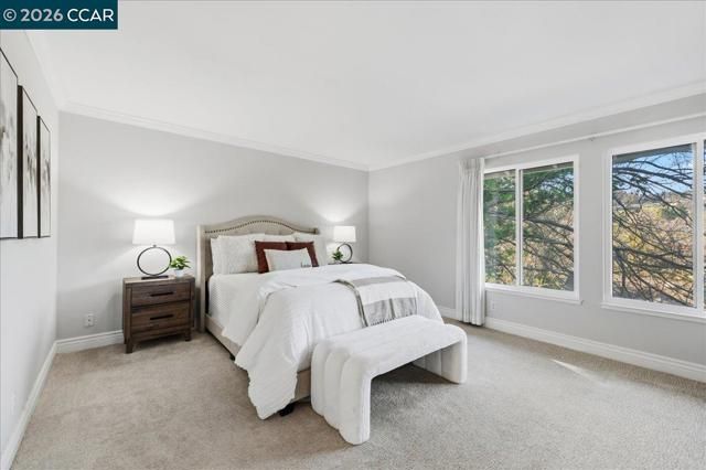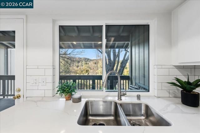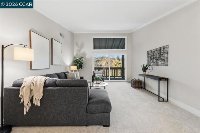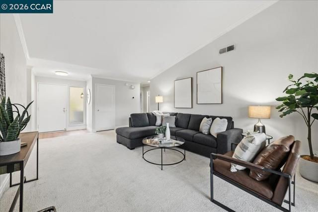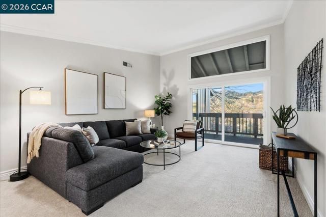 Experience the best of the SF Bay Area’s age 55+ active adult living in this beautifully updated upper-level Sierra model, perfectly nestled in the heart of Rossmoor’s serene landscape. This home blends modern interior elegance with a tranquil setting. As you step inside, you are greeted by a bright and sophisticated space featuring smooth vaulted ceilings, elegant crown molding, and dual-pane windows that flood the rooms with natural light. The kitchen features sleek quartz countertops, a classic subway tile backsplash, and stainless steel appliances. The space is further enhanced by a stylish coffered ceiling with recessed lighting, and the stainless steel double sink is perfectly positioned to offer a fantastic view of the surrounding hills and trees while you work. Practicality meets luxury throughout the home, from the mirrored closet doors to the dedicated utility room equipped with a full-sized washer and dryer. Enjoy a three-year-old HVAC system and a newer electric water heater. The bathrooms have been thoughtfully modernized; the primary bath features a relaxing step-in jetted tub, while the guest bath has a large walk-in stall shower, quartz counters, newer cabinetry, and a modern electric bidet. Enjoy sylvan, wooded views from your SW-facing balcony.