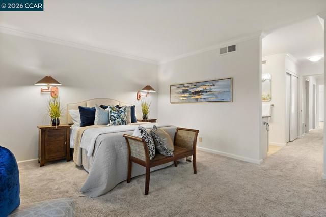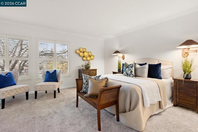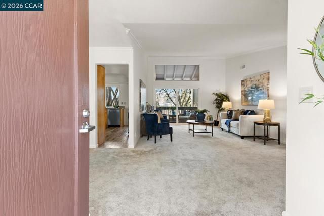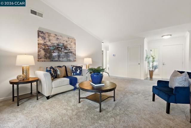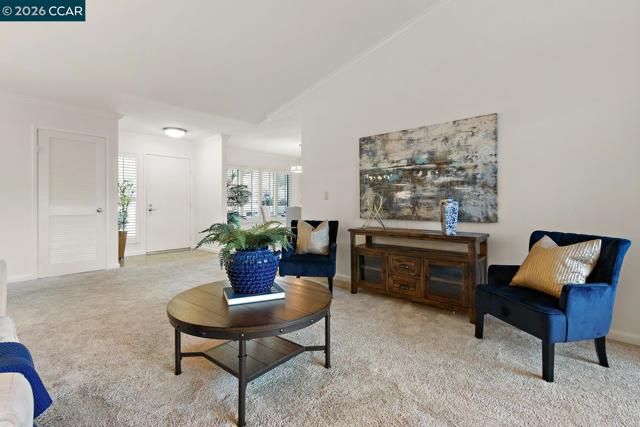 Beautiful updated upper-level Sierra condo. Bright and spacious. Vaulted ceilings. New interior paint. Large two bedrooms with good size closets. Large balcony with pleasant views. Newer dual pane windows. Newer heater & A/C. Newer carpet. Crown molding throughout. Windows & patio shutters. Recessed lighting. Double sink vanity in master bath. Three rooms access to large balcony. One car garage & secure storage. Newer side door into garage (next to steps). Level short walk to Creekside clubhouse, Event Center, golf course, pickleball courts, restaurant. This condo is located in the gated Rossmoor active adult community 55+. This beautiful home is ready for you!