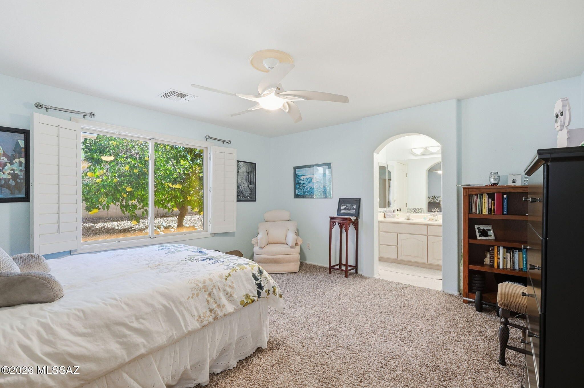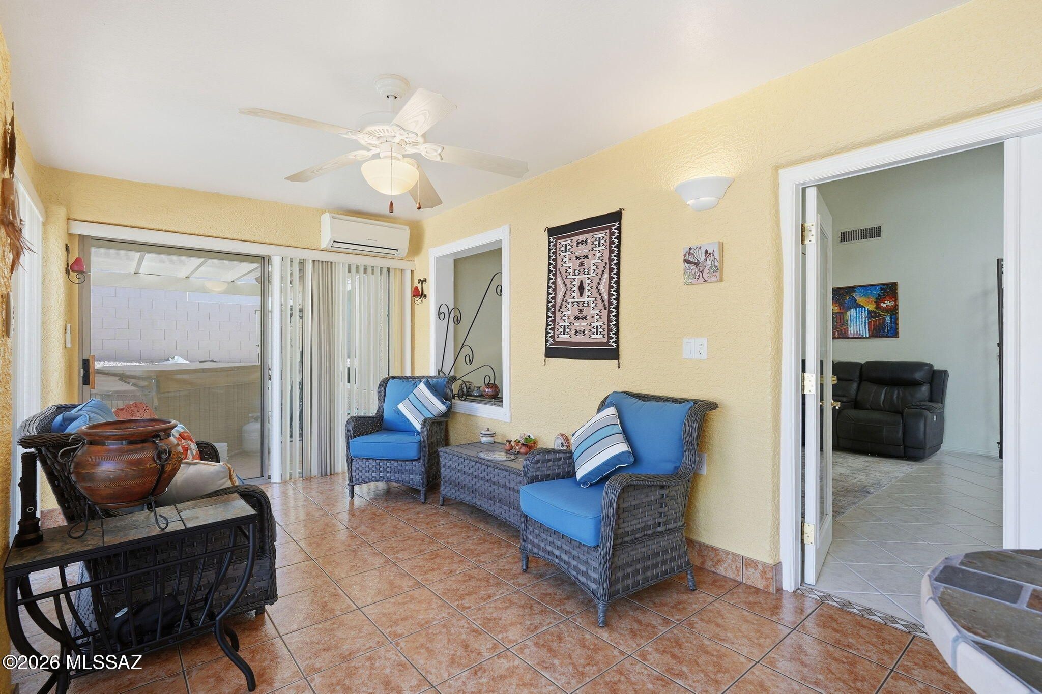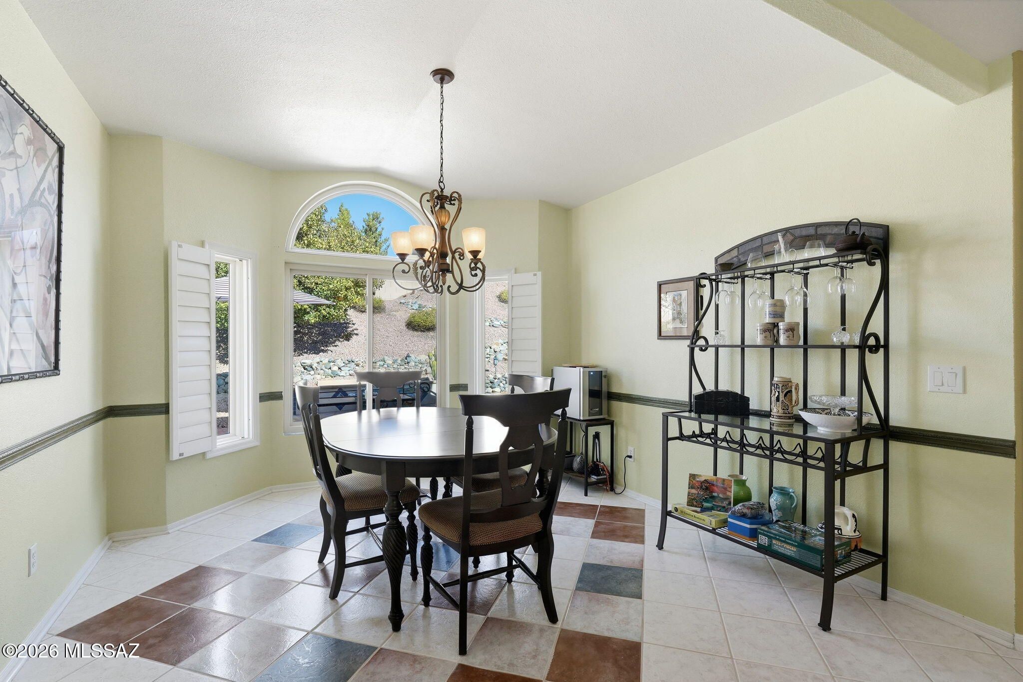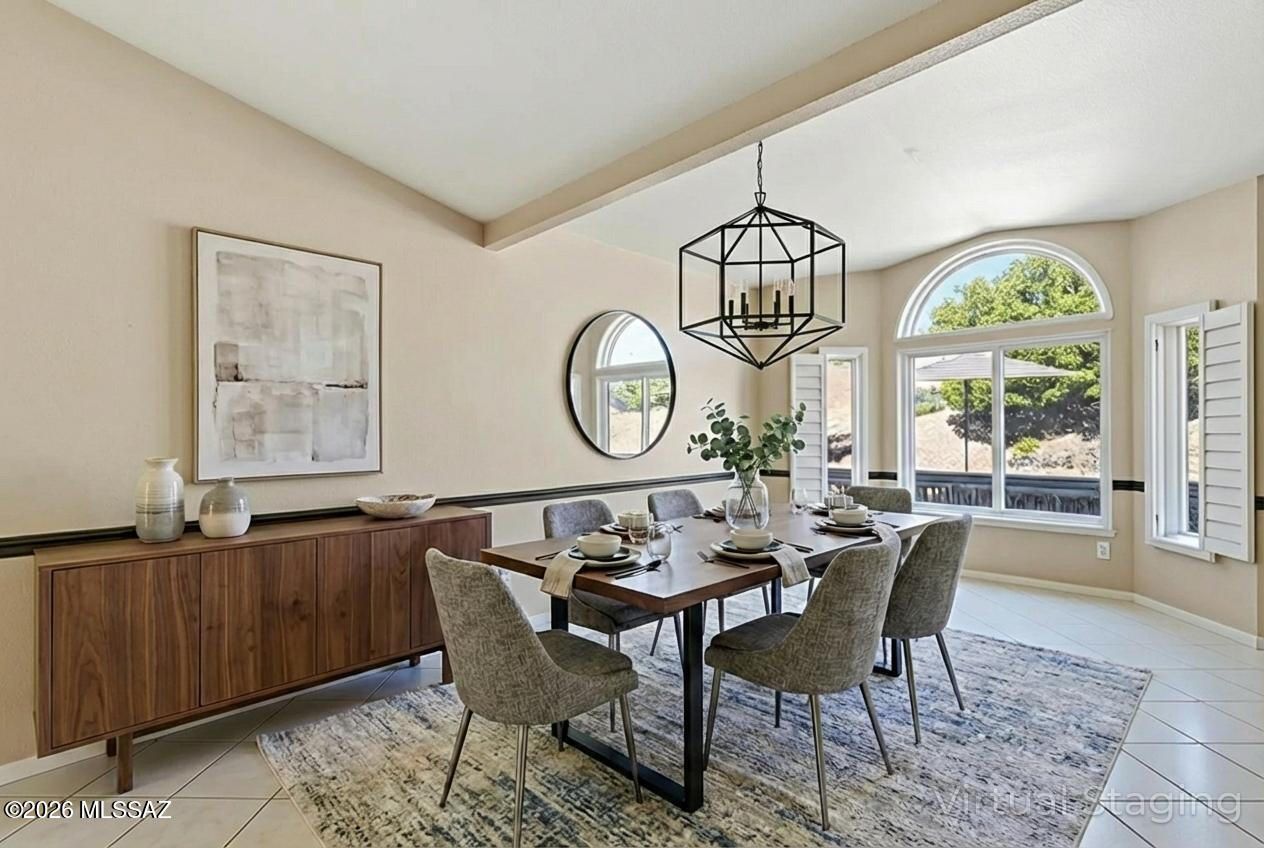 Expanded Diego with upgrades throughout. Bright, open kitchen features slab granite counters, stainless appliances, undermount sink, pantry cabinet, pullouts, breakfast bar, and expanded dining area with arched window--perfect for sipping your morning coffee. Family room with vaulted ceiling plus separate living room ideal for entertaining. Spacious primary suite with walk in closet. Large guest bedroom w/ensuite. 150 sq. ft. Arizona room w/ mini-split and tile flooring (not included in 1,912 sq. ft.). Plantation shutters, solar tubes, sunscreens, custom tile accents, and laundry with storage. Resort-style yard with aluminum ramada, flagstone patio, water feature, citrus trees, and retractable awning. Garage w/epoxy floors, loads of storage, and utility sink. Hot H2O tank 2024, HVAC 2018