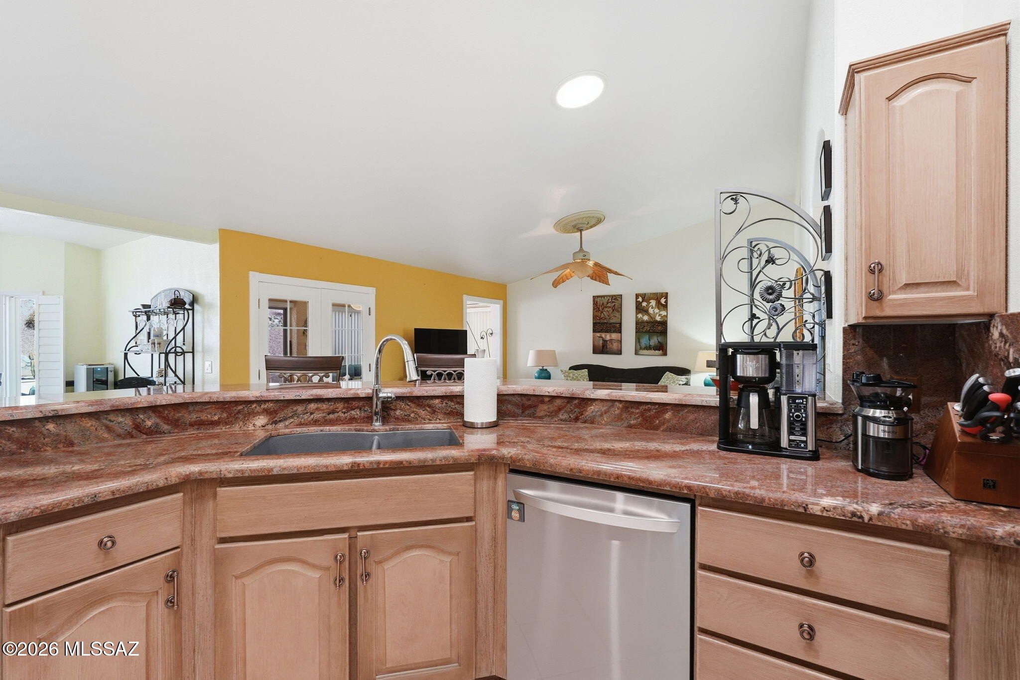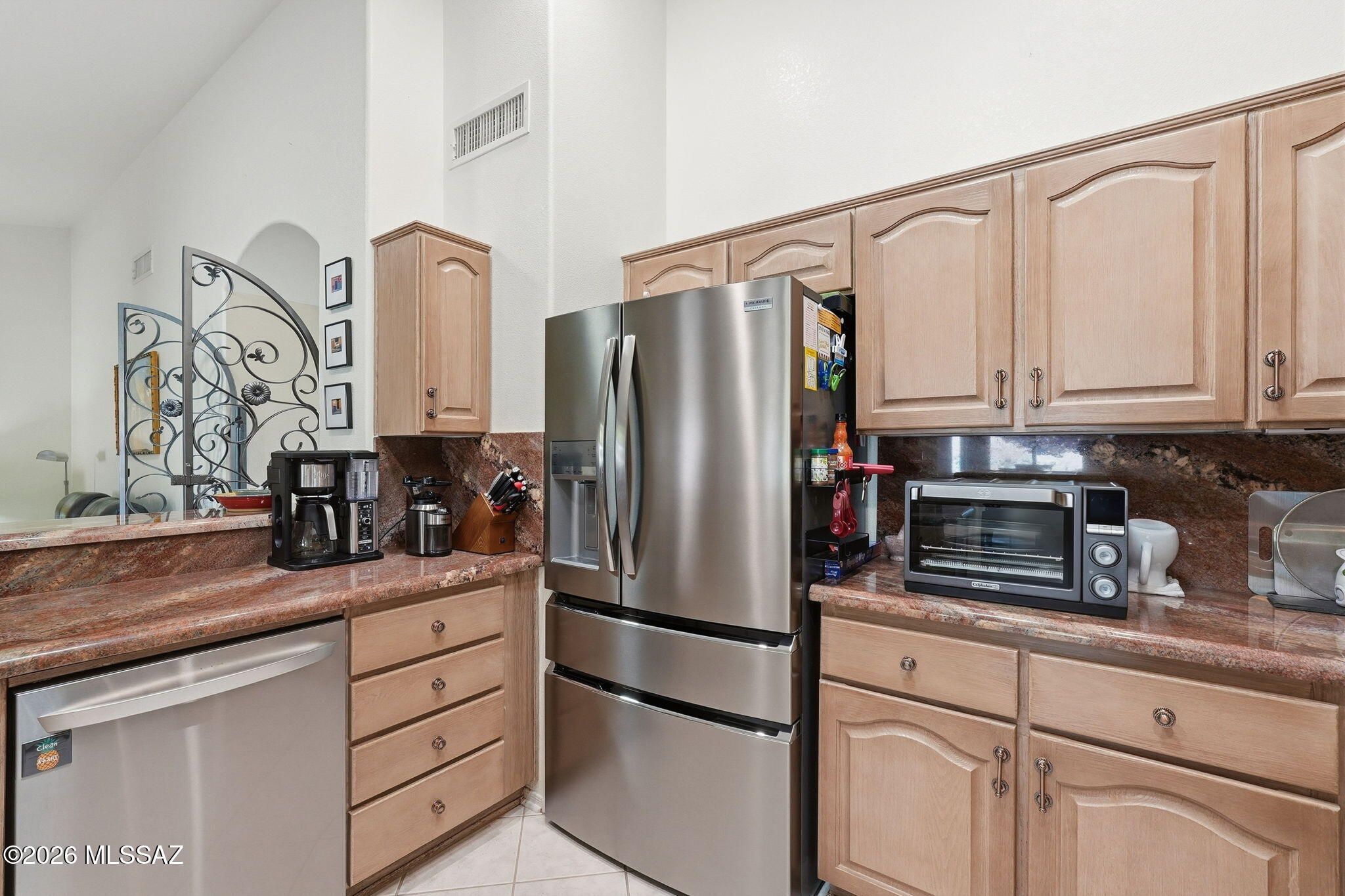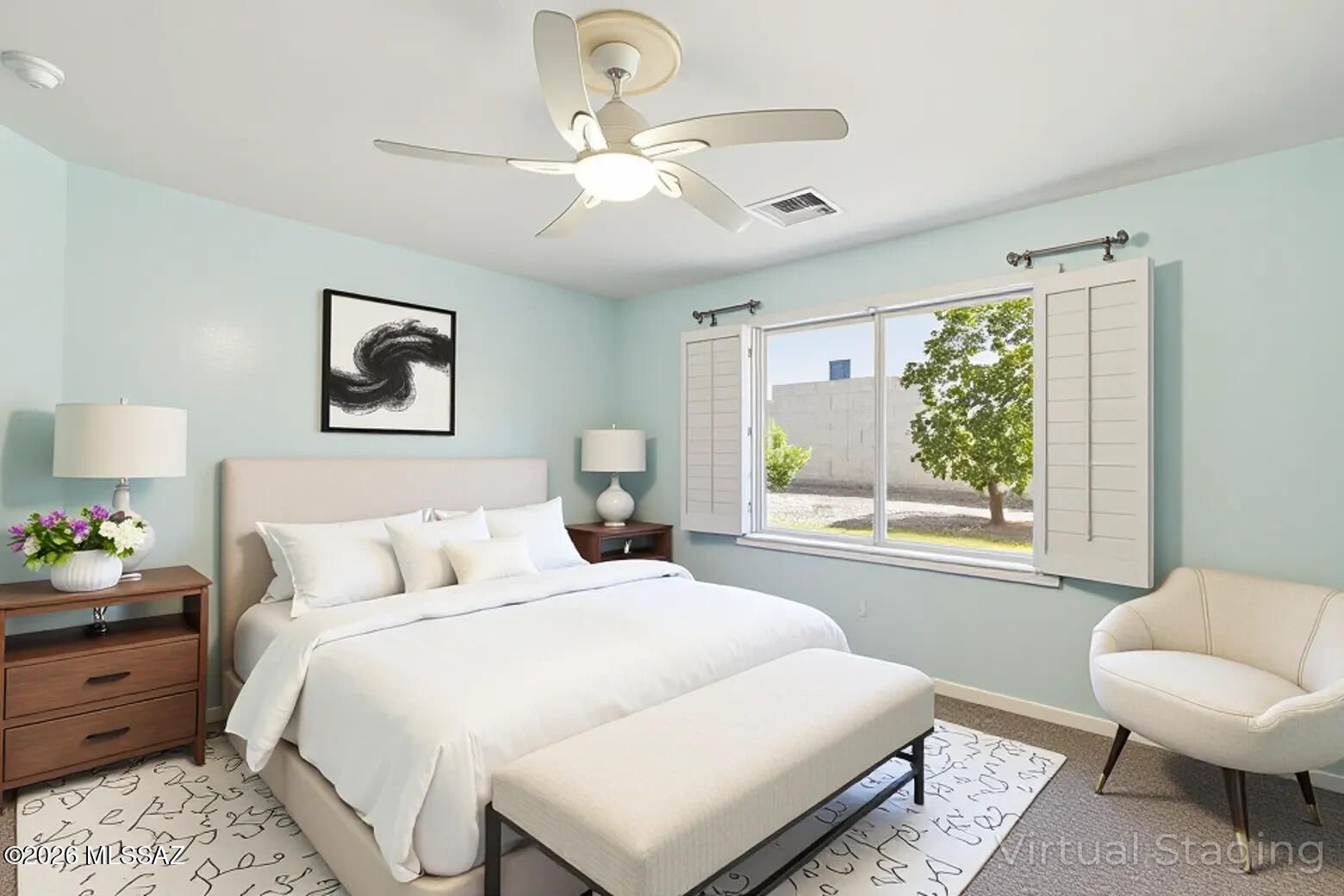 Expanded Diego with upgrades throughout. Bright, open kitchen features slab granite counters, stainless appliances, undermount sink, pantry cabinet, pullouts, breakfast bar, and expanded dining area with arched window--perfect for sipping your morning coffee. Family room with vaulted ceiling plus separate living room ideal for entertaining. Spacious primary suite with walk in closet. Large guest bedroom w/ensuite. 150 sq. ft. Arizona room w/ mini-split and tile flooring (not included in 1,912 sq. ft.). Plantation shutters, solar tubes, sunscreens, custom tile accents, and laundry with storage. Resort-style yard with aluminum ramada, flagstone patio, water feature, citrus trees, and retractable awning. Garage w/epoxy floors, loads of storage, and utility sink. Hot H2O tank 2024, HVAC 2018