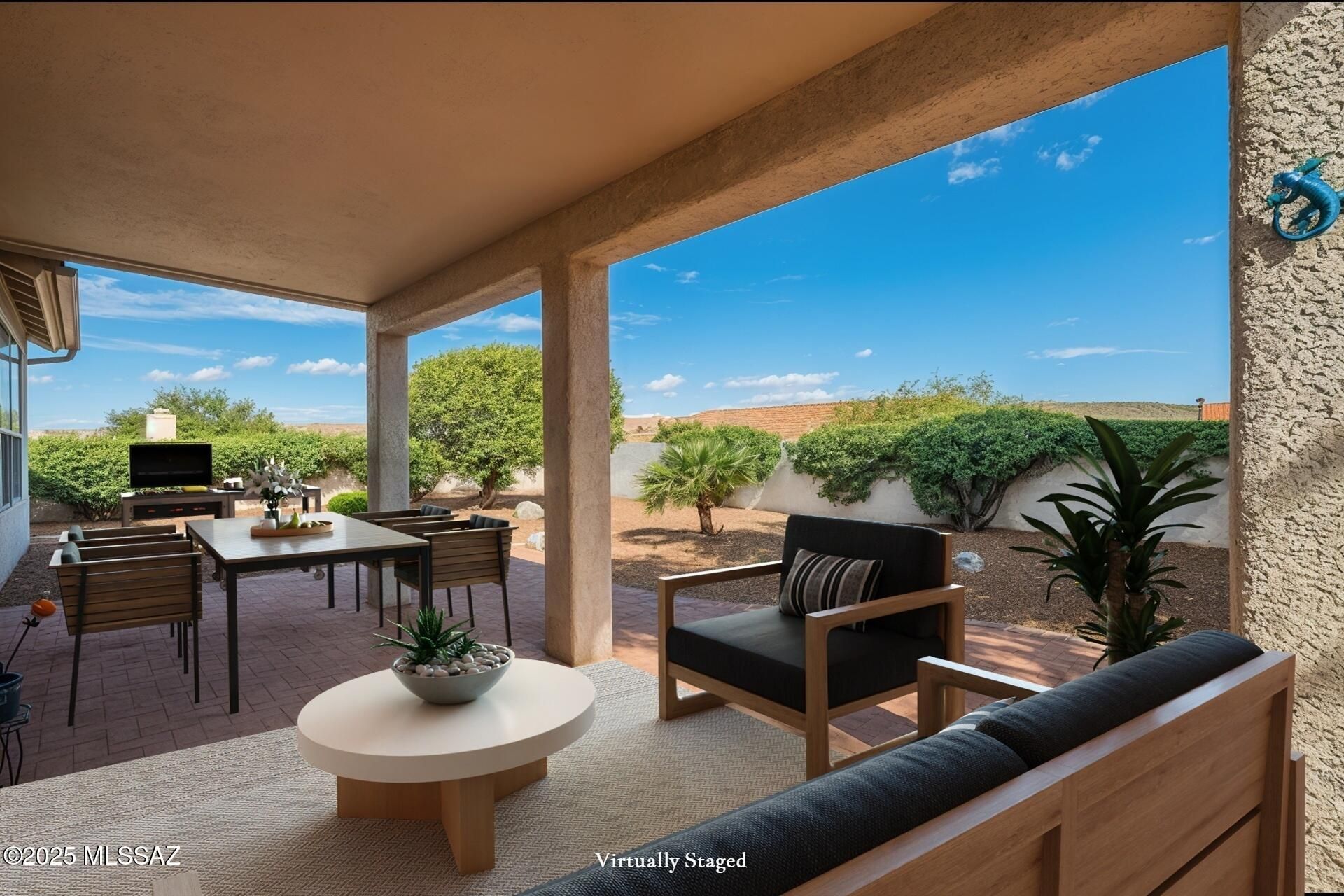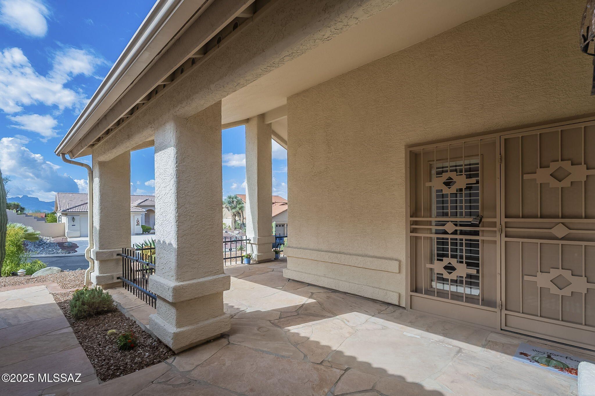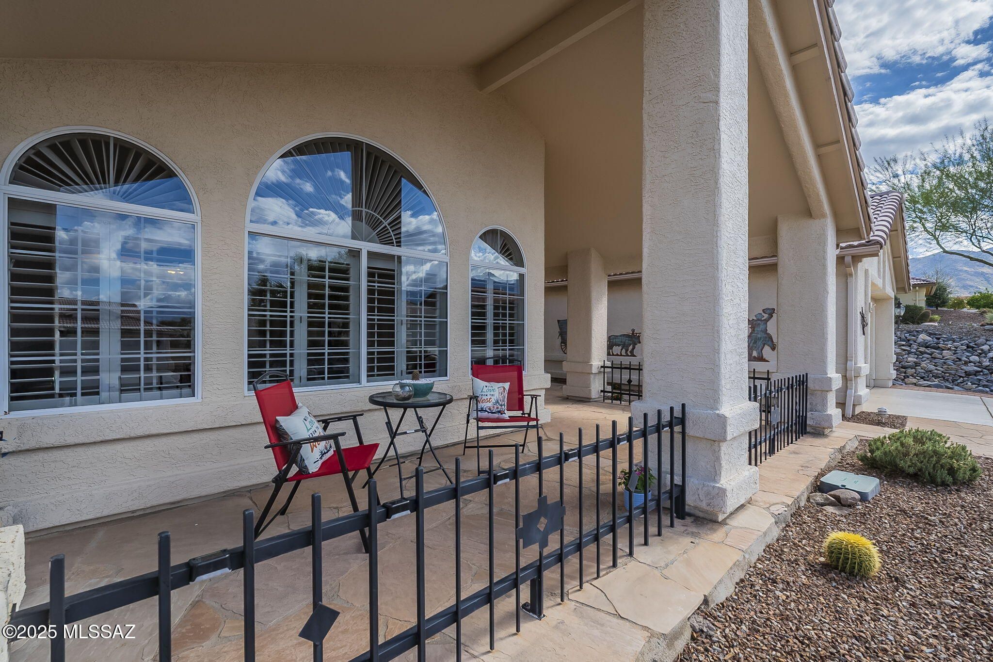Experience resort style living in highly sought after Saddlebrooke Golf Community. Meticulously maintained 2Bed 2ba+bonus room, w/welcoming covered front porch & extended flagstone patio to enjoy AZ outdoor living & mountain views. Popular split plan provides privacy along w/ versatile options for room design & use. A grand entry sets the tone, opening to a spacious living area w/vaulted ceiling & walls of windows that flow seamlessly to the rear yard entertainment area. The kitchen is the hub of the home featuring abundant cabinetry, sleek new stainless steel appliances, a convenient built-in desk & ample counter space adjoining casual dining area & bonus room, ideal for family gatherings or game night. Spacious primary suite hosts a new luxurious bath retreat