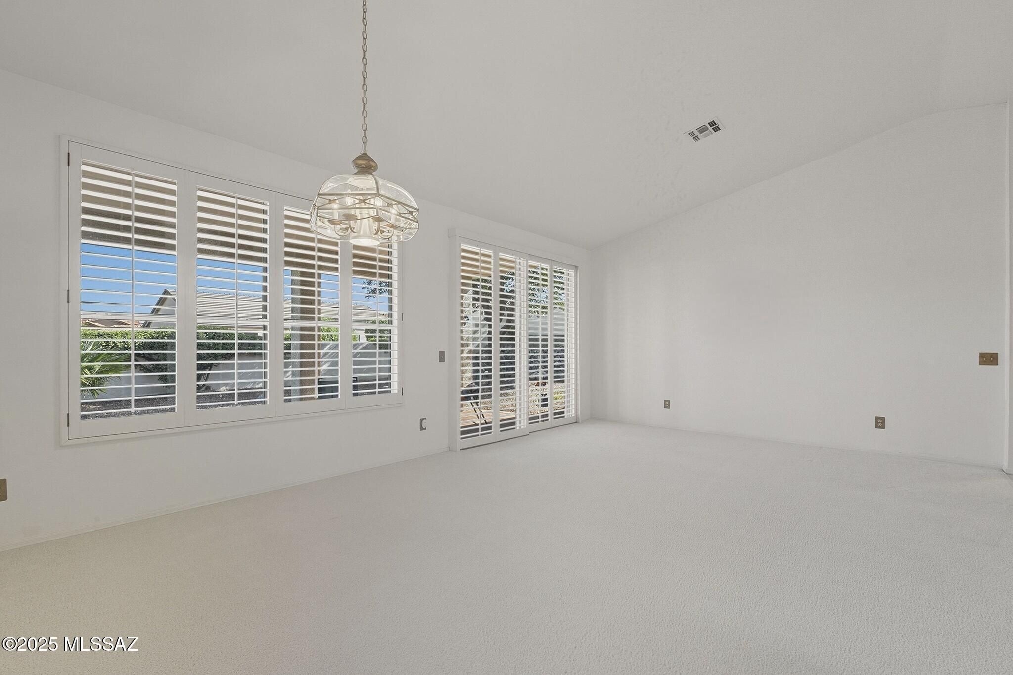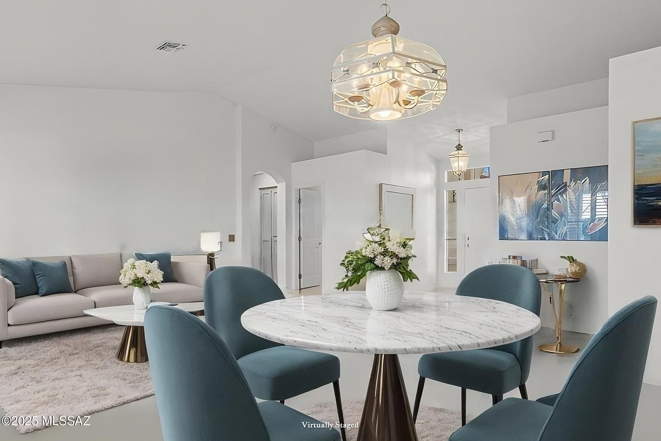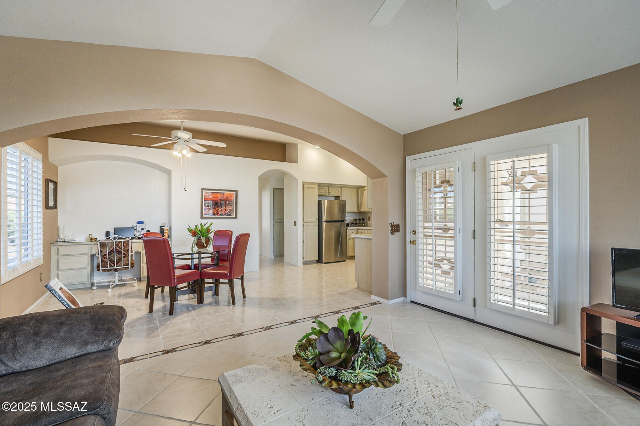Experience resort style living in highly sought after Saddlebrooke Golf Community. Meticulously maintained 2Bed 2ba+bonus room, w/welcoming covered front porch & extended flagstone patio to enjoy AZ outdoor living & mountain views. Popular split plan provides privacy along w/ versatile options for room design & use. A grand entry sets the tone, opening to a spacious living area w/vaulted ceiling & walls of windows that flow seamlessly to the rear yard entertainment area. The kitchen is the hub of the home featuring abundant cabinetry, sleek new stainless steel appliances, a convenient built-in desk & ample counter space adjoining casual dining area & bonus room, ideal for family gatherings or game night. Spacious primary suite hosts a new luxurious bath retreat