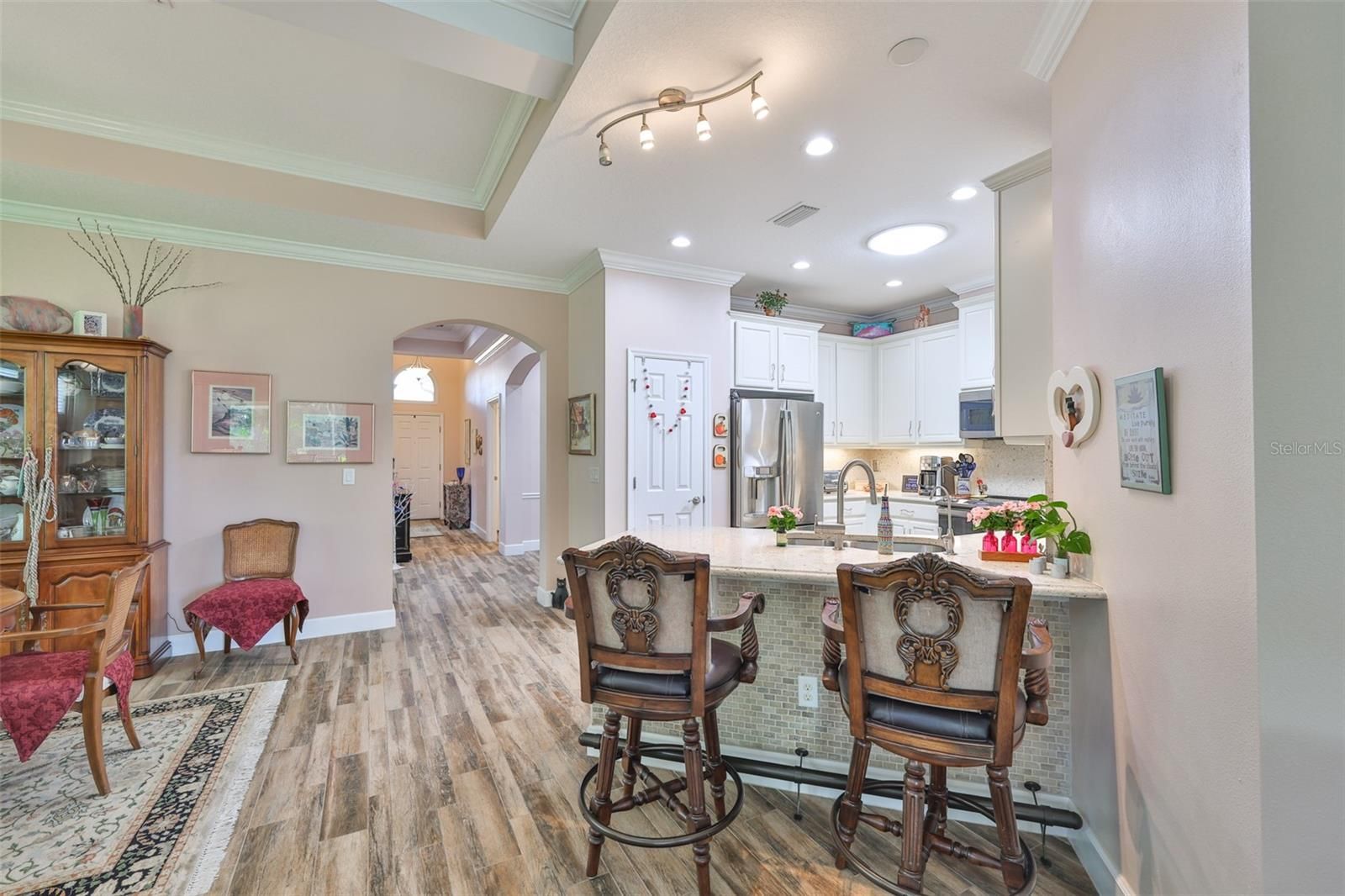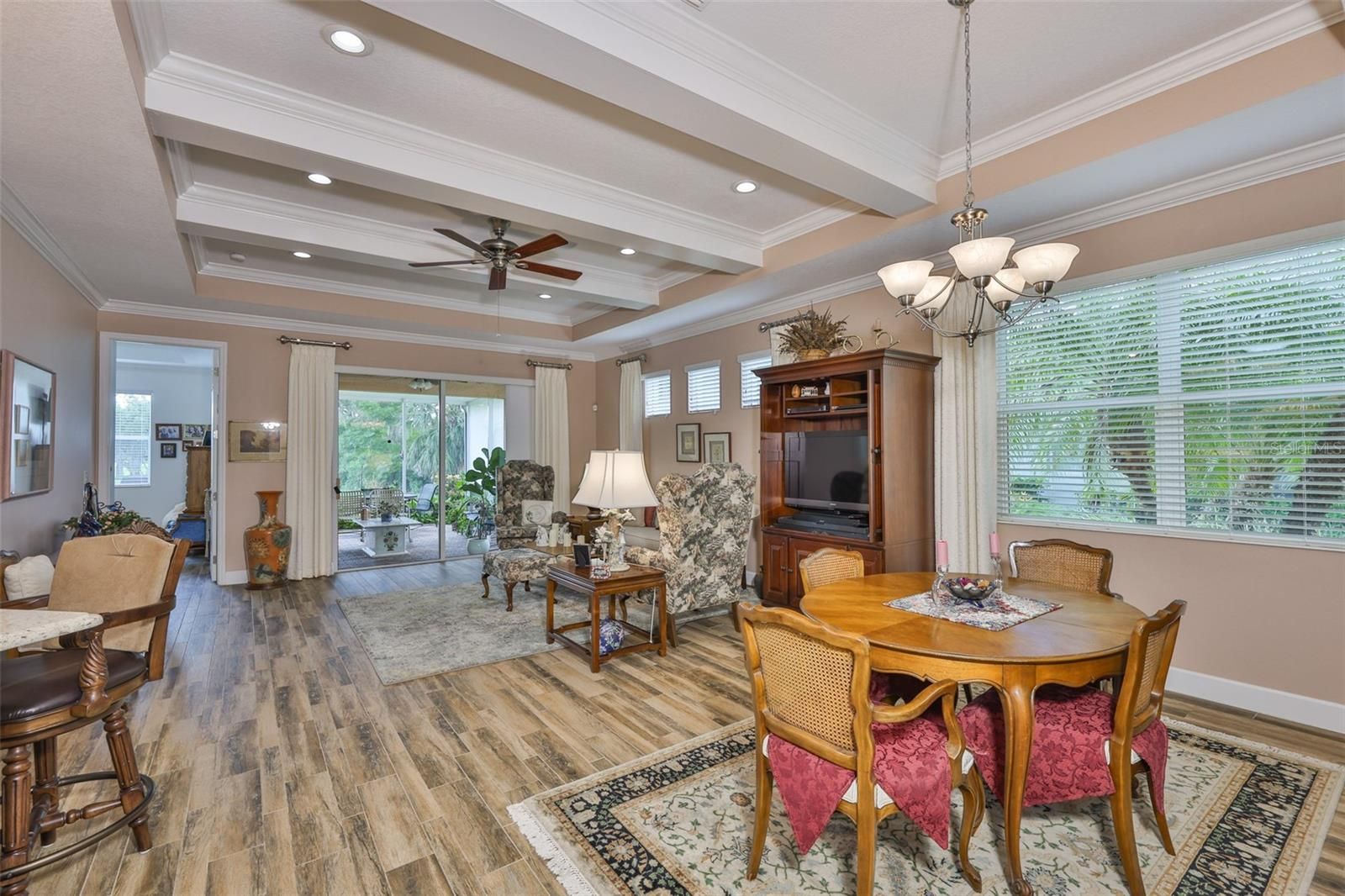 - Built-in Features, Ceiling Fan(s), Coffered Ceiling(s), Crown Molding, High Ceilings, Living/Dining Room, Open Floorplan, Solid-Wood Cabinets, Split Bedrooms, Stone Counters, Tray Ceiling(s), Walk-In Closet(s)