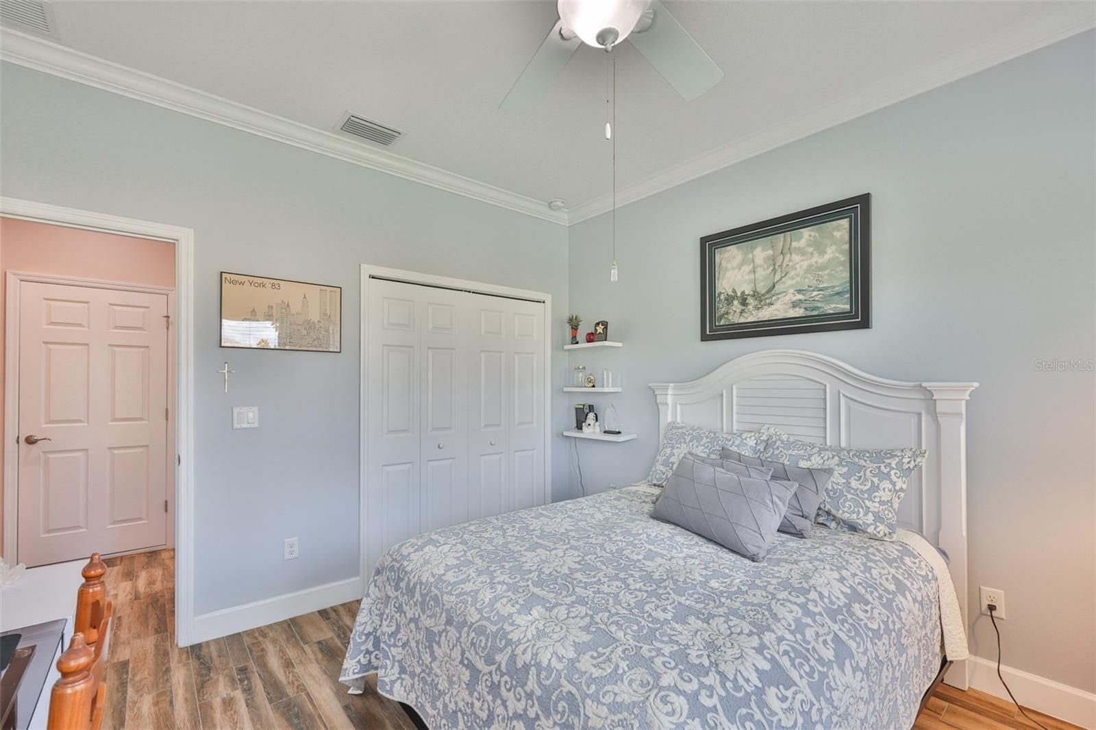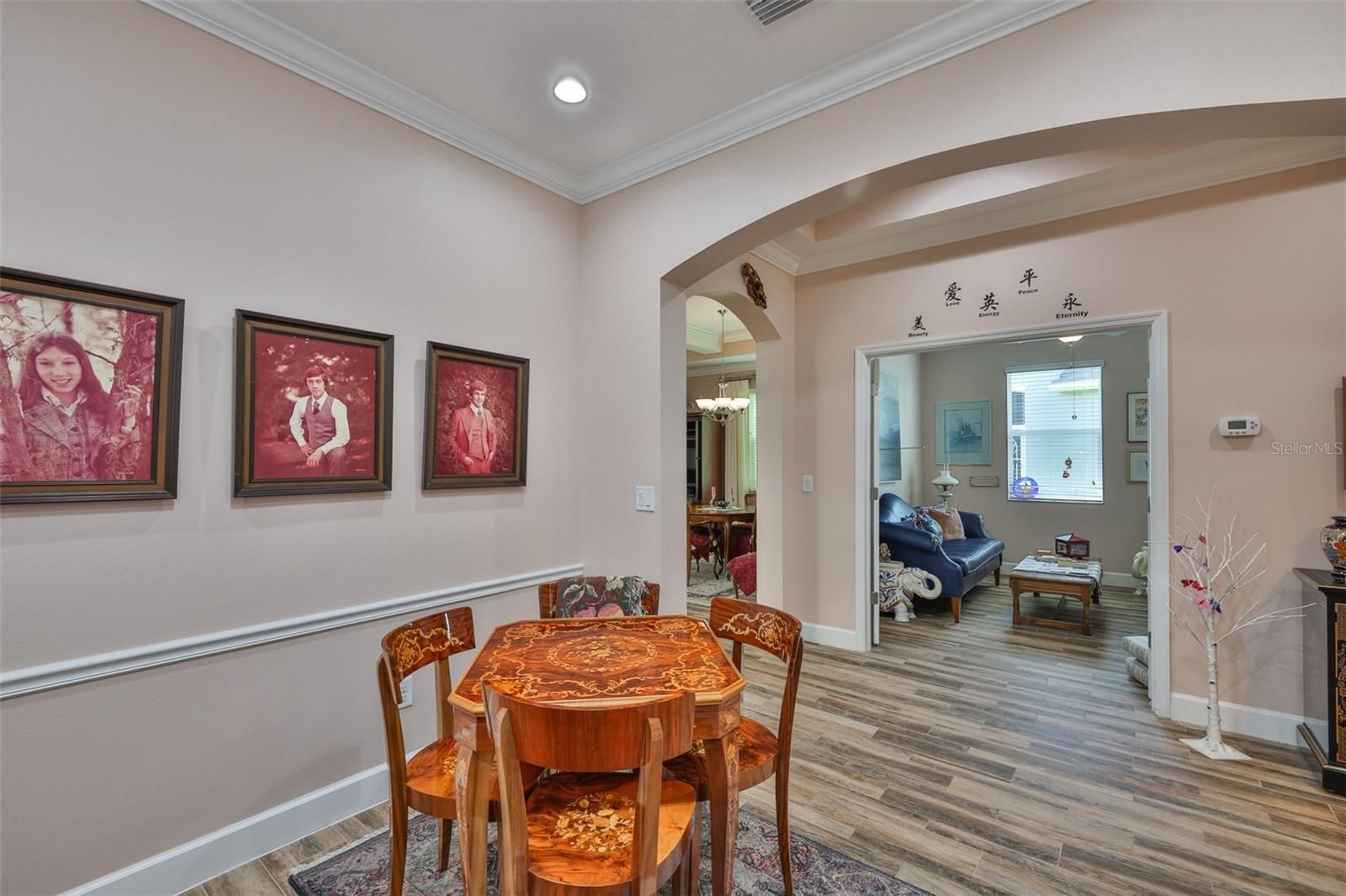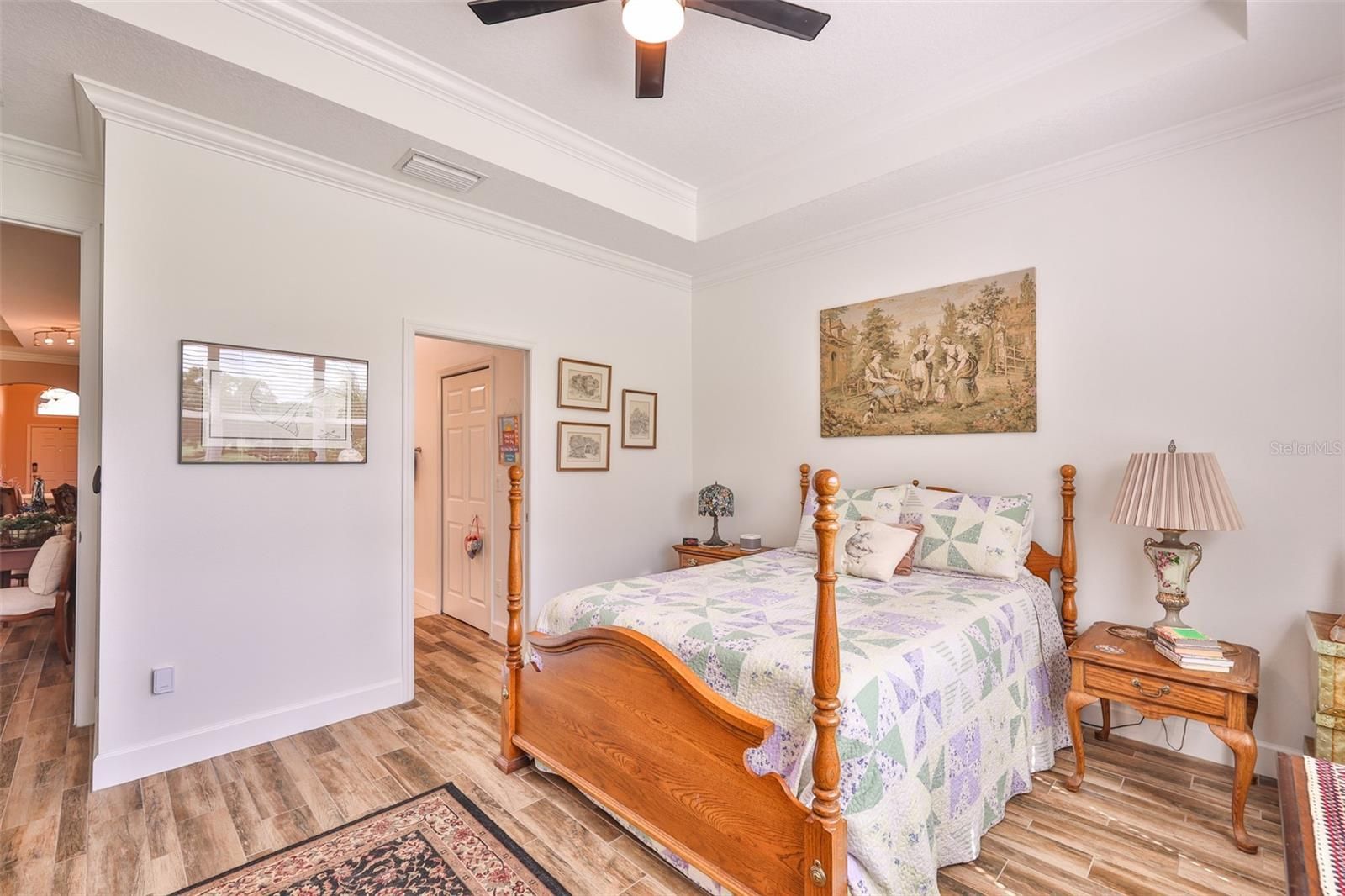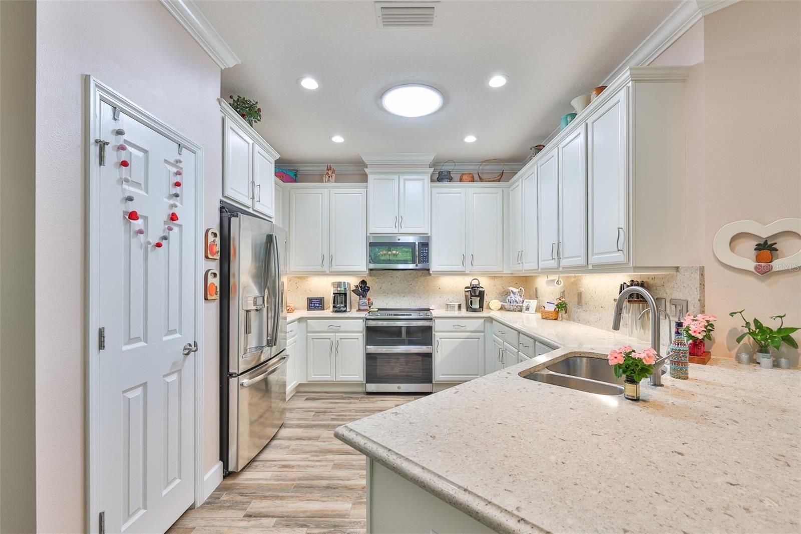 Click On 3D Tour Above --------- LUXURIOUS VILLA WITH NUMEROUS PREMIUM UPGRADES! Welcome to active retirement living at its finest, in the GATED community of Verona, within Sun City Center, FL, where you'll feel like you're on vacation every day! This immaculate & perfectly maintained "MAGNOLIA" model boasts 1800 SQ FT of living space that includes 3 SPACIOUS BEDROOMS, 2 FULL BATHROOMS, PLUS A DEN. This home is situated on a lushly landscaped lot in a peaceful neighborhood. Step inside and be wowed by the beautiful "wood-look" porcelain tile flooring throughout, 7-inch crown molding & base boards throughout, coffered ceilings, 3 solar tubes for extra light, neutral decor and custom blinds & draperies. The large great room/dining room combo is the perfect space for all your entertainment needs and also has a slider for easy access to the lanai area. The gorgeous kitchen is extra light & bright w/added solar tube, has 42 inch wood cabinetry w/under cabinet lighting, quartz counters and backsplash, stainless appliances, including a new range and a large breakfast bar, all wide open to the great room/dining room. The den/office boasts lovely custom built-in office cabinets & desk plus another solar tube for premium light. The private owner's suite has plenty of space for a king size bed, deep closets for maximum storage, double sink vanity & pretty tiled & glassed walk-in shower. The front guest bedroom has impact glass windows and custom built-in office system. The 3rd bedroom can easily be used for your hobbies or simply a quiet space to relax. When you want to unwind, retreat to the peaceful 13 x 21 covered & screened lanai where you can enjoy the various birds & wildlife in the peaceful green space & wooded area. For an added bonus, this home is just a short walk or golf cart ride to the neighborhood pool down the street. You'll also have access to Club Renaissance where you can enjoy dining, drinks, social activities, resort-style pool, fitness classes & spa. Sun City Center also offers a wide range of amenities such as shopping, restaurants, banking, doctors, various social clubs, sports and so much more. So come & visit this beauty today and see why you'll want to call it home!