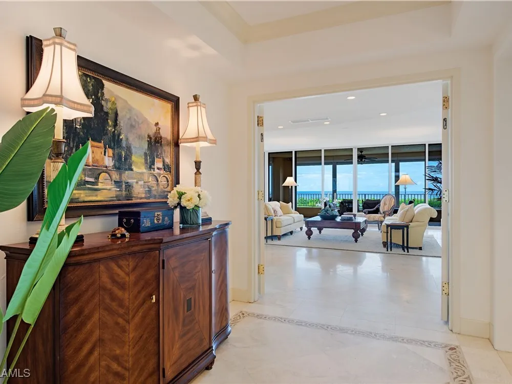 Experience the beauty and allure of this RARE Pelican Bay Cap Ferrat 8th floor 4 BEDROOM, 4 BATH+FAMILY ROOM+CABANA, 3650 air-conditioned square foot Gem, offering uninterrupted sweeping views of THE GULF, anchored by verdant tropical mangrove and palm canopy vistas. Your secure elevator sweeps you directly to your own private foyer, welcoming you to a marvelously generous open plan, designed to maximize and blend living/entertaining spaces with timeless sophistication, coupled by expansive Easterly and Westerly lanais and terraces inviting you to savor tropical Florida Gulf breezes, sunsets, sunrises, and serenity. A formal generous living room is wrapped in Gulf views, leading to a sun-lit morning room and well-equipped Chef's kitchen, featuring handsome custom cabinetry, updated SS appliances, RARE natural gas cooktop, along with two Sub-Zero beverage drawers. The separate spacious family and dining rooms easily accommodate large family or friend gatherings. Four split bedrooms invite maximum privacy, with the Owner’s Suite bathing in GULF VIEWS, while also boasting both his and her separate baths and separate walk-in closets. This rare Gem also includes your own deeded personal poolside CABANA, featuring a gathering room, full bath, and private patio complete with personal gas BBQ grill station, located just steps from Cap Ferrat’s stunning expansive resort-style Saltwater pool and spa. Cap Ferrat is well recognized for its significant luxurious tower amenities. Owners enjoy their 24/7 attended security guard-gated entrance, 24/7 front-desk personnel, multiple grand social gathering areas, expansive fitness, personal men’s and women’s spa therapy rooms, along with two beautifully appointed guest suites. The under-tower garage offers owners two deeded side-by-side parking spaces, along with a community electric charging station. This tower is also prized for being just steps away from the Pelican Bay beach tram station, allowing one to easily access Pelican Bay’s myriad of private membership-included community and beachfront amenities: 2 private beachfront restaurants, attended beachfront services, attended fitness, learning center, 18 Har-Tru® tennis courts, pickleball park now in progress, plus miles of kayaking, biking, and walking paths. Ask about the never-ending Pelican Bay active social calendar, too! Artis Naples Performing Arts Center, upscale Waterside Shops, lively Mercato, and The Naples beachfront Ritz-Carlton Hotel all just moments away. This is your opportunity to live where refined elegance meets the exceptional lifestyle!