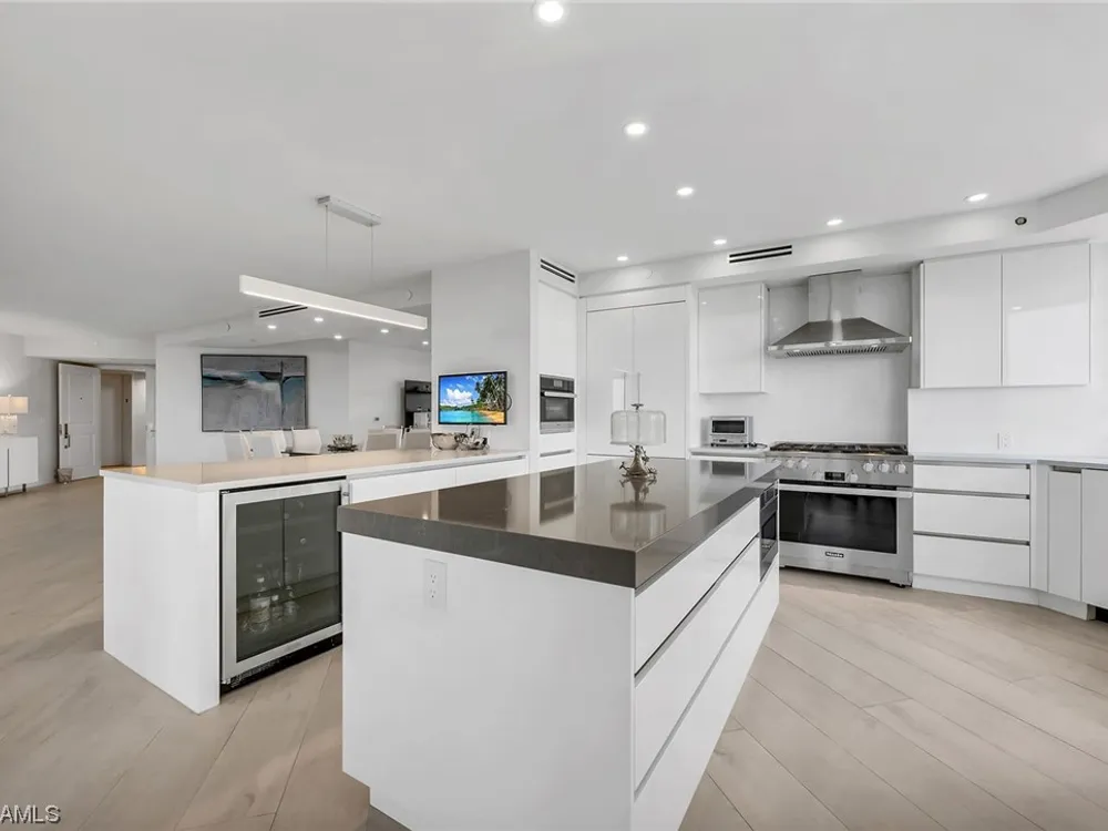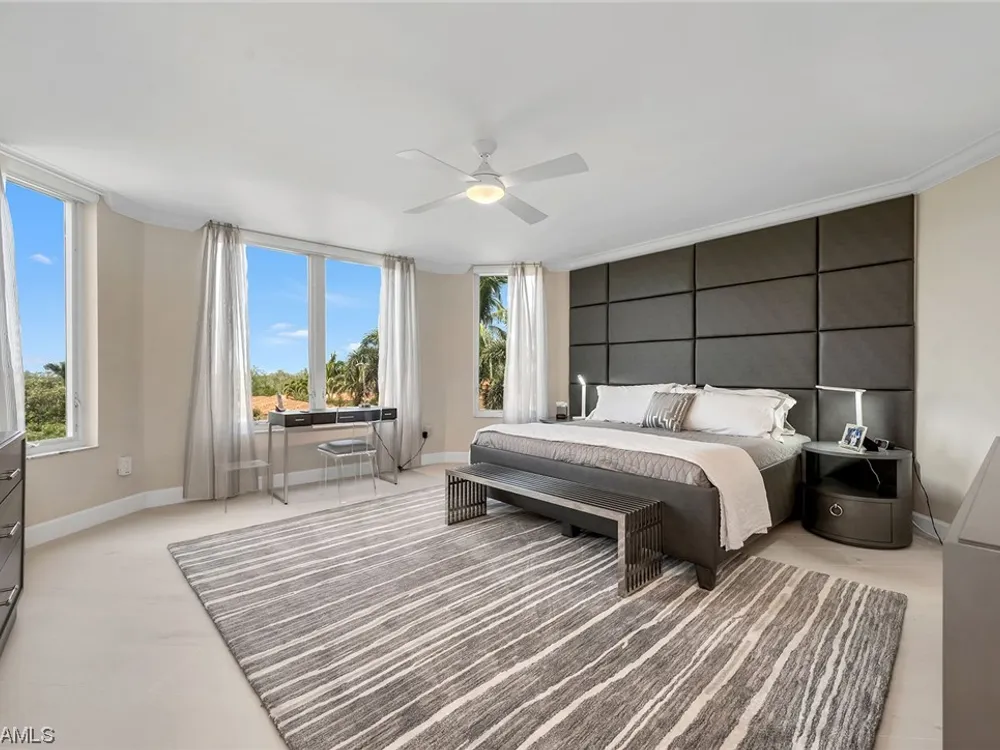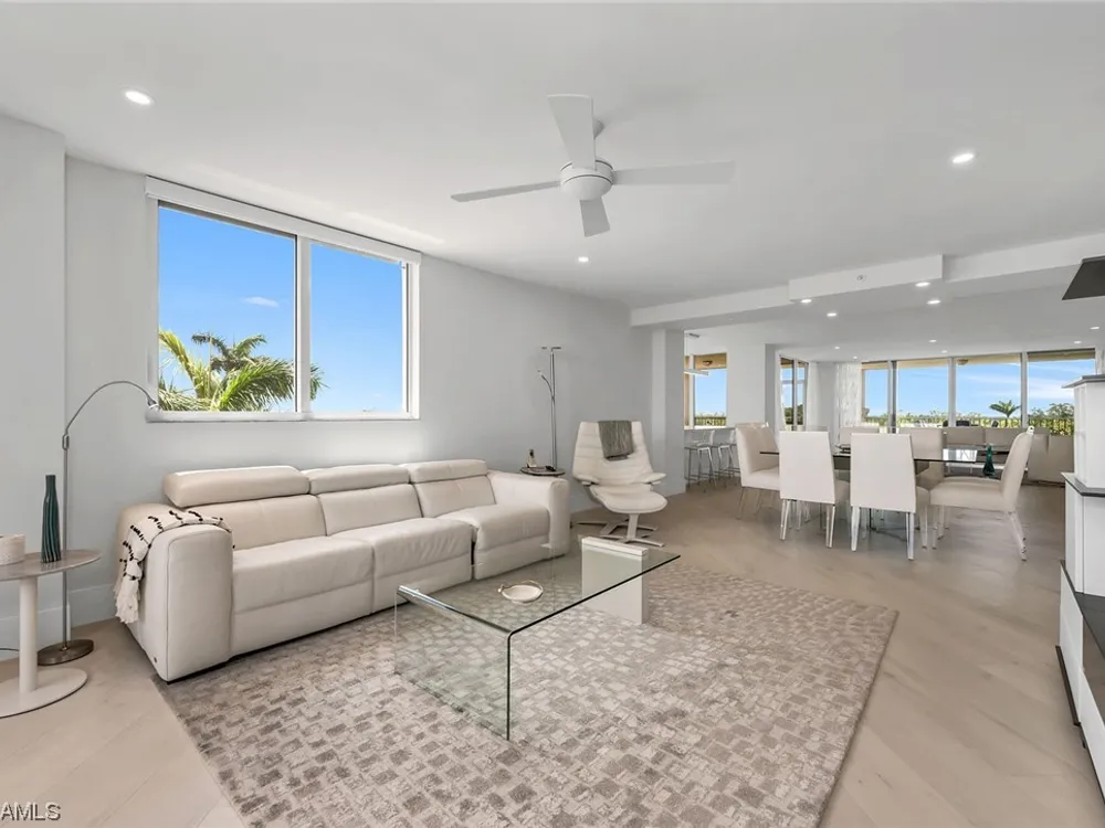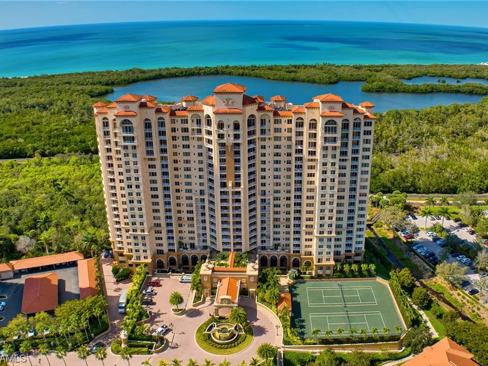 Beautiful, bright, and modern corner end unit in the fantastic Cap Ferrat; updated, offered furnished and ready for you for the season. The primary bedroom offers privacy and sunset views, separate walk-in closets, updated bath with separate shower and freestanding soaking tub. Screened and open lanais with western views and two balconies for the guest bedrooms with sunrise views. The kitchen features a 6-burner gas range, wine cooler, steam oven with generous pantry space. Two car spaces and a community with 24-hour security and staffed gate and front desk, concierge service, fitness center, resort-style pool, spa, health club, saunas, steam rooms, massage rooms and so much more. Pelican Bay amenities include two private beach pavilions with indoor and outdoor dining, beach lounge/umbrella service, tennis, community center with state-of-the-art fitness, spa and tennis courts.