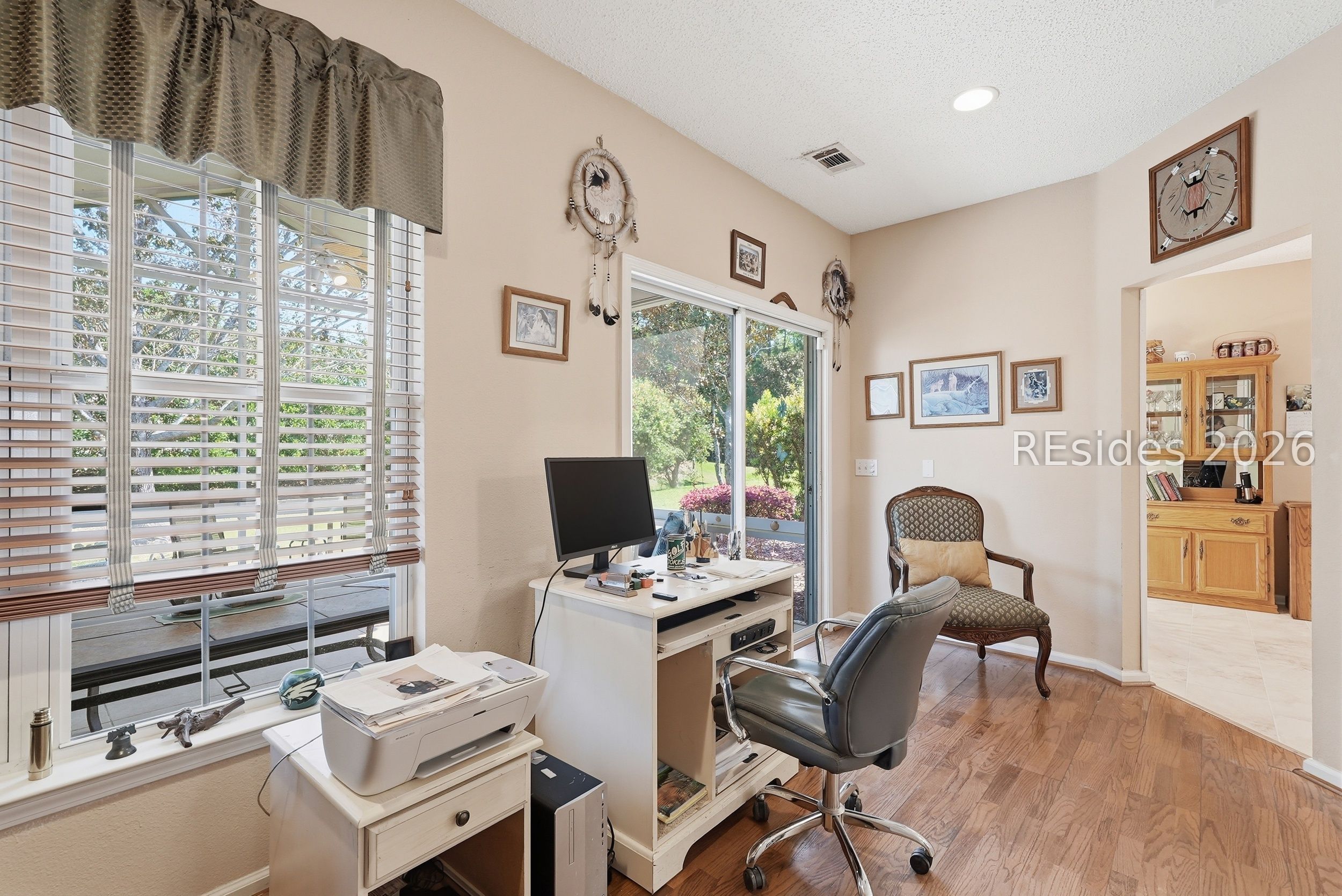 Experience the best of Sun City living with this distinguished Ibis floor plan situated on a spacious corner homesite. This three-bedroom, two-bath residence is meticulously designed to balance comfort and elegance. The property features a dedicated office or den, as well as an expansive screened lanai (17x17), ideal for evening relaxation and gathering with friends or family. The versatile sunroom can serve as a music room, additional office, gaming area, or reading nook. The gourmet kitchen is equipped with granite countertops, abundant white cabinetry, a central island, double ovens, a new refrigerator, and a charming eat-in area accented by a bay window. For entertaining larger groups, the dining room offers generous space for hosting guests. The primary suite includes a bay window, a sizable walk-in closet, and a spa-inspired bathroom featuring double vanities, a walk-in shower, and a garden tub. Two secondary bedrooms are separated by a full bath and positioned away from the owner's suite to maximize privacy. Recent upgrades include a new roof (2017) and luxury vinyl plank flooring throughout the main living areas. A two-car garage with a four-foot extension provides additional storage. Residents of Sun City Hilton Head enjoy access to exceptional amenities, including multiple pools, fitness centers, golf, pickleball, tennis, softball, woodworking facilities, and over 200 clubs. Golf cart may be negotiated as part of the sale.