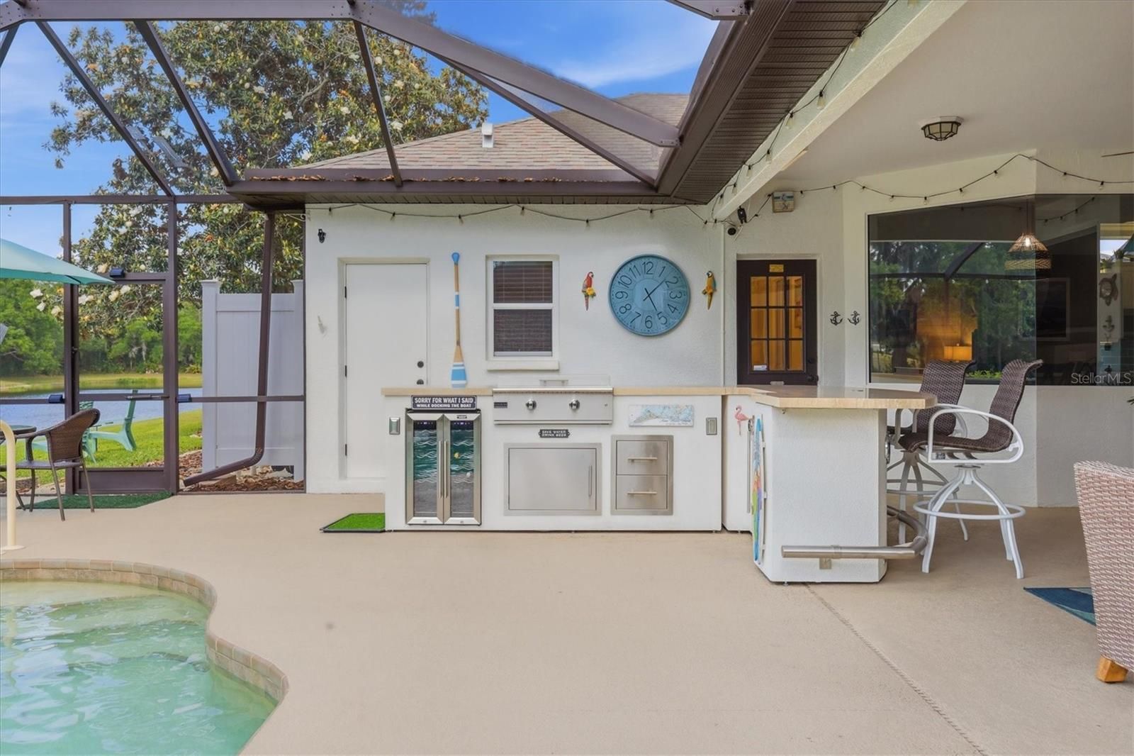 Get ready to be amazed at this stunning, like new Private Golf Retreat. Updated floor to ceiling, inside & out. Every detail will be felt and appreciated from the moment you enter this one-of-a-kind home in Tara, a private golf and country club community, known for its championship golf course, extensive resort amenities, and value. As you arrive at your new home, you’ll appreciate the updated landscaping and new sod in the yard. A beautiful front porch greets you as you enter the home through your new hurricane rated front door. The owners spared no expense in updating the home, including the new hurricane windows and sliding doors added throughout in 2025/2026. Once inside the home you will appreciate the high-end details and finishes from the floors to the beautifully remodeled kitchen. Your living room includes a custom shiplap feature wall with built-ins and quadruple oversized hurricane impact pocket sliders that allow a seamless transition from your inside to outside living space and offer great pond and golf views year-round from all of the main areas of the home and beyond. The open floor plan is great for entertaining and provides endless views of the beautiful details offered inside the home. Quartz counters are just one of the updates worth mentioning in the Kitchen and bathrooms that have been tastefully updated. The second bedroom just off the kitchen features a built-in desk and could make a great office/den if desired. Tucked behind a pocket door at the back of the home you’ll find a third bedroom and the guest bathroom that also doubles as a pool bath. All have been updated for your families & guests’ enjoyment. If you appreciate outdoor living and breathtaking private views this is the one! A generously sized covered outdoor living area and kitchen complement your encage saltwater pool that was resurfaced in 2021 & received a new heater in 2026 allowing for year-round enjoyment. Paradise outdoor Kitchens are known for their quality. This one features a large bar top, grill, wine fridge, beverage fridge & storage for all of your grilling accessories. Enjoy peace and ultimate relaxation with pond views and private Golf views of the 17th hole. The large attached exterior storage closet is a great feature of the home rarely found. The 2 Car Garage has epoxy coated floors, utility sink & organization solutions. The large laundry room has a storage closet in addition to shelving just above your washer and dryer that were purchased in 2023. Living your best life isn’t just about the home, it’s about the community & Tara Golf & Country Club delivers. This home comes with a deeded Class A membership that allows you to enjoy all of the amazing benefits that come with a private golf & country club membership. Easy access to green times on the 18-hole championship golf course which was renovated in 2023. Brand new Pickle Ball Facility with 5 courts in 2025. Bocce, Tennis, Full Fitness Center and Exercise Classes, Community Pool, and fantastic clubhouse with active grill room/bar, dining and loads of events to fill your calendar all year long. The Country Club is currently going through a complete renovation and none of the improvements have created a special assessment to owners. The best bang for your buck for all you golfers looking for the best golf course for the best price! No CDD and convenient to dining, shopping, & entertainment. Welcome to Taradise.