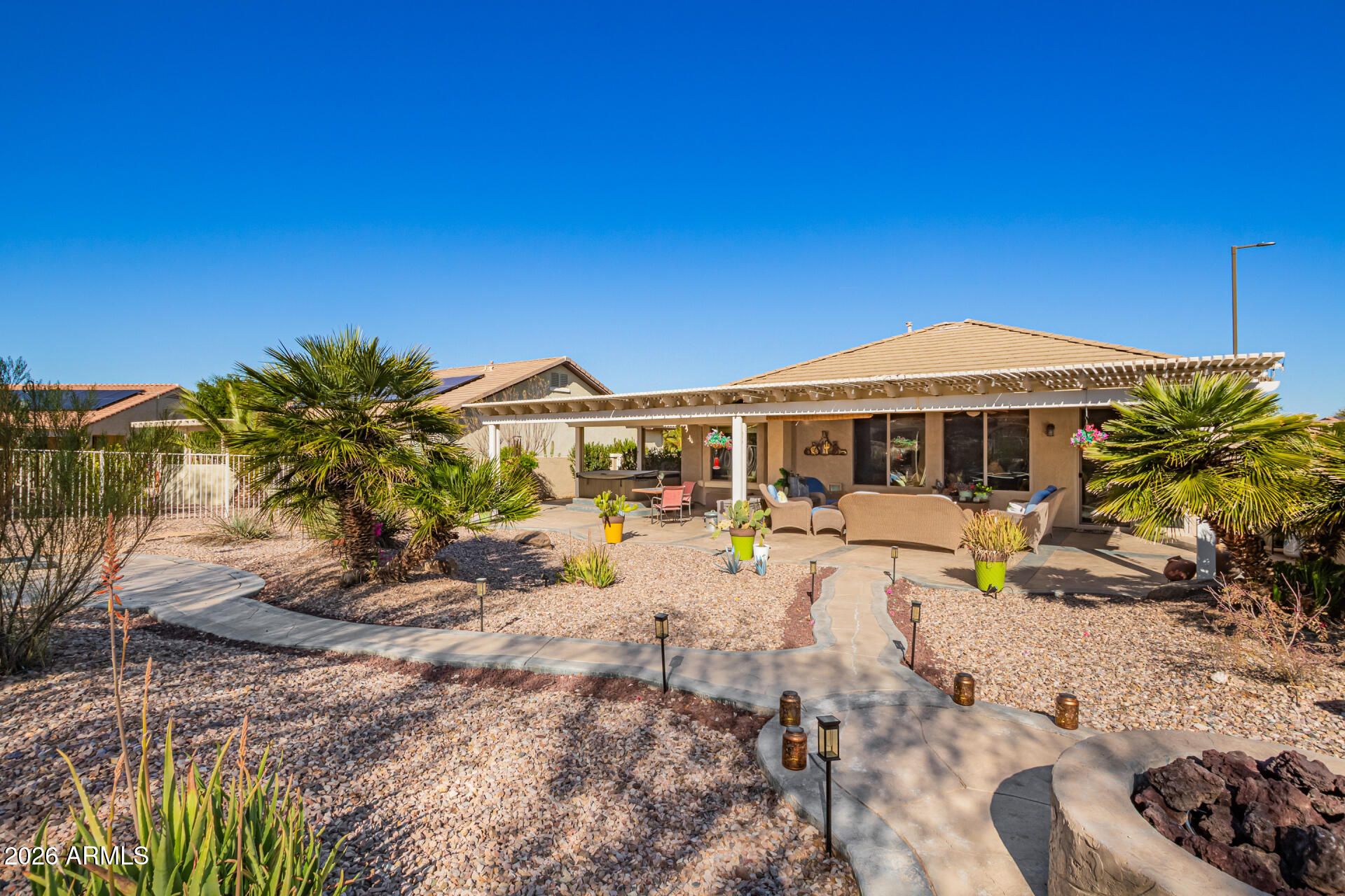 Situated on a fully enclosed corner lot, this beautifully maintained 3-bedroom, 2-bath home offers the perfect blend of comfort and Arizona outdoor living. The backyard is ideal for entertaining and relaxation, featuring an extended covered patio, pergola, hot tub, and fire pit-creating a private retreat for enjoying Arizona's stunning desert evenings. Inside, the open-concept layout is filled with natural light and highlighted by hardwood flooring in the great room. The kitchen features a large center island and ample workspace for everyday use. The sliding glass door opens seamlessly to the backyard for effortless indoor-outdoor living. Notable upgrades include a NEW HVAC system and luxury vinyl plank flooring in all bedrooms. The two-car garage plus separate golf cart garage offers generous built-in storage, while mature landscaping and a wrap-around paved walkway enhance both curb appeal and everyday usability. Located in the sought-after 55+community of Sun City Anthem at Merrill Ranch, residents enjoy championship golf, a nearby recreation center, bar and grille, resort-style pools, fitness facilities, and popular pickleball courts-offering an active, social lifestyle in one of the area's premier communities.
