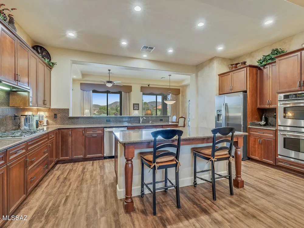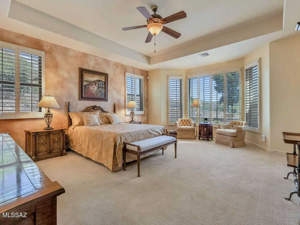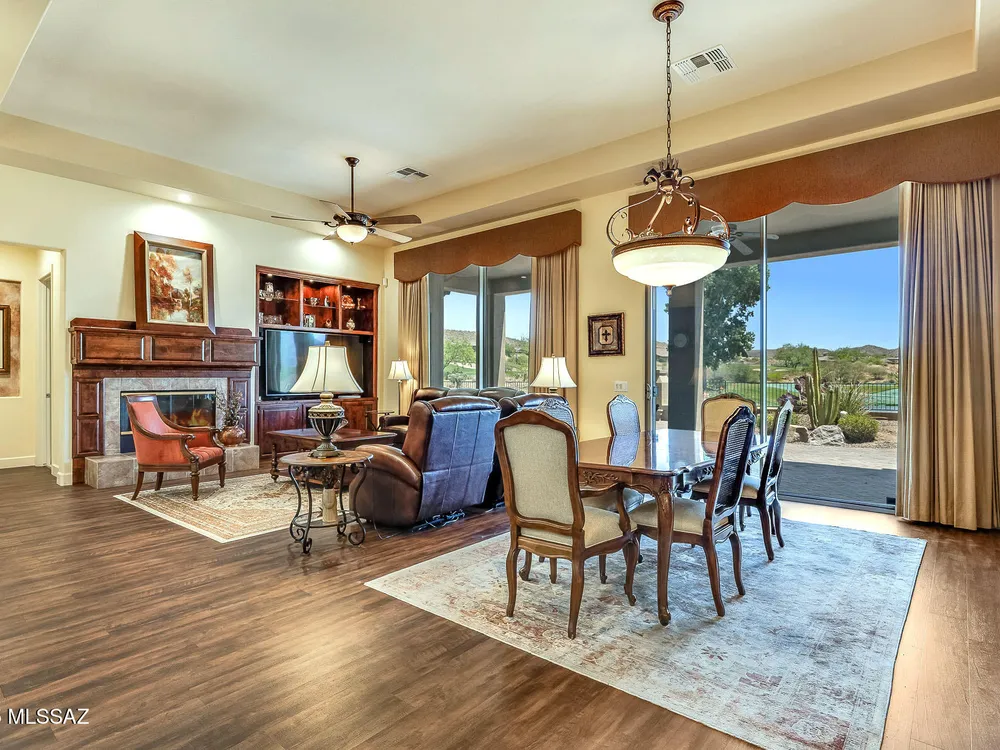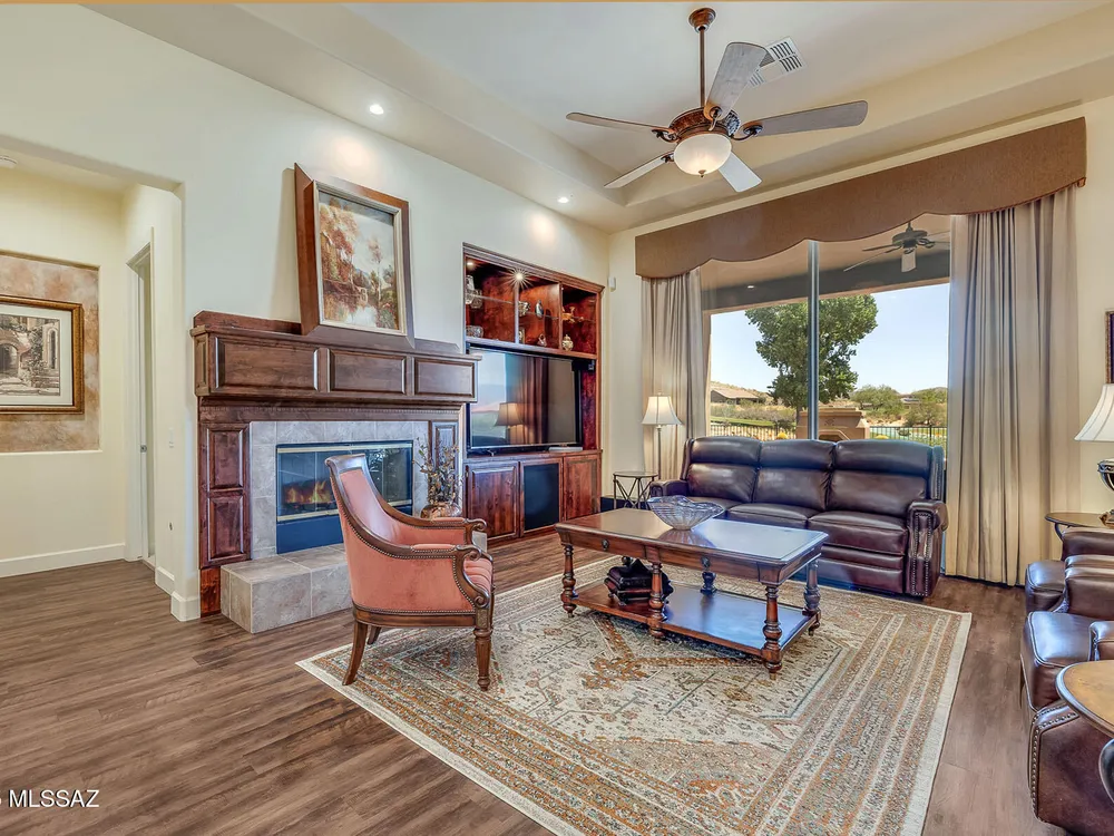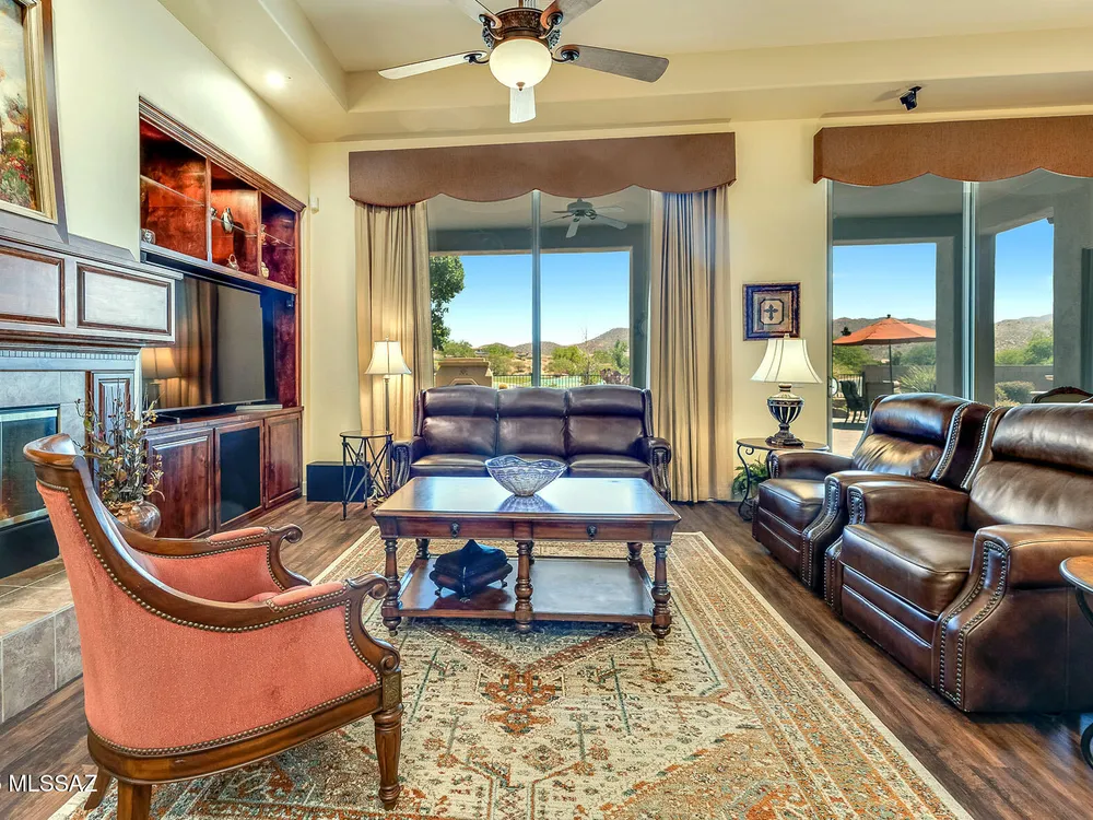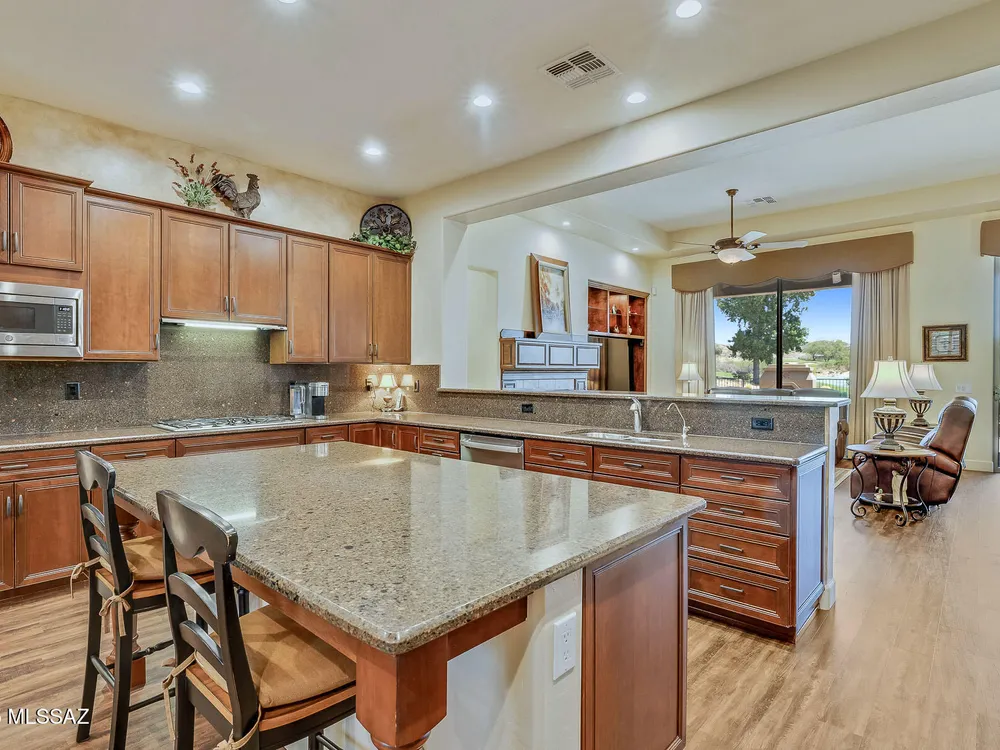 EXQUISITE LUXURY HOME resides on a Premium View Lot in the coveted PRESERVE at SaddleBrooke boasting Panoramic Golf Course and Catalina Mountain Views. Popular Sabino plan on corner lot offers 2,664 sq ft of living space in main home comprising dual Ensuite Bedrooms, Den/Office and Powder Room. Private, detached 285 sq ft Casita off gated courtyard is ideal for additional guests. This elegant Open Concept Plan showcases recessed ceilings, bay windows, faux paint accents, Luxury Vinyl Plank flooring with carpeted bedrooms, plus stone pavers front & rear. Great Room is highlighted by distinct Living & Dining areas, built-in Media wall, Fireplace and View Windows. Expansive Gourmet Kitchen hosts dual islands with breakfast bars, large breakfast nook, rich hued cabinetry, Quartz countertops,