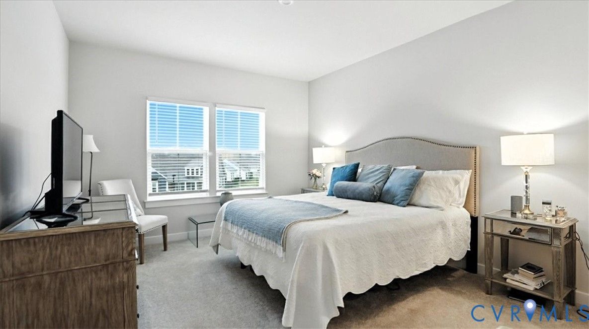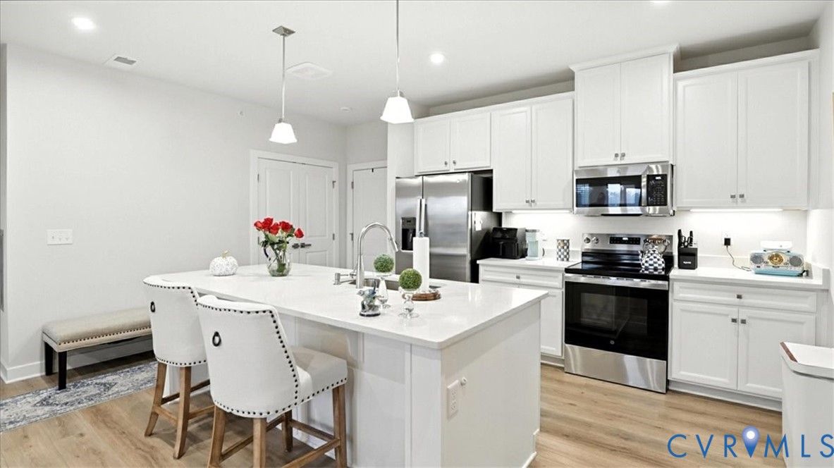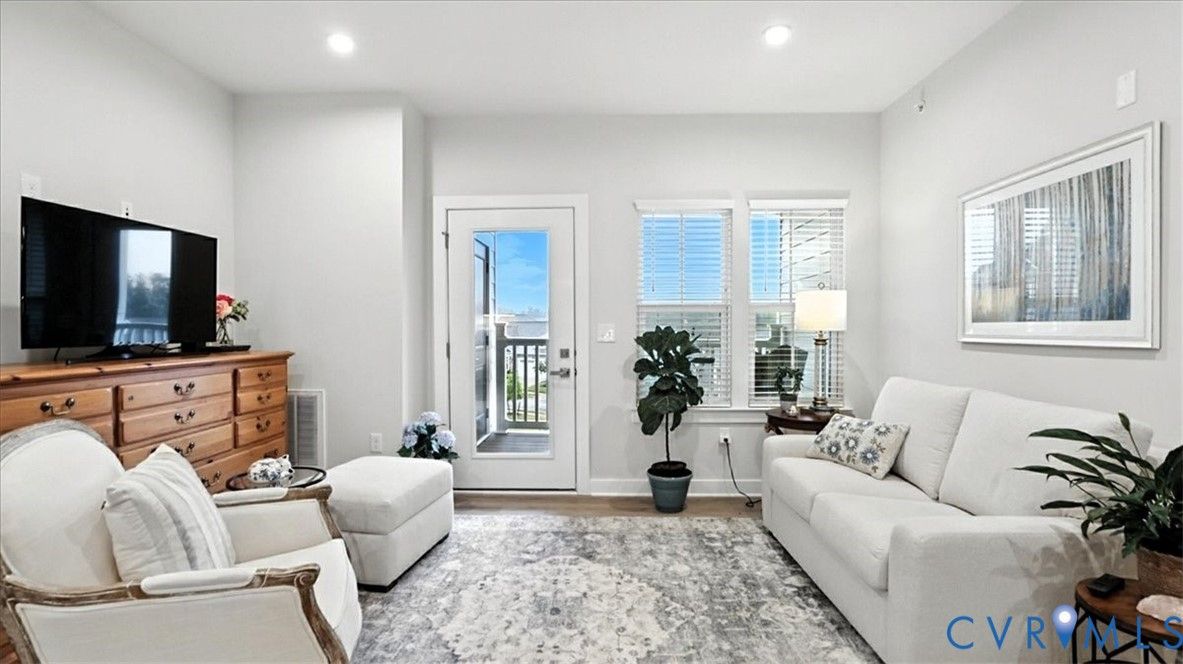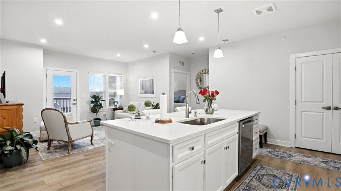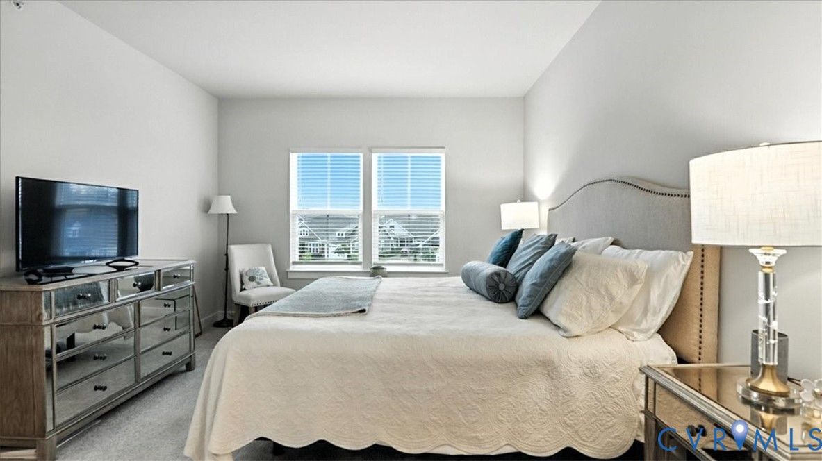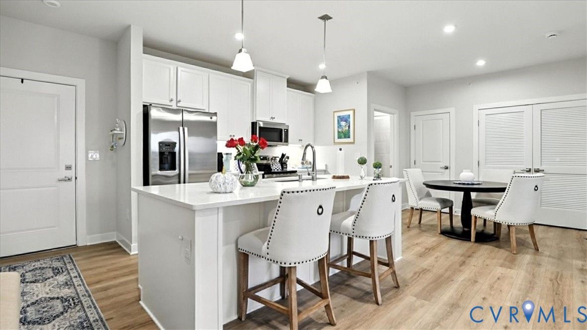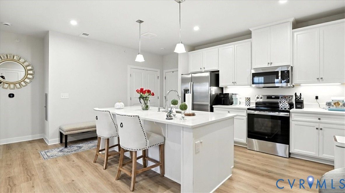 Better Than New, Move-In Ready and waiting for YOU! Welcome to one of the most desirable top-level condos in the 55+ community of Greenwich Walk! This stunning Emerald model offers beautiful views of the neighborhood and is packed with thoughtful upgrades, stylish finishes, and low-maintenance living—all just steps from Cosby Village. Step inside this sunny, open-concept home and fall in love with the chic, durable LVP flooring and spacious layout designed for both comfort and entertaining. The designer kitchen is a true showstopper, featuring sleek quartz countertops, under-cabinet lighting, stainless steel appliances (refrigerator conveys), an expansive island with bar seating, recessed/pendant lighting, a generous pantry, and a cozy dining area. The inviting living room flows seamlessly from the kitchen and opens to a private balcony—your perfect perch for morning coffee or evening unwinding. Retreat to the spacious primary suite, complete with plush carpeting, a huge walk-in closet, and a spa-inspired en-suite bath with a raised-height double vanity, linen closet, and a beautifully tiled walk-in shower with bench seating. A second bedroom—ideal for guests or a home office—is conveniently located near a second full bathroom. Added bonus: no need to install blinds AND the washer/dryer are included! Enjoy elevator access and true single-level living in Chesterfield’s premier active adult community. Greenwich Walk @ Foxcreek offers its own private clubhouse, pickleball courts, fitness center, pool, walking paths and a tranquil pond. With dozens of social clubs and regular community happy hours, there’s always something to do—and great neighbors to do it with. Don’t miss your chance to experience the ultimate in carefree living. Schedule your showing today!