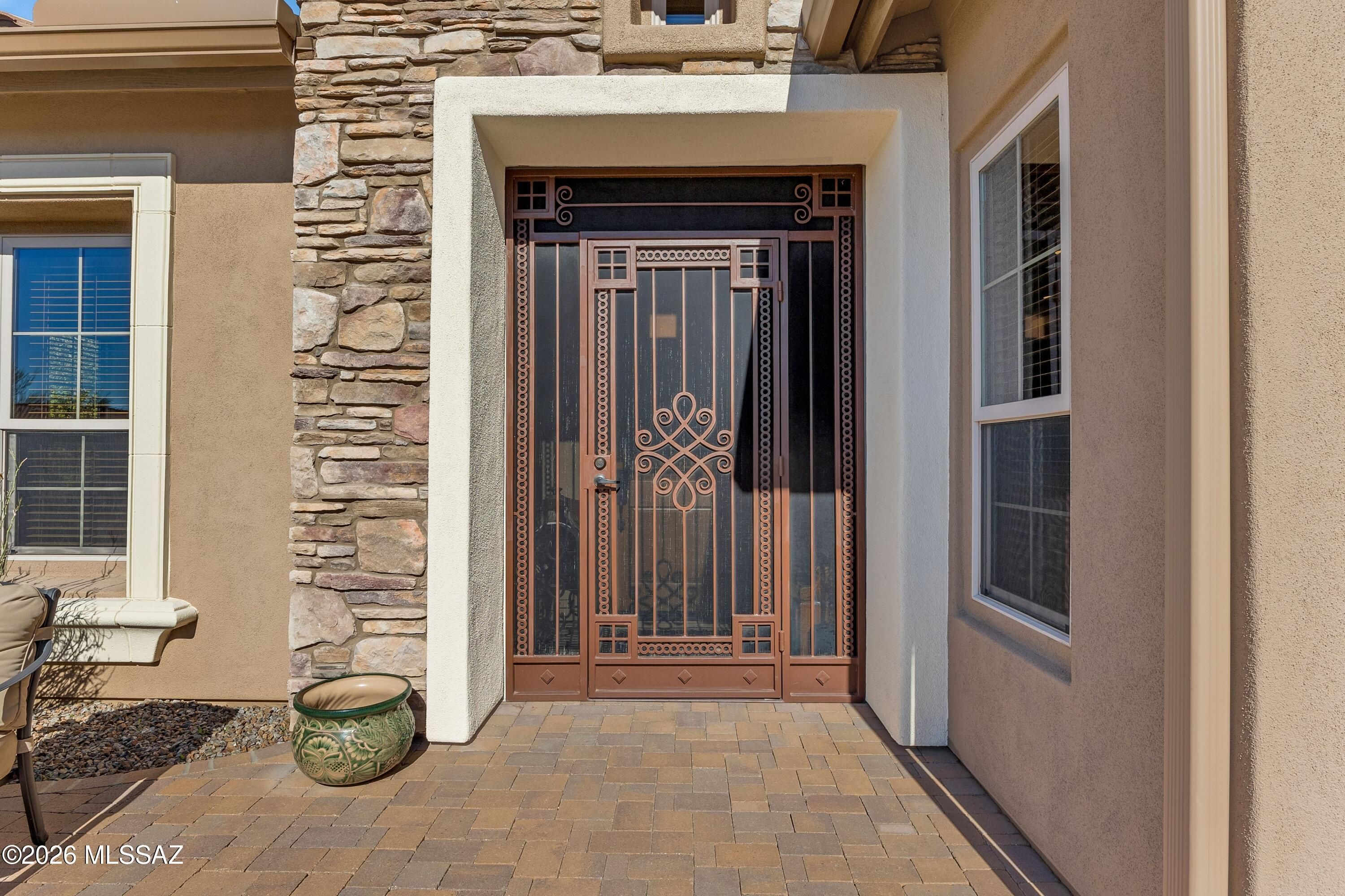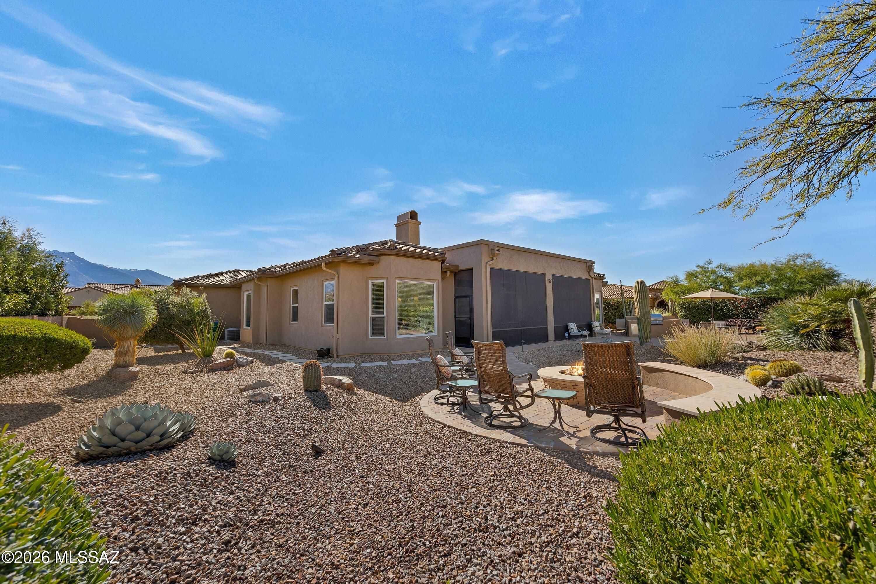 Located on corner lot in The Preserve, this 2011 Sabino offers golf course & mountain views! Great curb appeal! Paver courtyard with wrought iron entry gate leads into home. Inside, Den/Office. Great Room has stacked stone media wall with gas fireplace & sliding door to patio. Kitchen with granite counters, black appliances, gas cooktop, 42'' cabinets with slide-outs, walk-in pantry, & dining area. Owner's Suite with bay window & patio door. Bathroom has walk-in shower, soak tub & walk-in closet. Powder Room. Guest Bedroom has bay window, patio door, walk-in closet, & en-suite bathroom with shower. Laundry Room has W/D & cabinets. Extended 3 Car Garage has sink, cabinets, & epoxy flooring. Outdoor Living-screened covered patio, extended paver patio, built-in BBQ, gas firepit & gated yard!