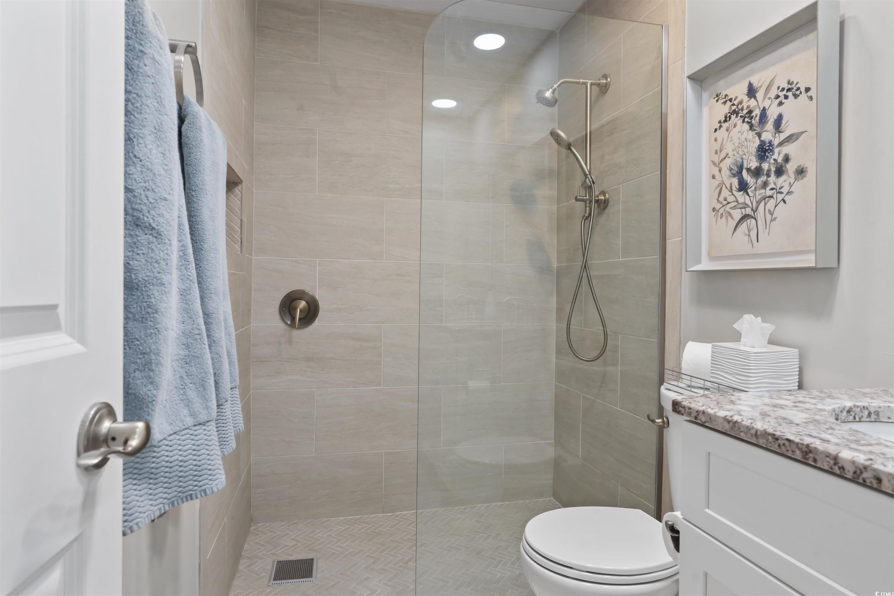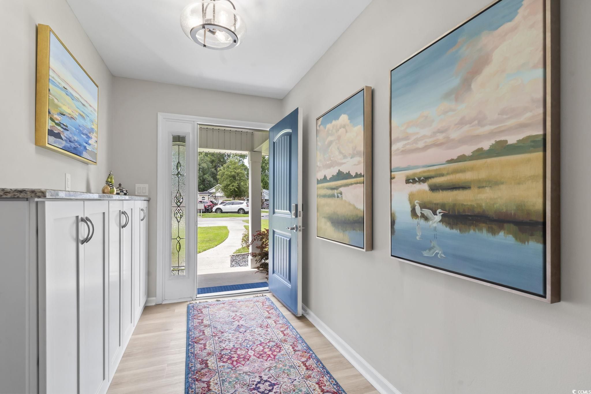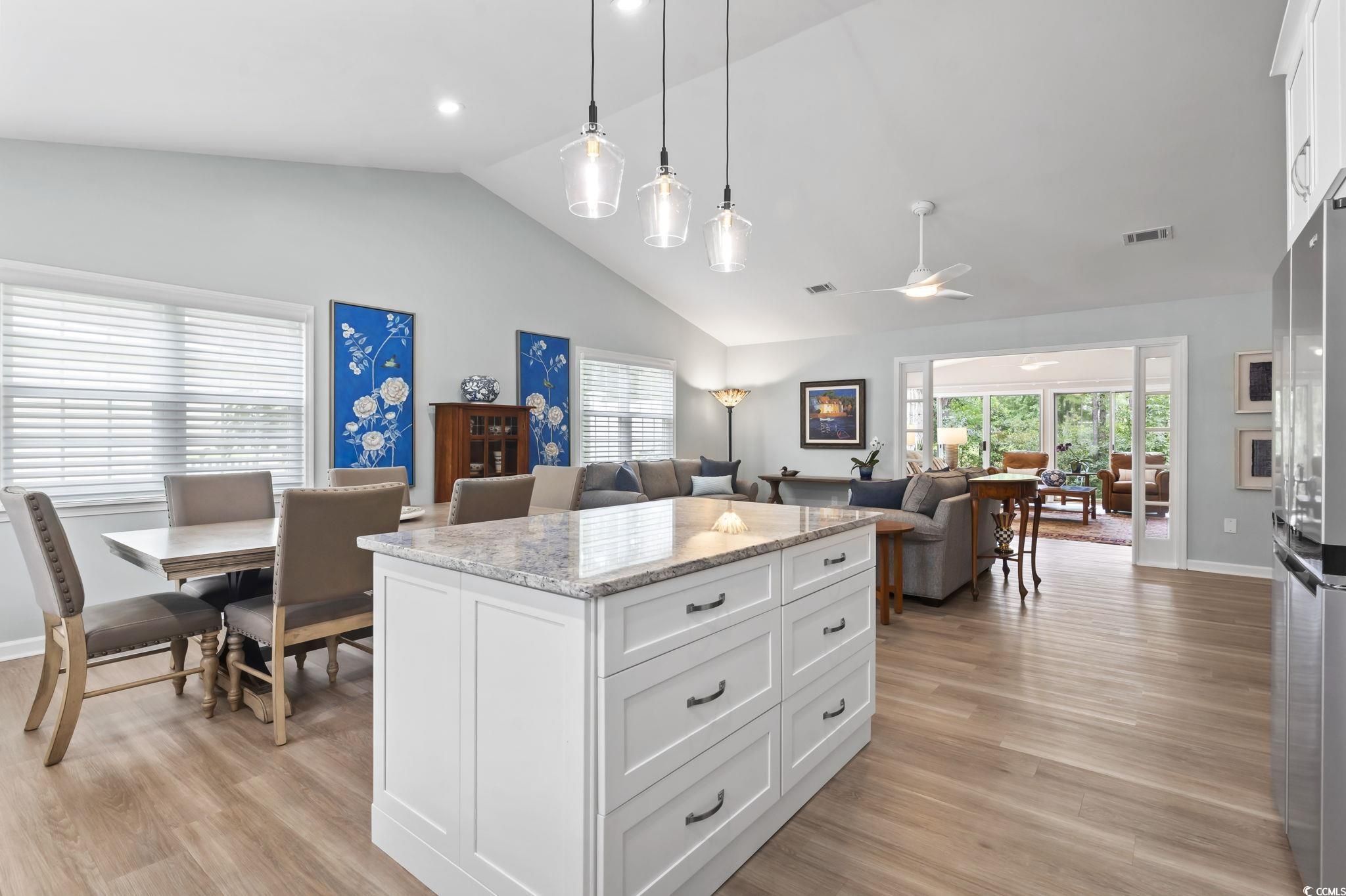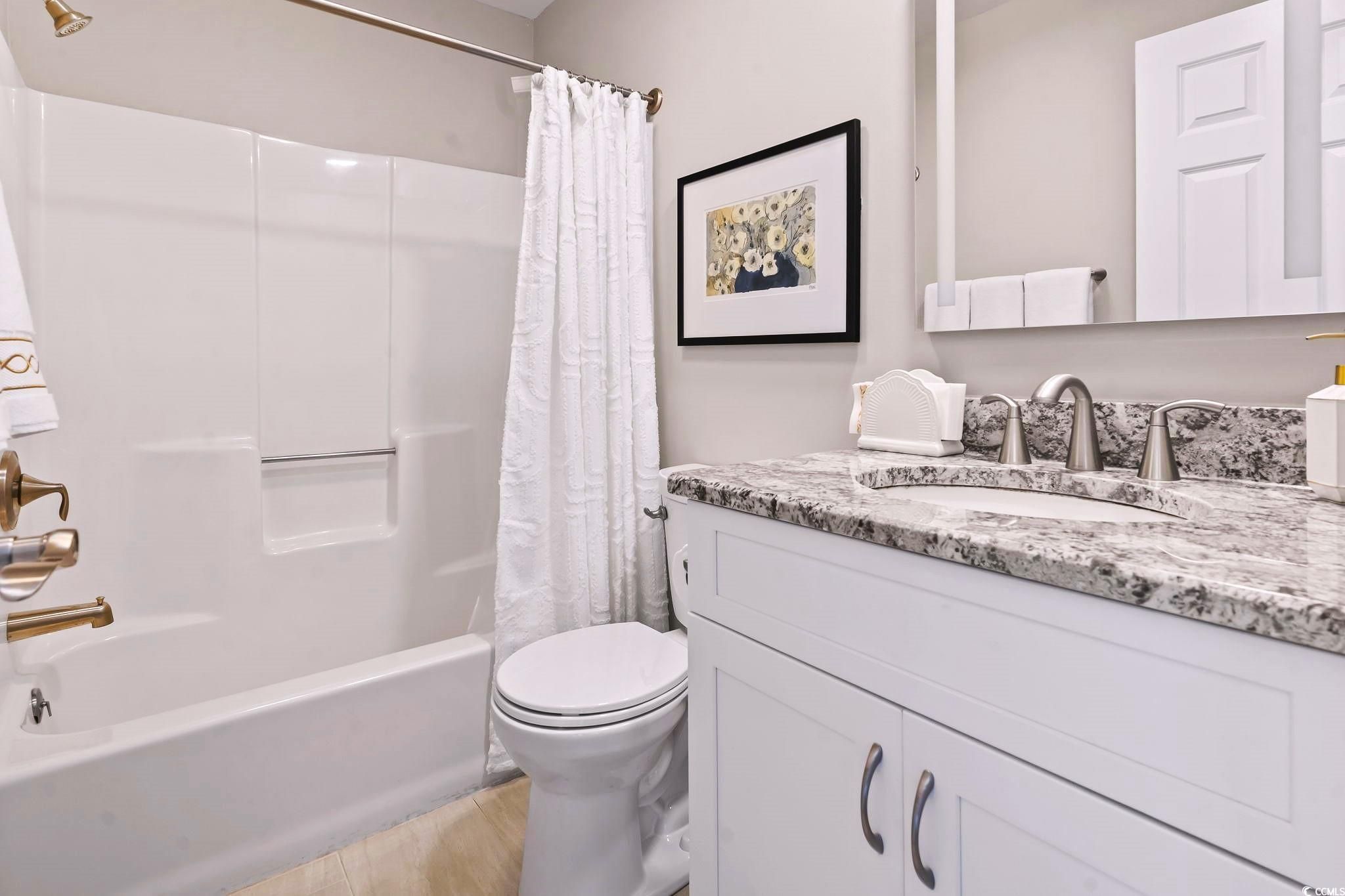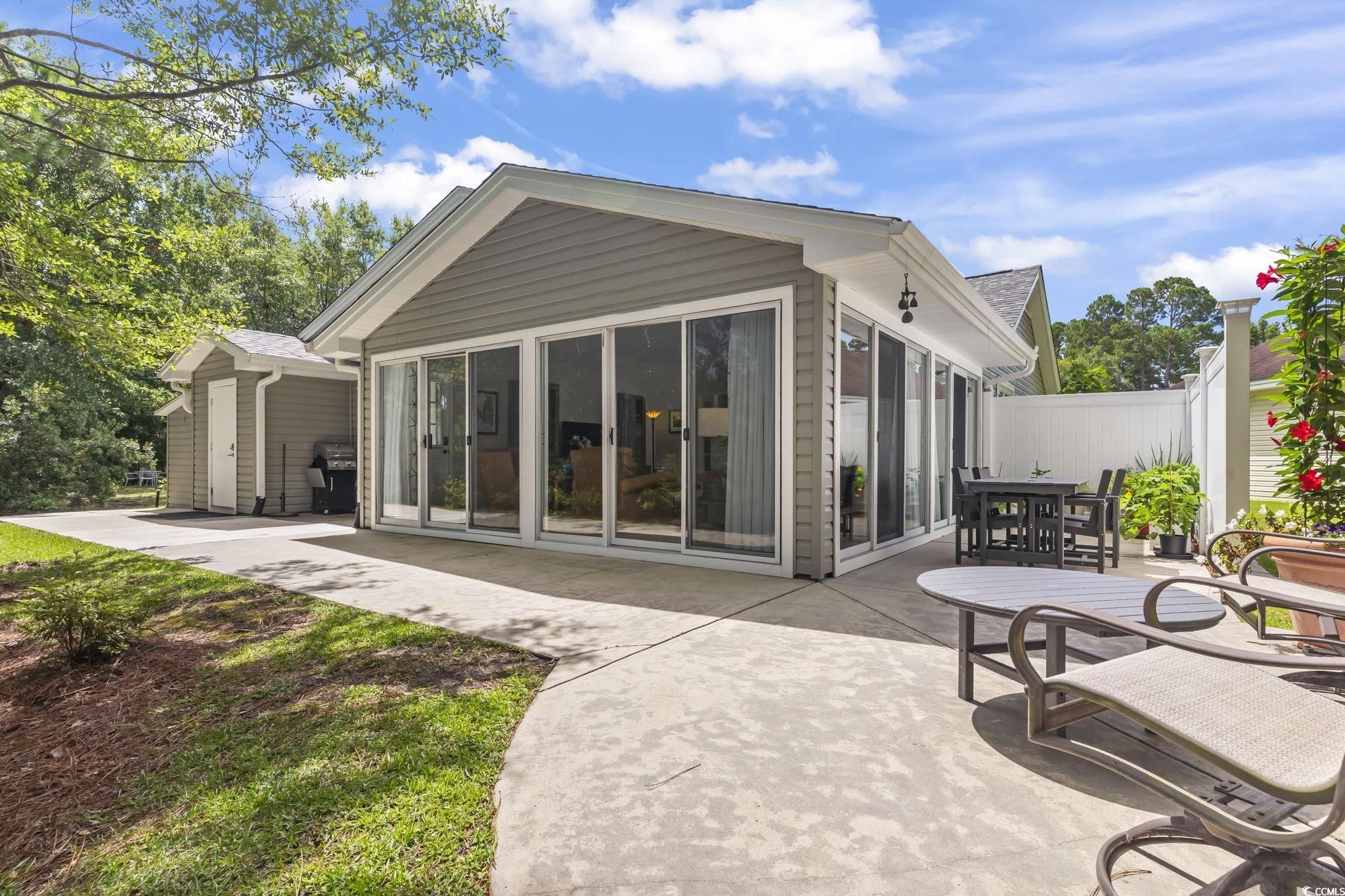 Nestled in a quiet cul-de-sac in Myrtle Beach Golf and Yacht Club, this beautiful three-bedroom, two-bath home features an open-floor plan, with a stunning kitchen and cathedral ceiling. The main living area flows into a 20’ x 20’ four-season Carolina room, where two walls of sliding glass doors offer a beautiful nature view of a park-like backyard that borders HOA-owned, dedicated “green” land. This home offers the benefit of extensive recent renovations, combined with an established neighborhood, mature trees and shrubs, and amenities including the security of a 24/7 staffed entry gate. Outside, premium vinyl siding, upgraded architectural roof shingles, and gutter guards were installed in 2023. A patio surrounds the full back of the home, providing a great place for outdoor entertaining. The built-in storage shed, with a handy utility sink and shelving, is accessed from the patio. The kitchen is stunning, and a chef’s delight. It was completely renovated in 2022 with quality-brand stainless-steel appliances, lots of functional cabinets, granite countertops, and a large island with built-in storage. The adjacent dining area features a built-in buffet server with storage. Luxury vinyl flooring was installed throughout the home in 2022, except for the tiled bathrooms. Both bathrooms have been recently updated, with new tile, vanities, granite counters, and fixtures. The primary bedroom suite is separate from the other two bedrooms, and offers a raised ceiling and en suite bath with a tiled, walk-in shower. The large walk-in closet features a custom closet system. The HVAC heat pump system was replaced in 2022, and the hot water heater in 2024. A full-capacity smart washer/dryer tower was installed in 2023, along with custom shelving. Major appliances, custom window treatments, and ceiling fixtures shown in the listing photos will come with the home. Owners’ other furnishings and electronics are not part of the sale, and have been changed since the photos were taken. Myrtle Beach Golf and Yacht Club is an established, gated community with lots of amenities, including a pool, hot tub, playground, picnic area, pavilion, clubhouse, and tennis and shuffleboard courts. There’s even the option of a separate storage area on premises for RVs and trailers through the HOA. Myrtle Beach Golf and Yacht is a short drive from the beautiful ocean beaches of the area, and a boat ramp for the Intracoastal Waterway is close by. Plus, it’s centrally located to take advantage of the many options for golfing, dining, entertainment, and shopping nearby in Myrtle Beach and surrounding communities!