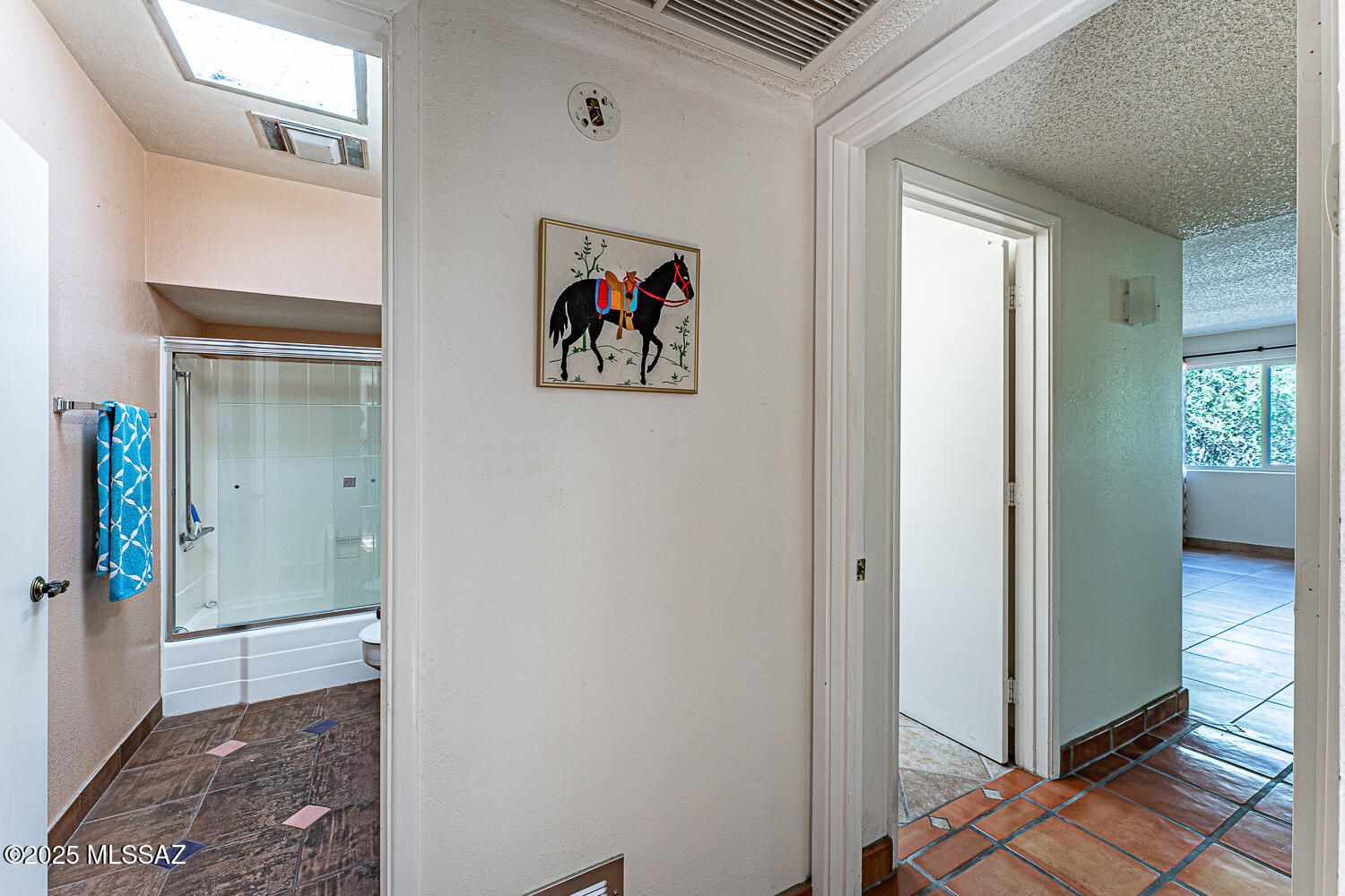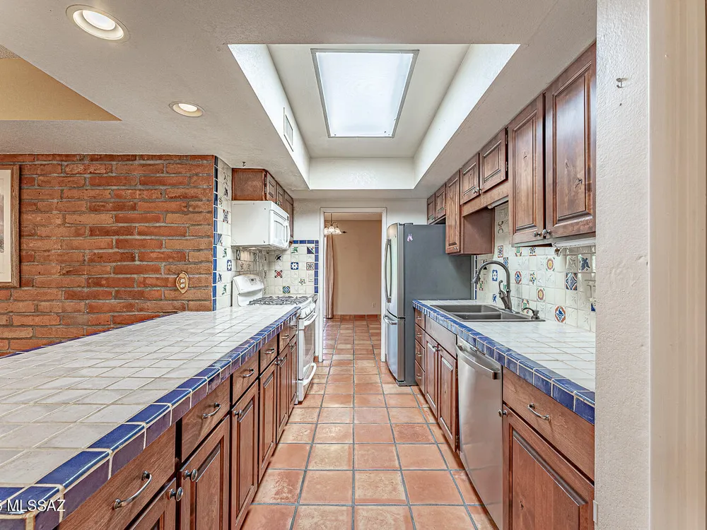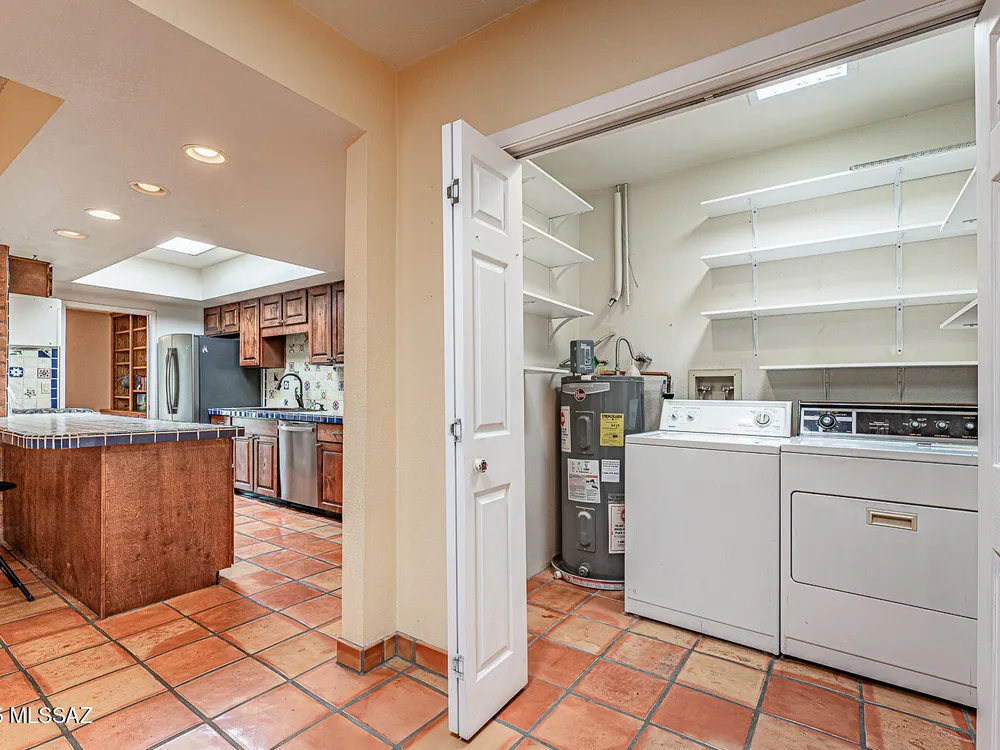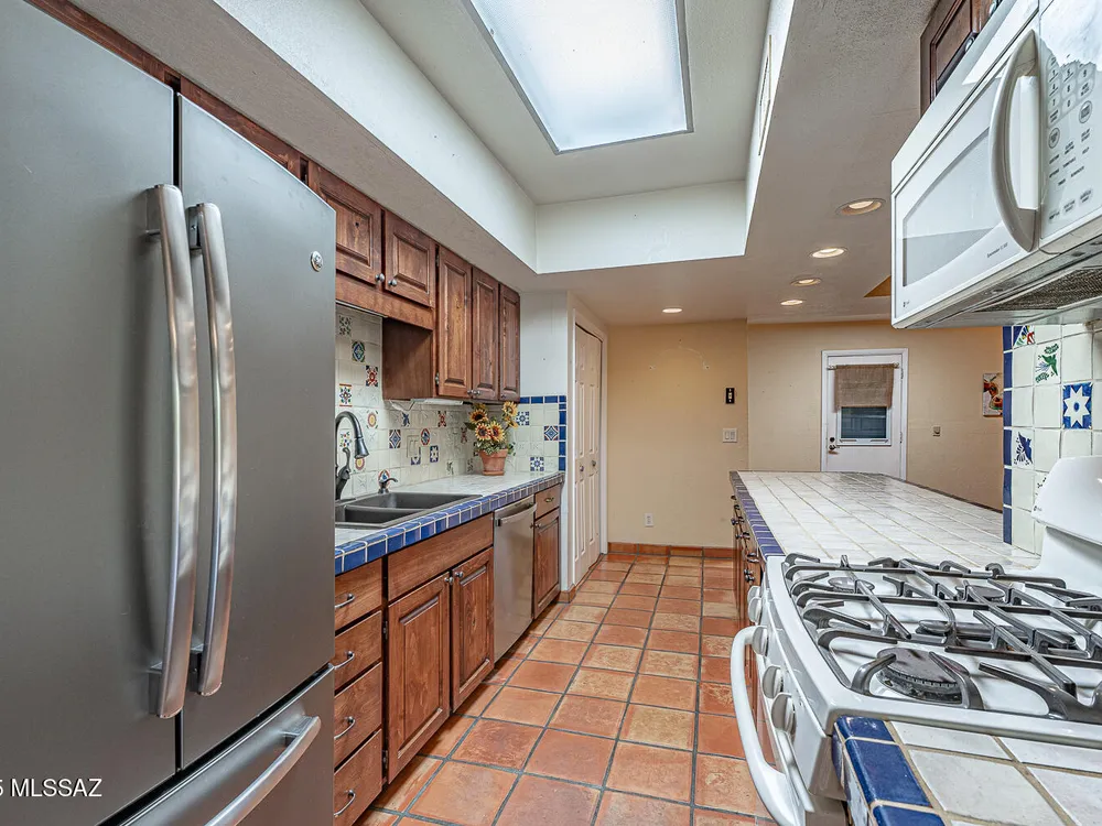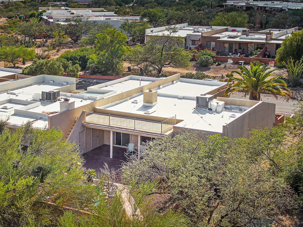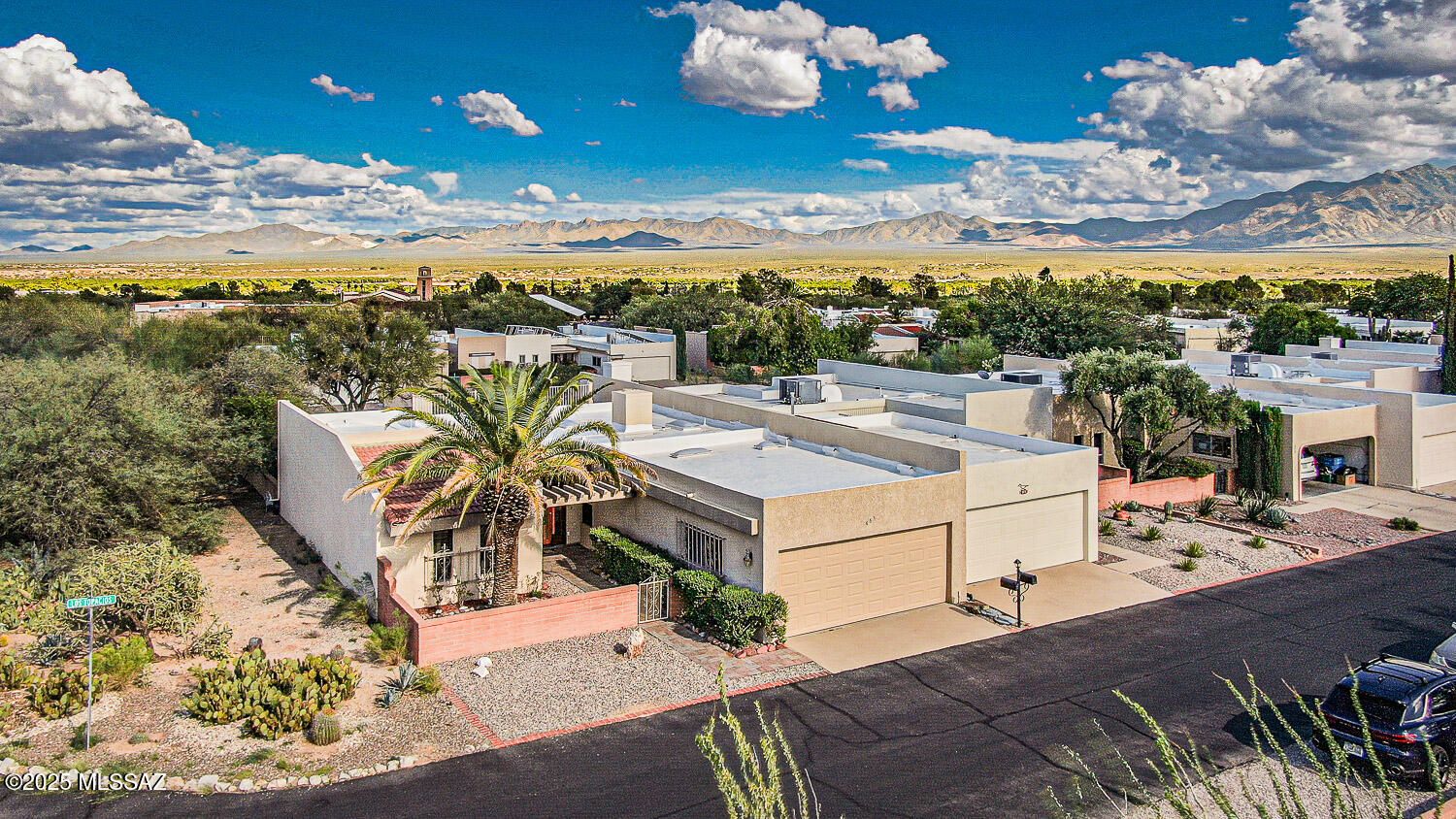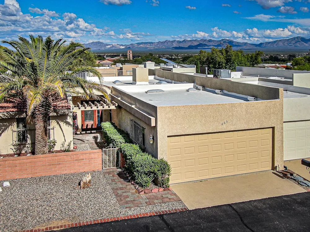 Welcome to your new home in coveted Townhouse VI! Enter this end-unit gem through gorgeous beveled glass doorway with matching side panel! Gleaming saltillo tile brings you into the light-filled GreatRoom. Colorful ceramic tiled counters in kitchen/baths with rich aspen wood cabinetry! Laundry closet off kitchen in spacious family/tv/den room. Grab a quick lunch at the counter or sit down for more formal dining in GrtRm area. Wonderful wood built-in area with adjustable shelves for books and treasures with cabinets below for your old photo albums, etc.!! Covered patio with water feature and magic views to the mountains! Unique stairway to the roof for evenings in the stars! Large 2-car garage! Neighborhood has 22 common area acres with trails and benches. Delightful!!