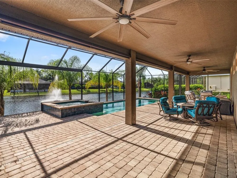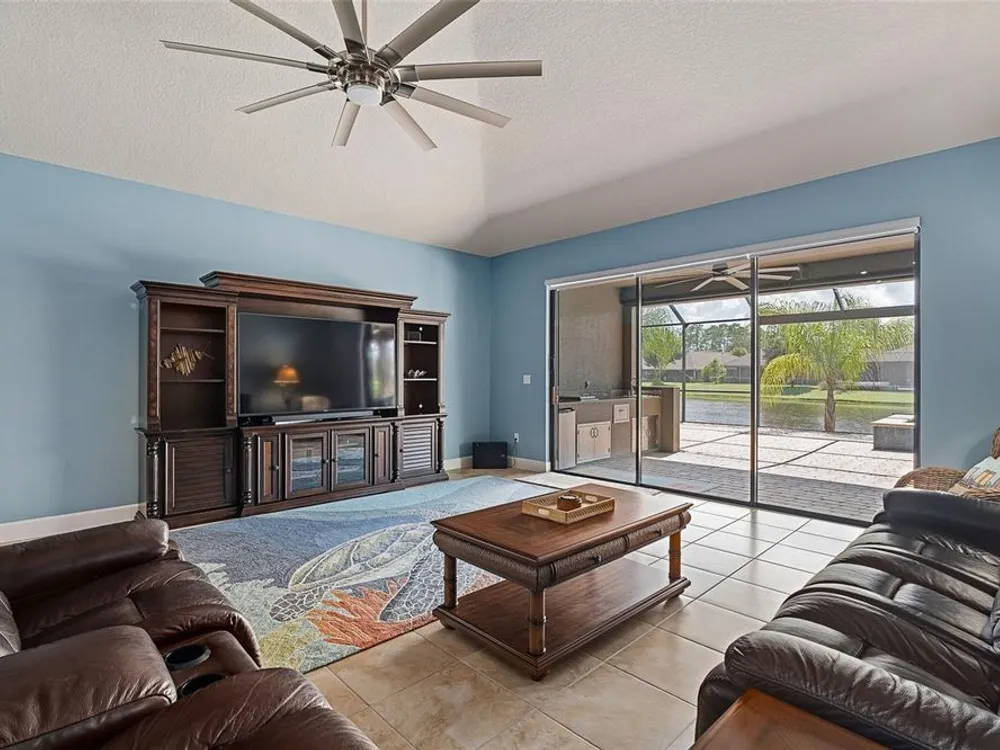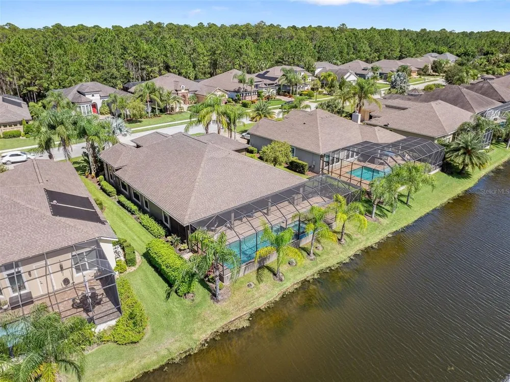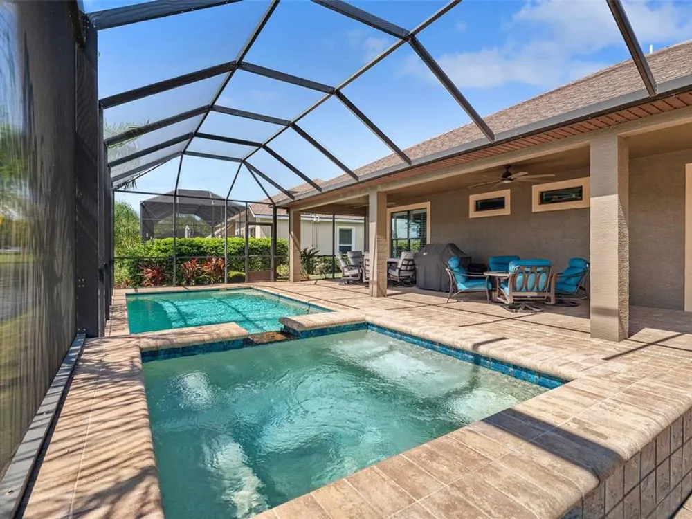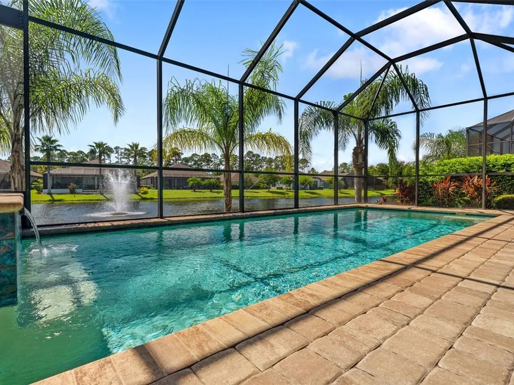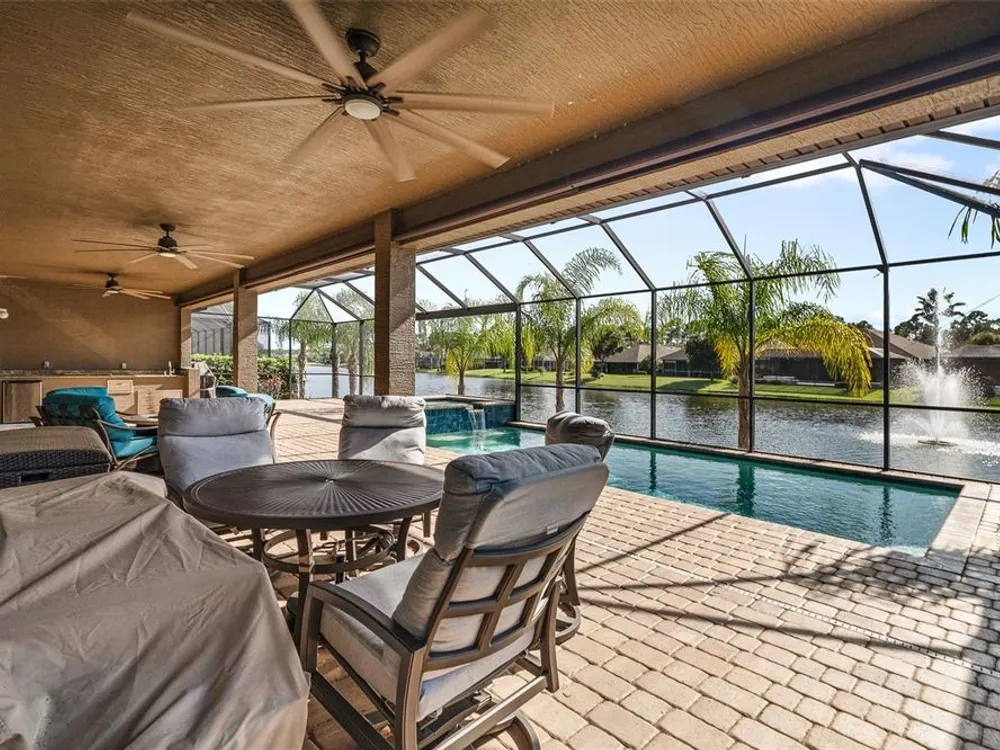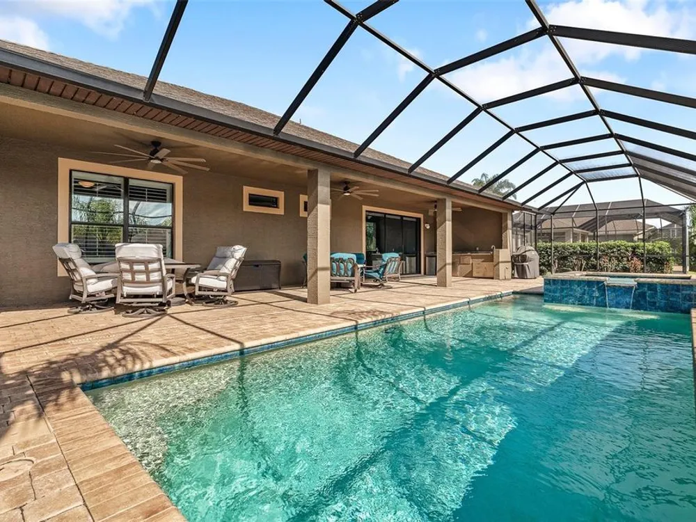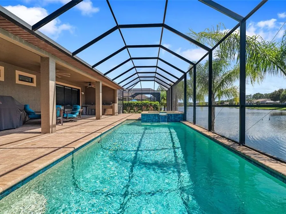 Welcome to this beautifully maintained executive POOL home in the prestigious Plantation Bay Golf & Country Club. From the moment you arrive, the pavers driveway and double glass door entry set the stage for a grand interior filled with light, elegance, and upgrades. Step inside to soaring ceilings with tray and crown details, leading into an open floor plan perfect for both everyday living and entertaining. The deluxe kitchen features built-in GE stainless steel appliances, granite countertops, 42-inch wood cabinetry, tile backsplash, reverse osmosis system, a spacious island, and a large walk-in pantry. Adjacent breakfast nook with plantation shutters and a formal dining room with vaulted ceilings provide ideal spaces for gatherings. The family room impresses with tile floors, high ceilings, and triple sliders with electric blinds that open seamlessly to the lanai capturing the perfect pool and lake views. . The primary suite is a true retreat with views of the pool and lake, grand in size, double walk-in closets, and a spa-like ensuite with dual sinks and a walk-in tile shower. Two additional bedrooms offer comfort for family or guests, each with plantation shutters, large in size, and generous storage. Bedroom 3 has a beautiful curved wall of bay windows overlooking your perfectly manicured front lawn. Outdoor Living at Its Best! The showstopper of this home is the screened lanai and pool oasis, overlooking the lake and lighted fountain for breathtaking views day and night. Enjoy the sparkling pool with ozone system and Jacuzzi with propane heater, or entertain in style with the outdoor kitchen featuring sink, fridge, ice chest, and granite countertops. Pavered decking and a mega-screen enclosure complete this resort-style retreat. Additional highlights include a 3-car extended garage with epoxy flooring, built-in shelving, hybrid hot water heater (2021), whole-house Kinetico water filtration system, surge protection, NEW AC (2024), and updated Minka lighting. Enjoy the unmatched lifestyle of Plantation Bay Golf & Country Club-golf cart friendly community, offering optional membership packages with 45 holes of championship golf, two clubhouses with dining-one being brand new 30 million clubhouse, wellness and spa center, fitness, 9 tennis courts, 10 pickleball courts, a resort-style pool and lap pool, cabana bar and grill, walking trails, and full activities calendar! Buyers of this home to receive a substantial discount on initiation fee at the club. Ask listing agent for details. This home is truly clean as a whistle, move-in ready, and perfectly designed to enjoy Florida living at its finest.