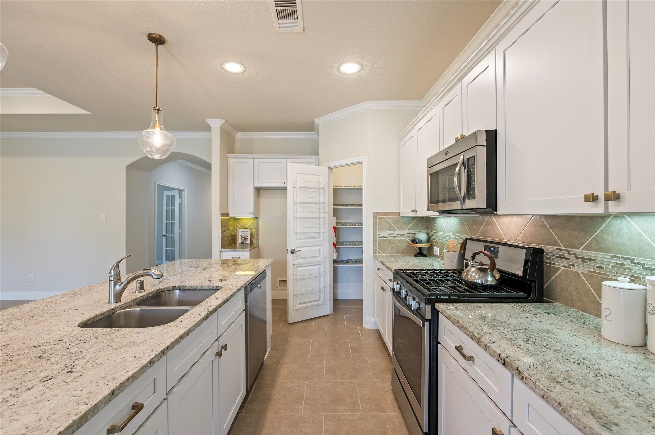 - Breakfast Bar, Crown Molding, Double Vanity, Entrance Foyer, Granite Counters, Handicap Access, High Ceilings, Kitchen Island, Kitchen/Family Room Combo, Pots & Pan Drawers, Pantry, Tub Shower, Walk-In Pantry, Ceiling Fan(s)