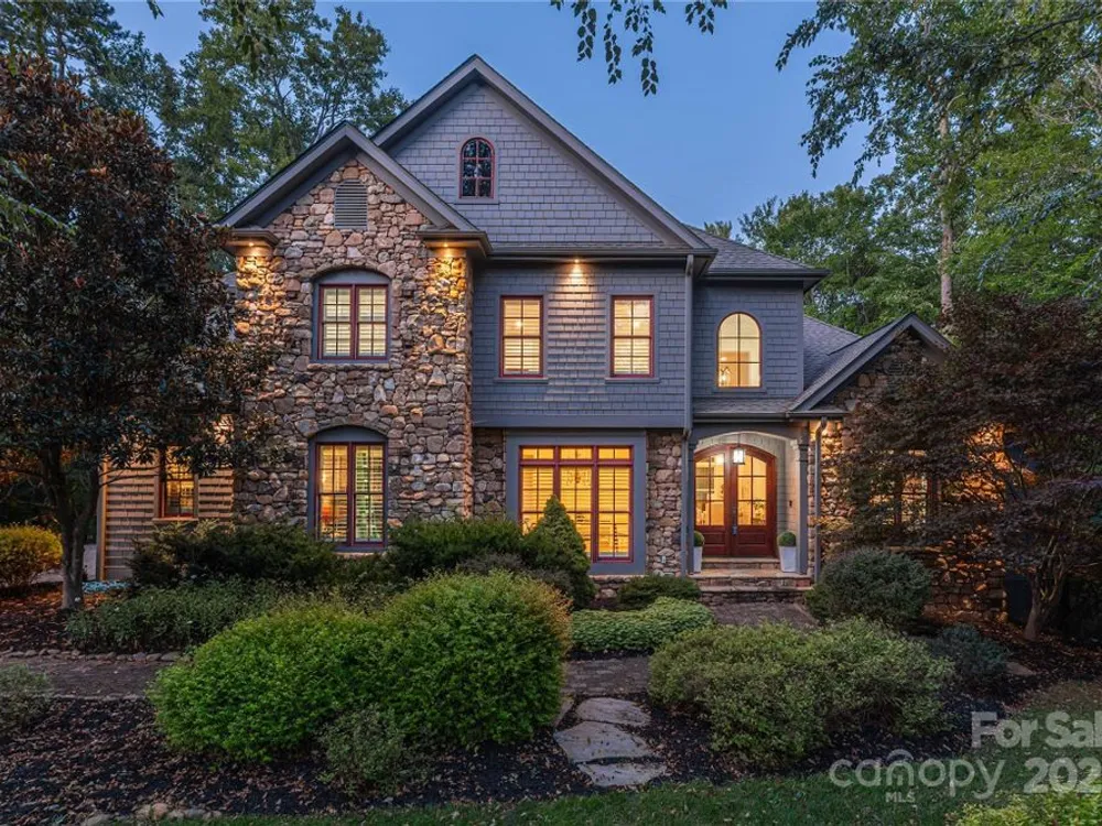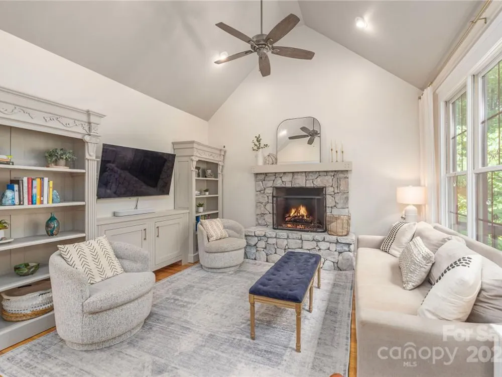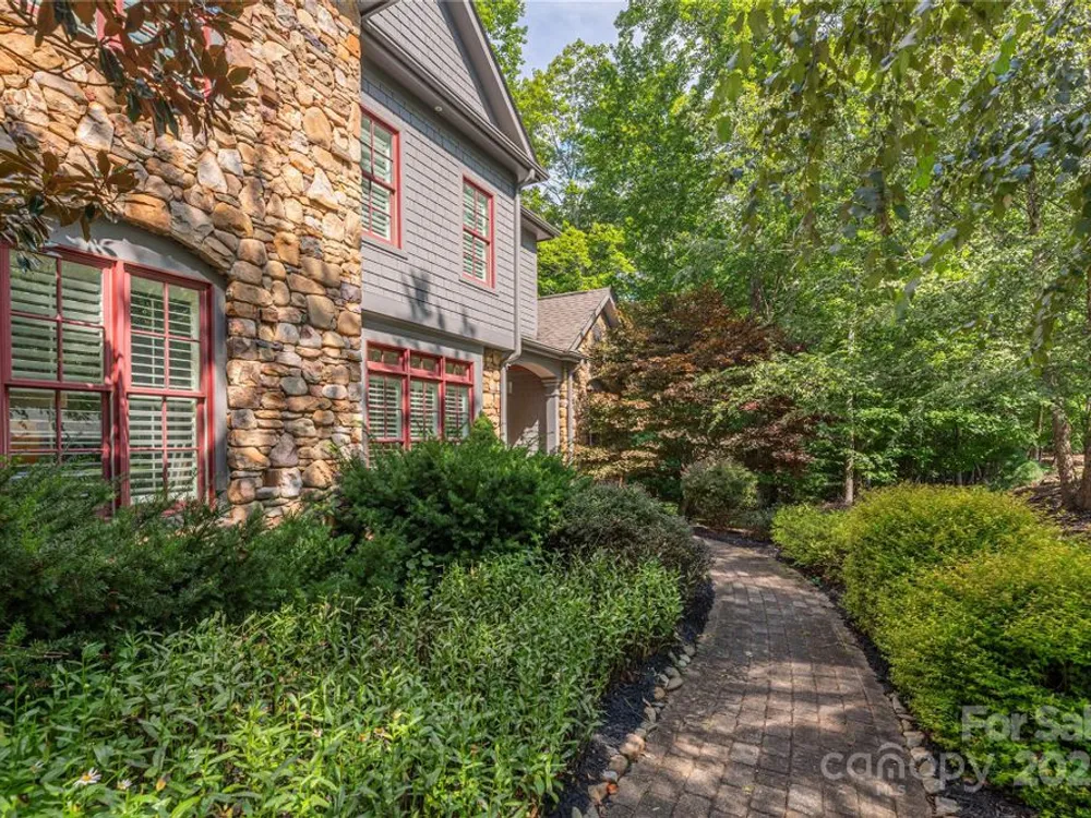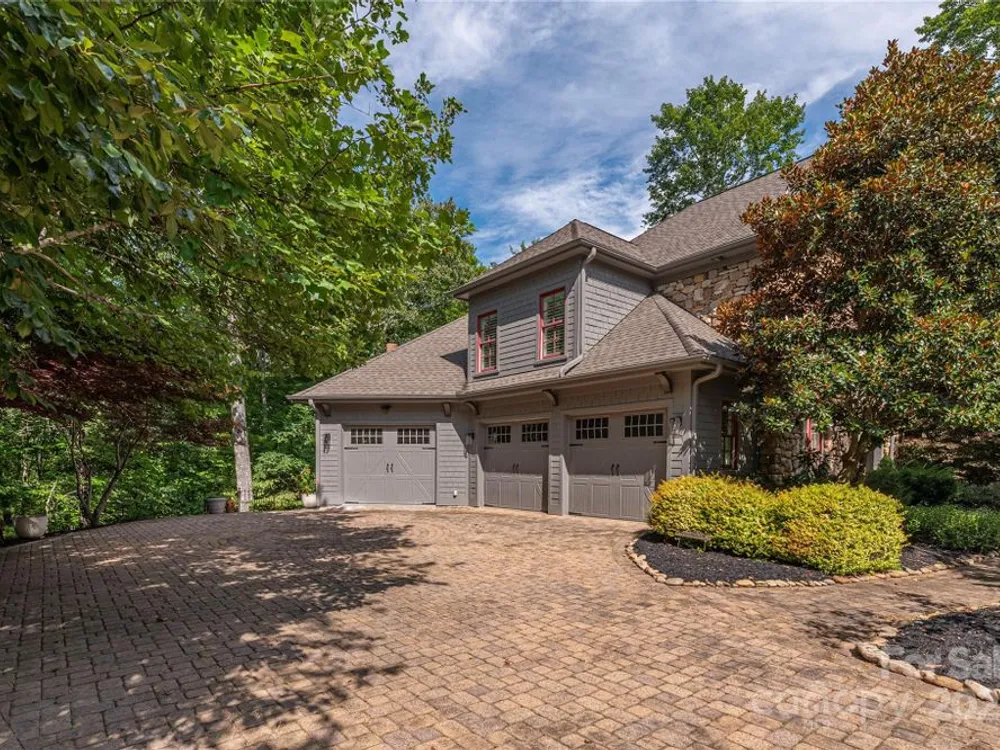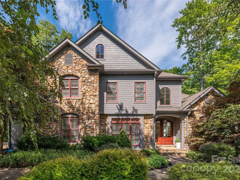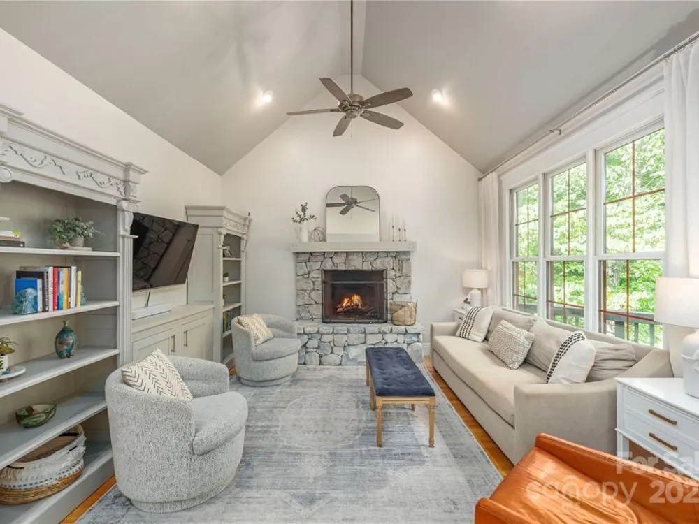 An elegant, custom-built spacious sanctuary awaits you in gated Scotts Ridge at Biltmore Lake. Set on a lushly wooded 1.3-acre property, this striking home offers the perfect retreat after days on the lake, trails, or lakeside courts. A wide front porch invites you to step inside, where you’ll be greeted by soaring ceilings and two tiers of windows that flood the main level with light. Hardwood floors connect a welcoming living room anchored by a gas fireplace to a dining room, custom kitchen which opens to den with its own striking stone fireplace and eat-in dining area too! A screened porch extends to an open deck, perfect for grilling. The main-level primary suite is a serene haven with a spa-like bath featuring a soaking tub, custom cabinetry, and designer finishes. Upstairs offers three bedrooms, two baths, and a study area, while the lower level provides an expansive guest space with two bedrooms (one is ensuite), two baths, a family room, and kitchen for maximal independence. A versatile mudroom leads to a two-car garage (convertible to three). Outdoors, enjoy a professionally landscaped front lawn, fenced astro turf yard, and a massive stone fire pit with stone steps, set against the woods — ideal for gatherings under the stars.