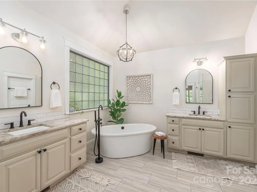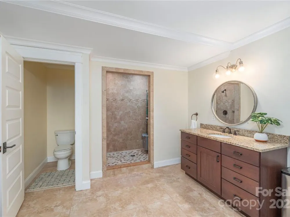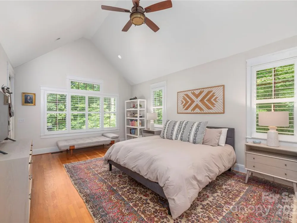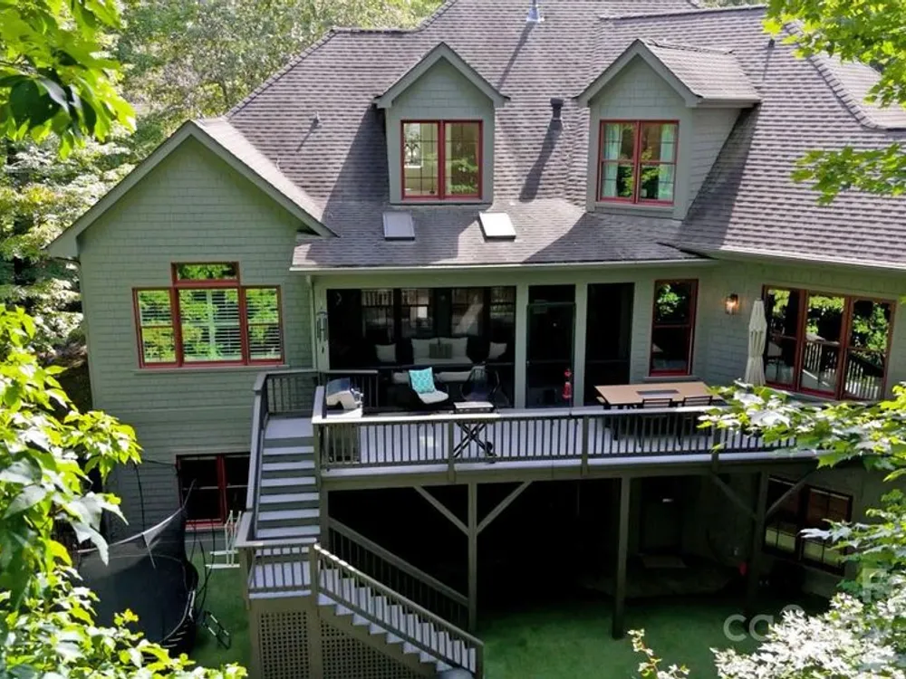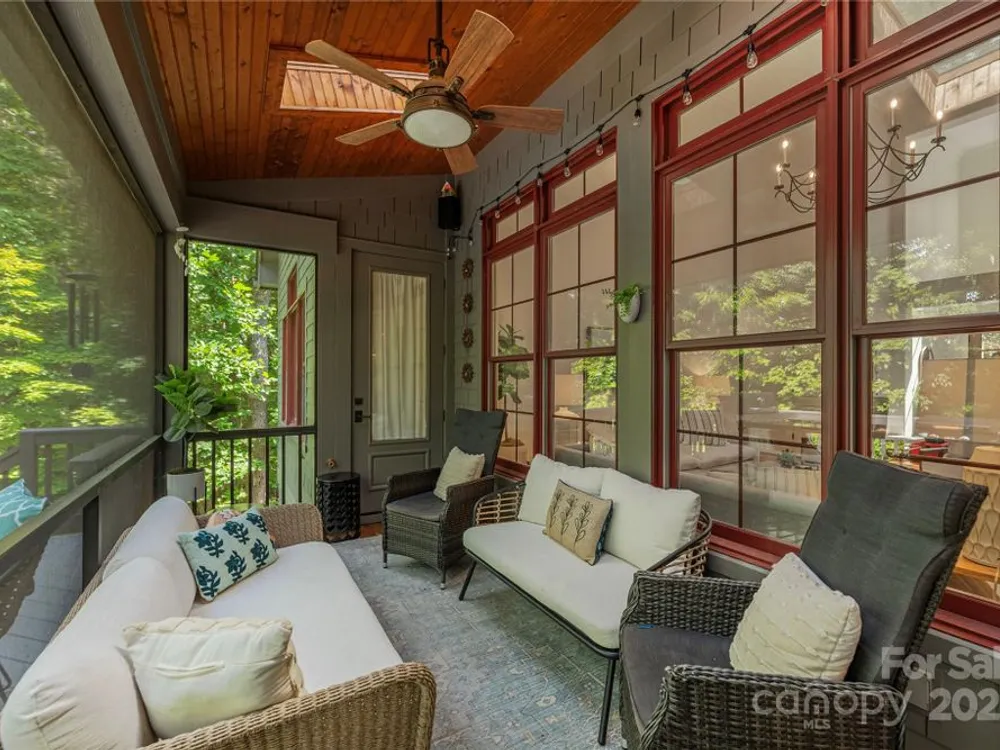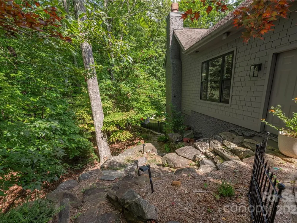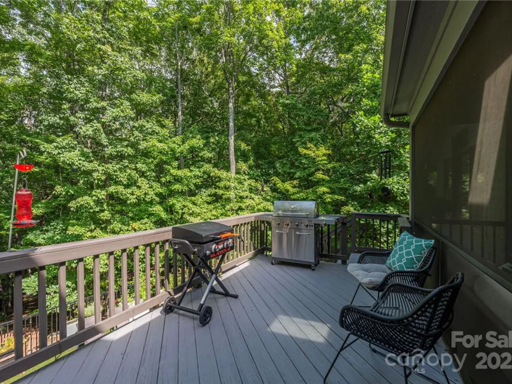 An elegant, custom-built spacious sanctuary awaits you in gated Scotts Ridge at Biltmore Lake. Set on a lushly wooded 1.3-acre property, this striking home offers the perfect retreat after days on the lake, trails, or lakeside courts. A wide front porch invites you to step inside, where you’ll be greeted by soaring ceilings and two tiers of windows that flood the main level with light. Hardwood floors connect a welcoming living room anchored by a gas fireplace to a dining room, custom kitchen which opens to den with its own striking stone fireplace and eat-in dining area too! A screened porch extends to an open deck, perfect for grilling. The main-level primary suite is a serene haven with a spa-like bath featuring a soaking tub, custom cabinetry, and designer finishes. Upstairs offers three bedrooms, two baths, and a study area, while the lower level provides an expansive guest space with two bedrooms (one is ensuite), two baths, a family room, and kitchen for maximal independence. A versatile mudroom leads to a two-car garage (convertible to three). Outdoors, enjoy a professionally landscaped front lawn, fenced astro turf yard, and a massive stone fire pit with stone steps, set against the woods — ideal for gatherings under the stars.