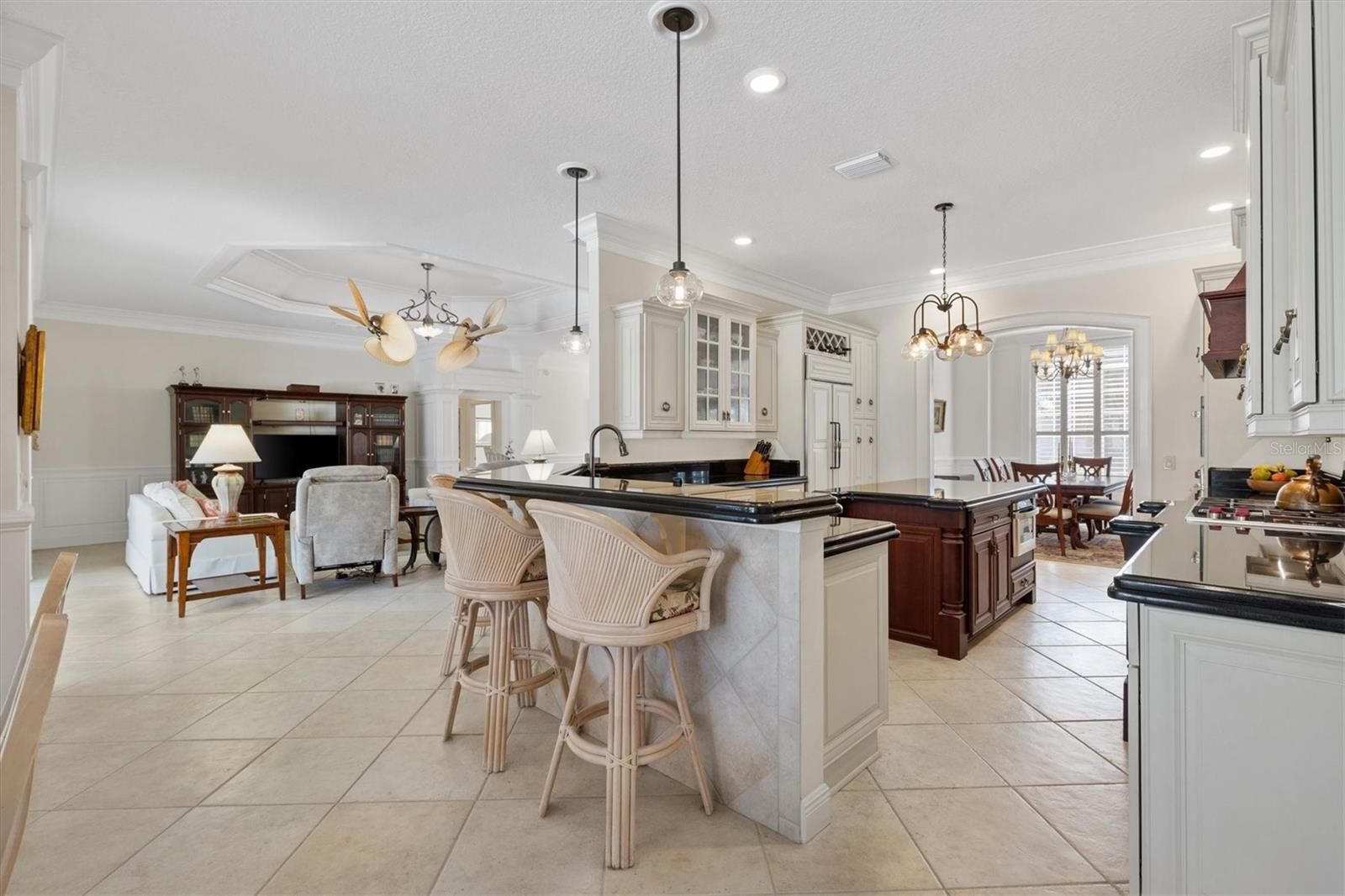 Premier Sanibel Estate in Bridgeport at Lake Sumter Landing Welcome to this exquisite Sanibel model — a True Premier residence offering over 3,000 square feet of refined living space in the highly desirable Bridgeport at Lake Sumter Landing. This stunning three-bedroom, three-bath home combines timeless elegance with modern comfort, creating the perfect setting for both relaxation and entertainment. New Roof 2022, Air Conditioner 2021, Hot Water Heater 2024 Step inside to discover an open, light-filled floor plan showcasing rich crown molding in living room, dining room, den,and primary suite, custom door and window casings, as well as hardwood and designer tile flooring throughout. The chef’s dream kitchen is a true culinary masterpiece, featuring a Wolf gas cooktop with copper pot filler and handcrafted cherry wood hood, a custom built-in Sub-Zero refrigerator, double Wolf wall ovens, and a built-in drawer microwave. The hammered copper farmhouse sink, granite countertops with double waterfall edges, custom cabinetry and custom kitchen island complete this breathtaking space — truly a chef’s delight. The expansive great room flows seamlessly to the outdoor living area, where you’ll find a sparkling pool, fully equipped summer kitchen, and a huge covered lanai designed for year-round enjoyment. Whether hosting guests or enjoying quiet evenings, you’ll love the sweeping golf course and tranquil pond views that make this home a true sanctuary. Each of the three bedrooms offers comfort and privacy, each with it's own bath (one pool planned). The luxurious primary suite features a beautiful tray ceiling with molding, French doors opening to the lanai and pool, hardwood flooring, generous walk-in closet, and a spa-like retreat with a soaking tub, walk in shower, and separate water closet. Located just a short golf cart ride from the Arnold Palmer Championship Country Club and Golf Course as well as Lake Sumter Landing, you’ll enjoy quick access to dining, boutique shopping, grocery stores, medical offices, and all the conveniences The Villages has to offer. This is more than a home — it’s a lifestyle of luxury, comfort, and sophistication in one of the most sought-after locations in The Villages. Make an appointment for your private showing today, before it is gone!! (Most furniture available separately)