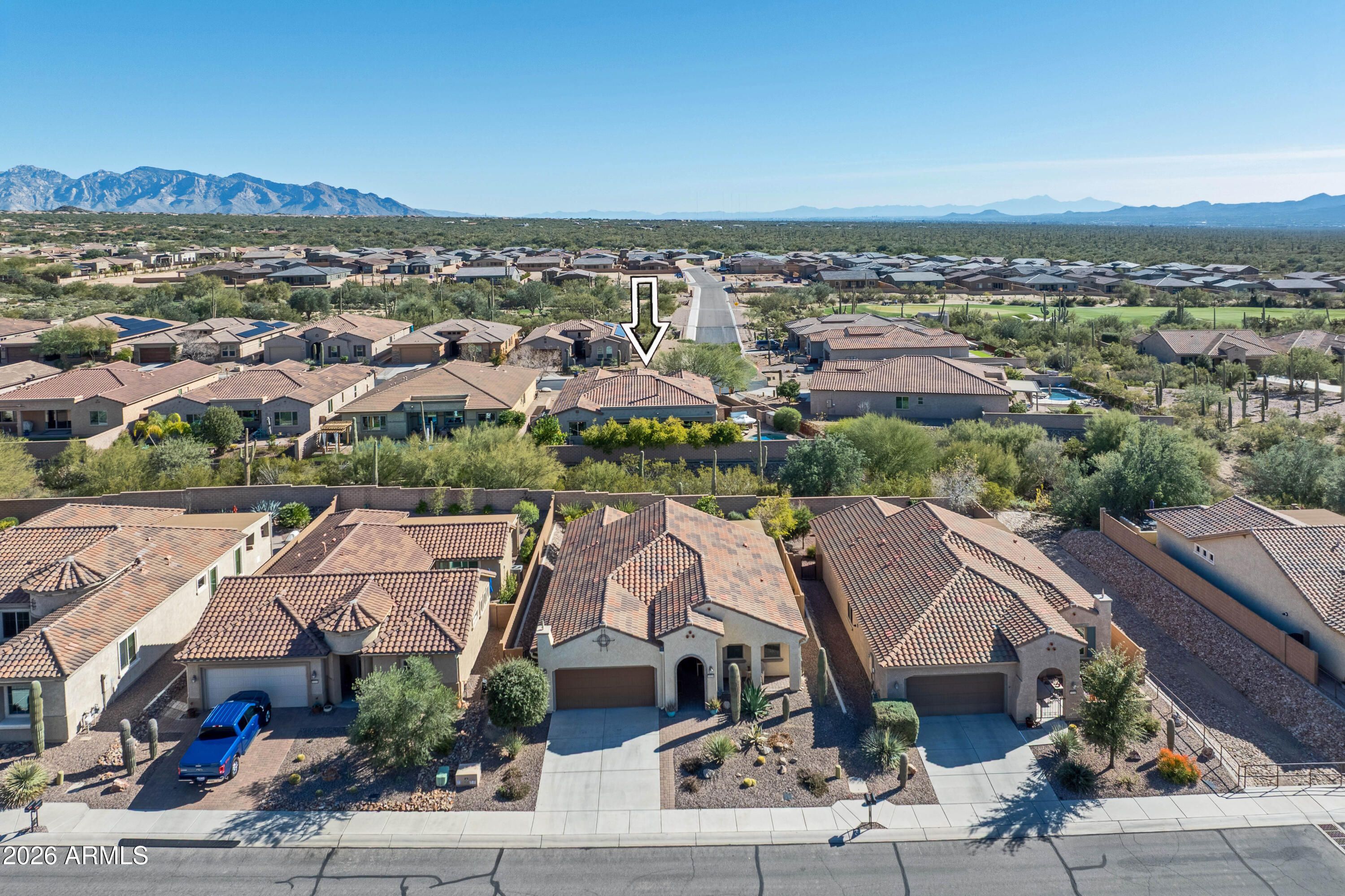 Elegant SINGLE STORY living in the gated Los Saguaros community of Dove Mountain. Set on a NEARLY 10,000 SF CORNER LOT BACKING NATURAL OPEN SPACE, this move-in-ready home offers a sparkling pool, standalone hot tub & striking sunset views. The outdoor oasis features generous sized turf & putting green, outdoor fire pit, mature citrus trees, storage sheds & a fully automated huge screened-in patio-perfect for effortless entertaining. Owner is offering an ASSUMABLE 2.5 % LOAN (approx. $350K balance) AND A FULLY TRANSFERABLE WARRANTY. Inside, nearly 2,400 SF showcases 10' ceilings w/ real wood beams, 8' entry doors & a beautiful wood-burning fireplace w/ built-ins. Hallway entry at garage offers fantastic custom storage built ins and barn door at Laundry. The open-concept layout includes 3 large bedrooms plus 2 private offices (both with doors), 2 full baths, and a 3-car tandem garage. Finishes include porcelain wood-look tile throughout, hardwood flooring in the owner's suite, and carpet in secondary bedrooms and den. The spacious kitchen features granite countertops, double ovens, gas cooktop, French-door refrigerator, microwave, dishwasher, and a huge walk-in pantry. Additional highlights include a well-appointed laundry room with full cabinetry, countertops and sink, whole-house fire suppression, newer HVAC (within 2 years), garage storage racks, cabinets, softener loop, and overhead storage. No work needed in this home just move right in!