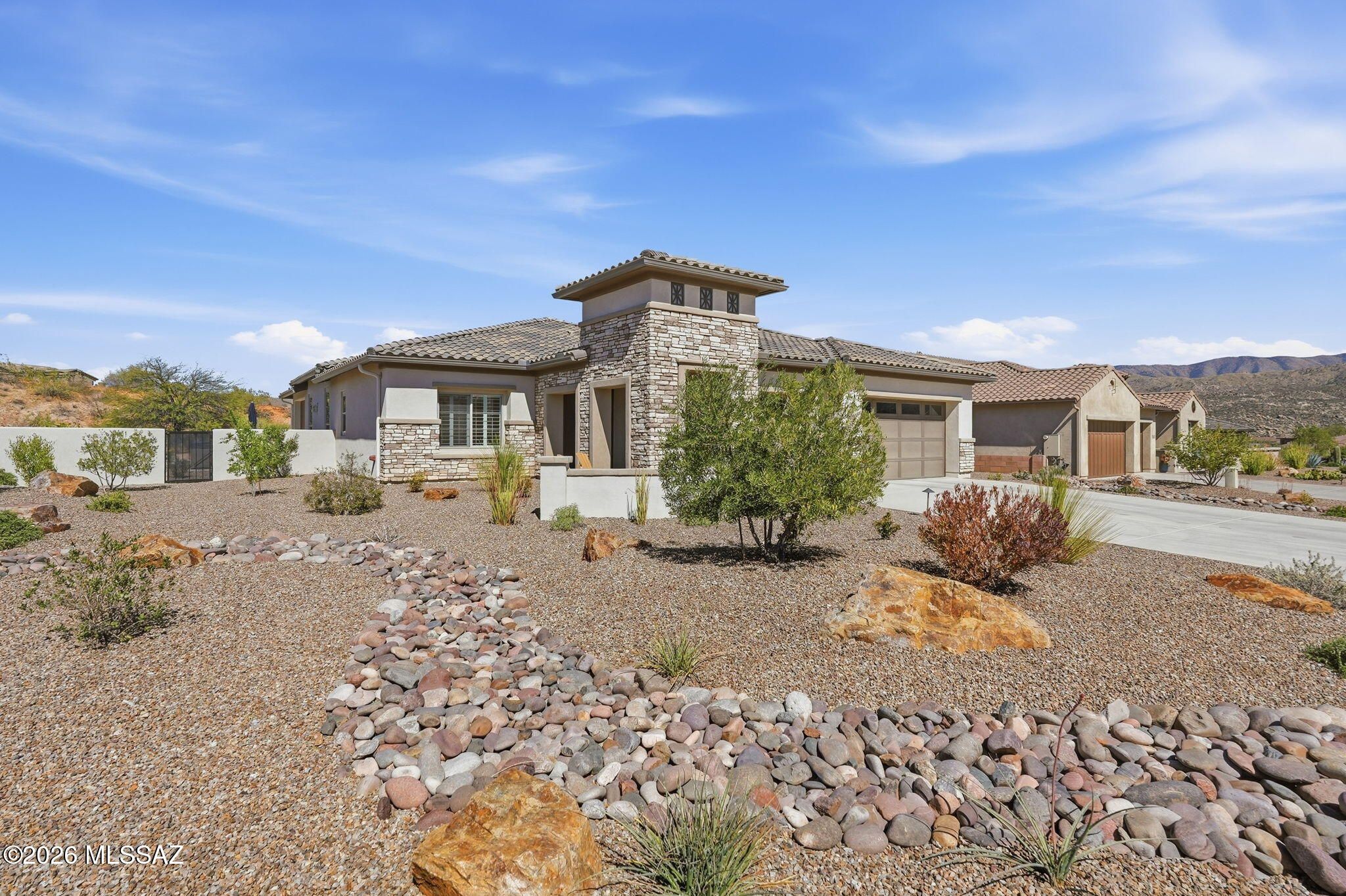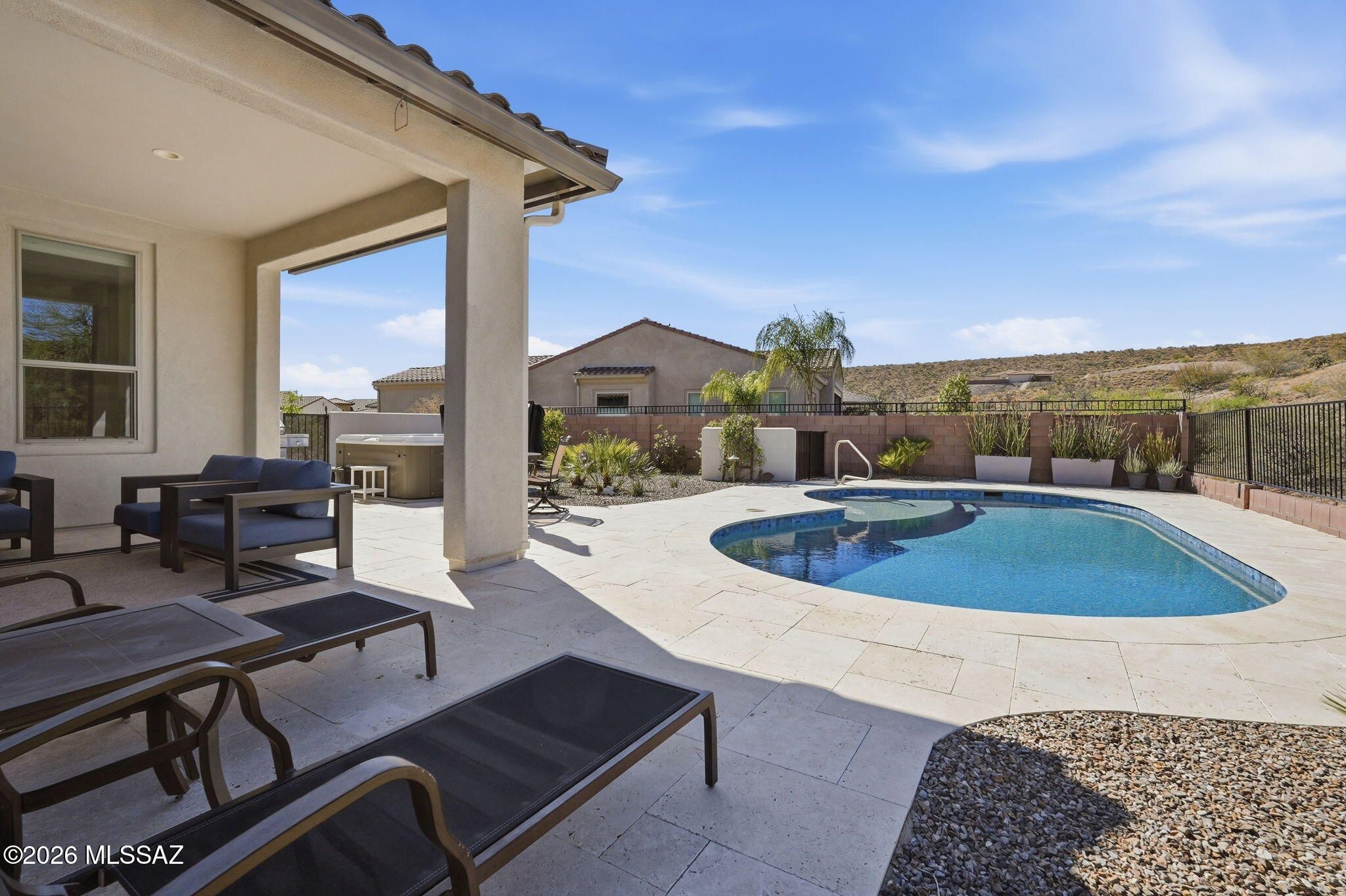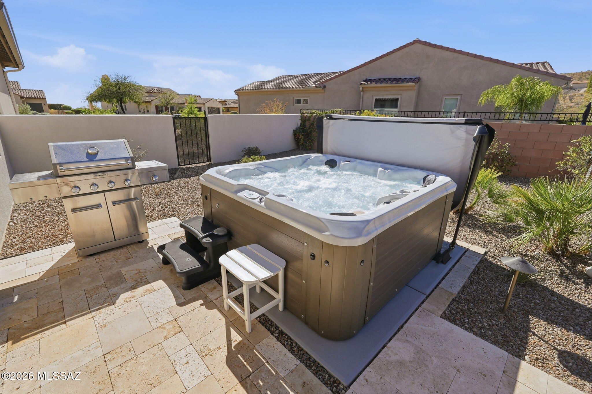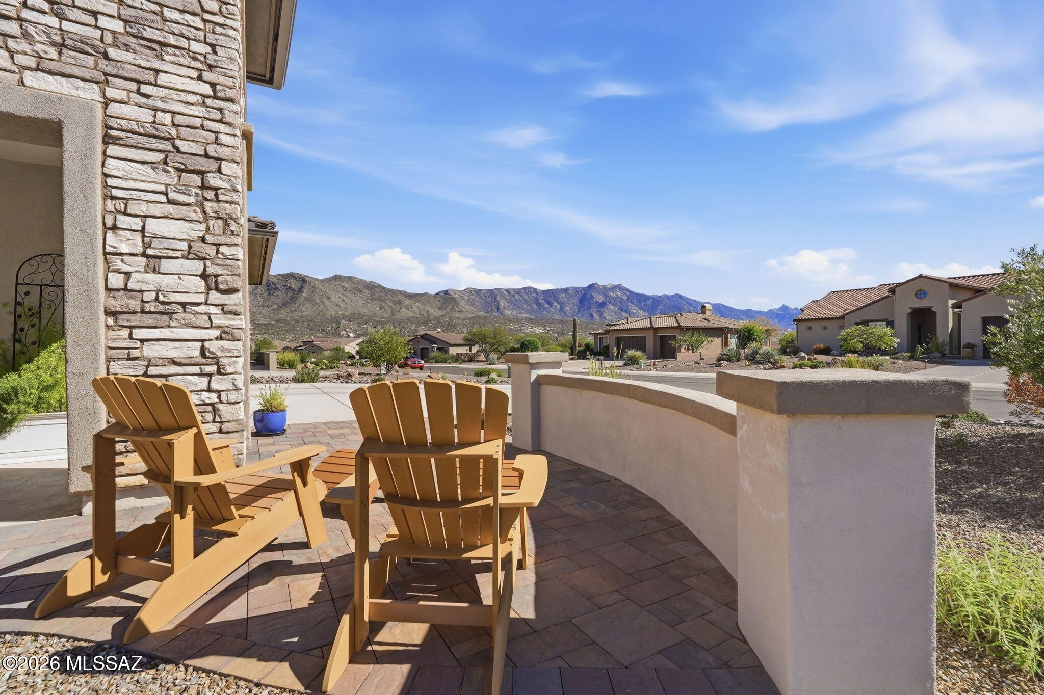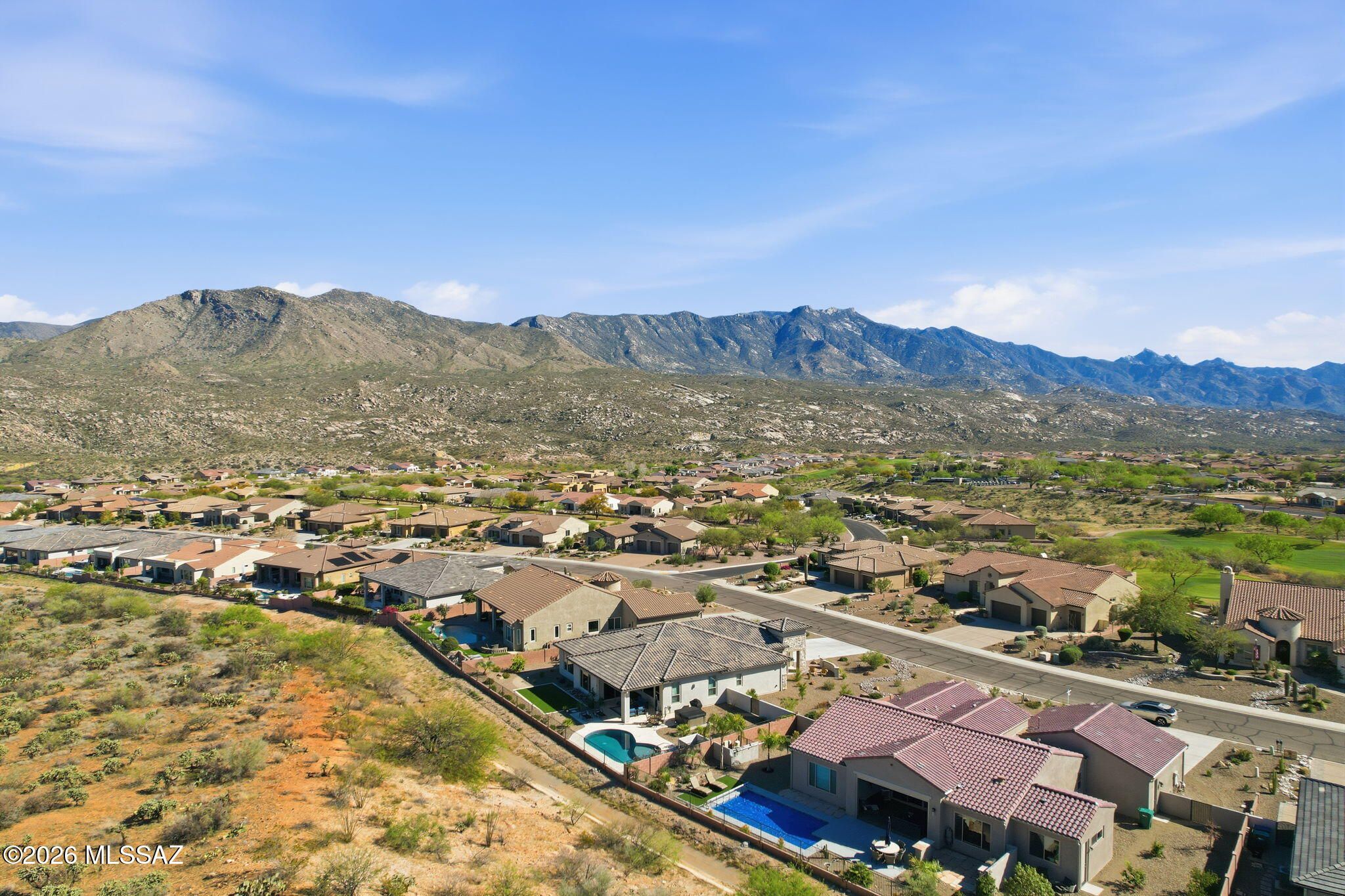 Beautifully appointed and landscaped 2022 home in The Preserve at SaddleBrooke featuring large 1/4 acre lot. Avalon floor plan with gas fireplace in the great room - light and bright living, dining, and kitchen spaces leading out to pool, desert and mountains out back. The backyard is an oasis with a saltwater pool - baja ledge and in-floor cleaning; hot tub, travertine paver patio, and artificial turf. Gourmet kitchen offers a large island, honed marble counters, Wolf, Sub-Zero, and Miele appliances, wine room, butler and walk-in pantries. Large den with plenty of space for relaxing, TV viewing, and desk area. Primary suite boasts a zero-grade shower and large walk-in closet. Guest room with ensuite bath and walk-in closet. Garage has utility sink, epoxy, and smart access door.