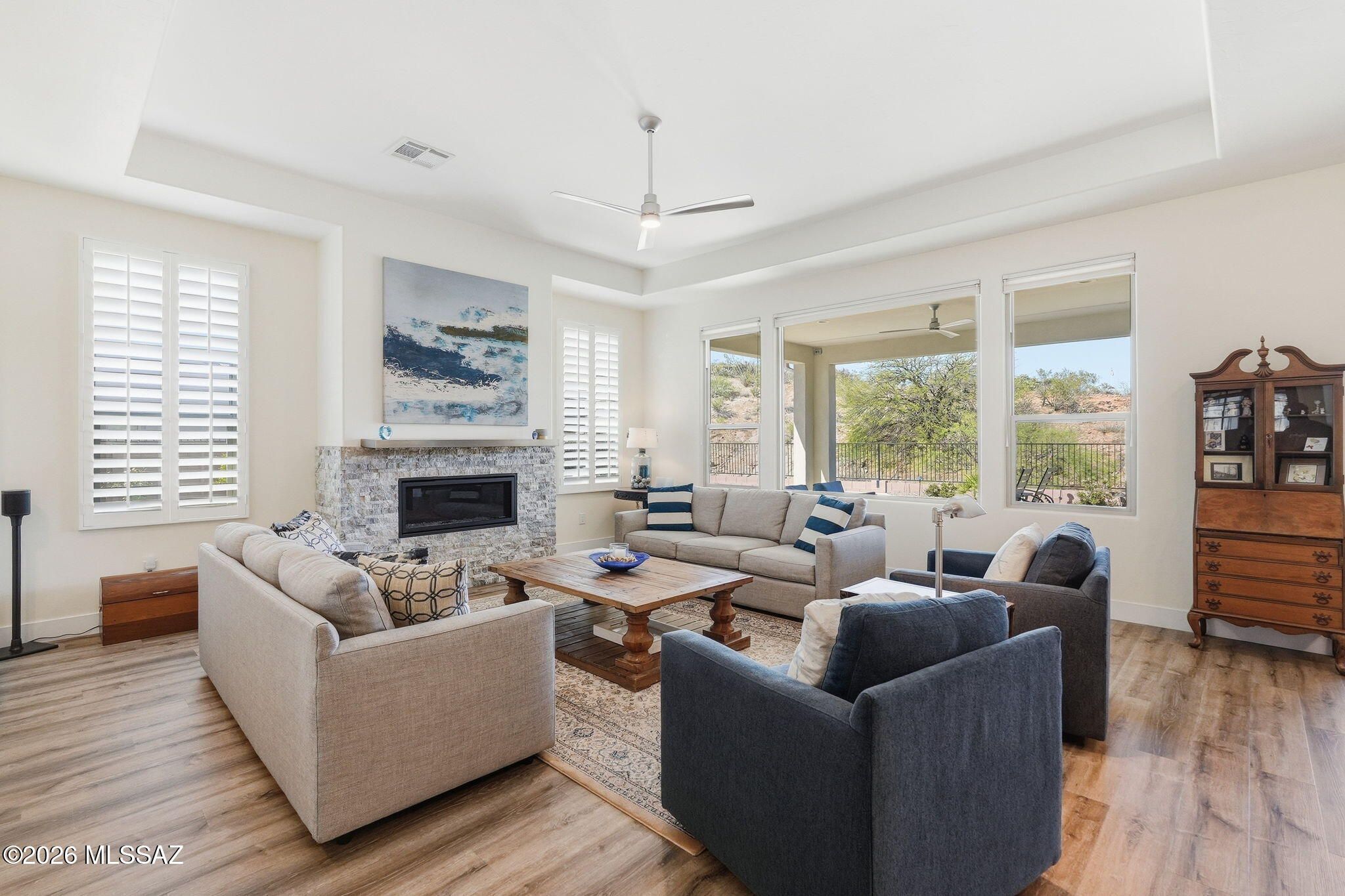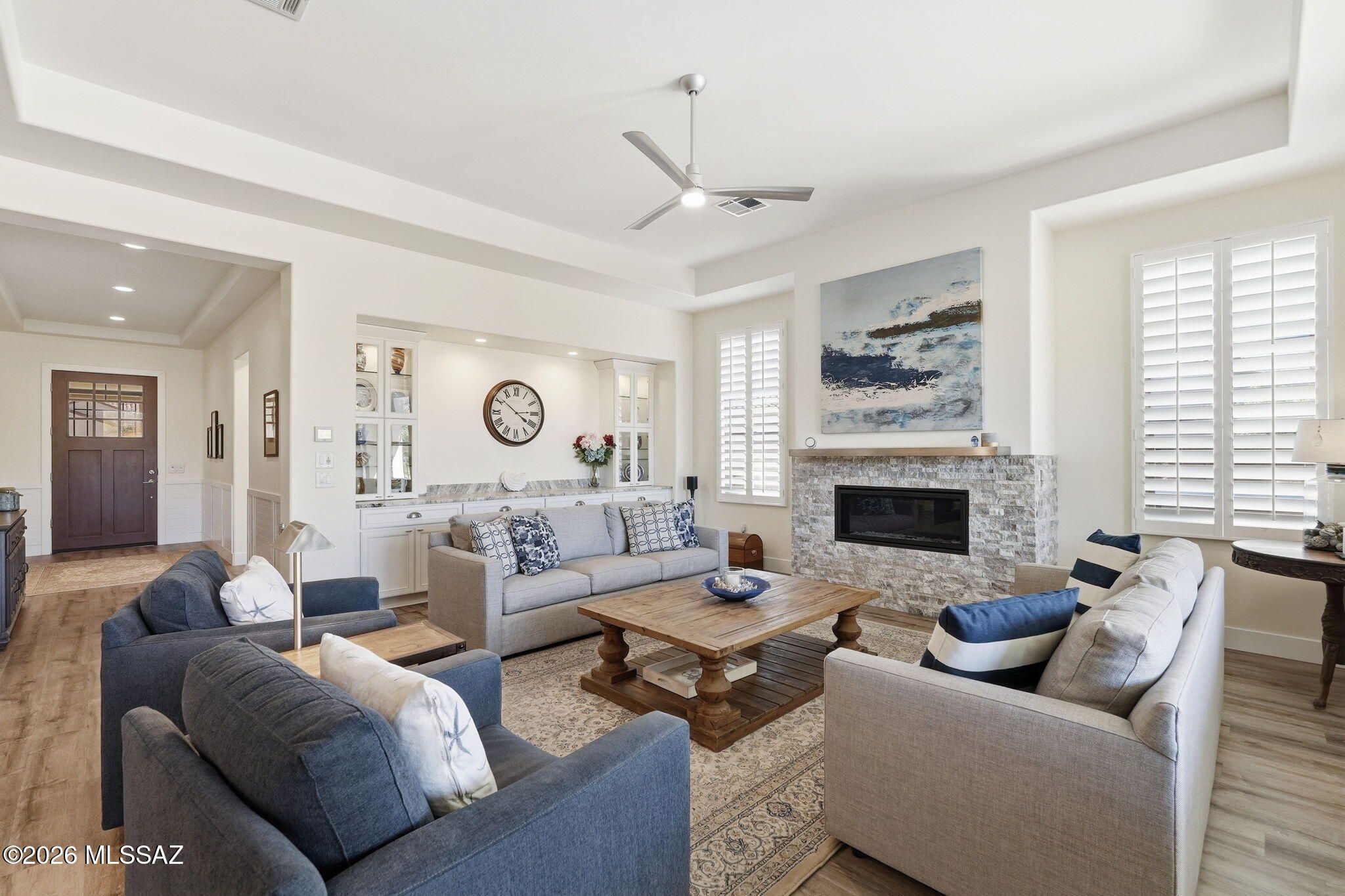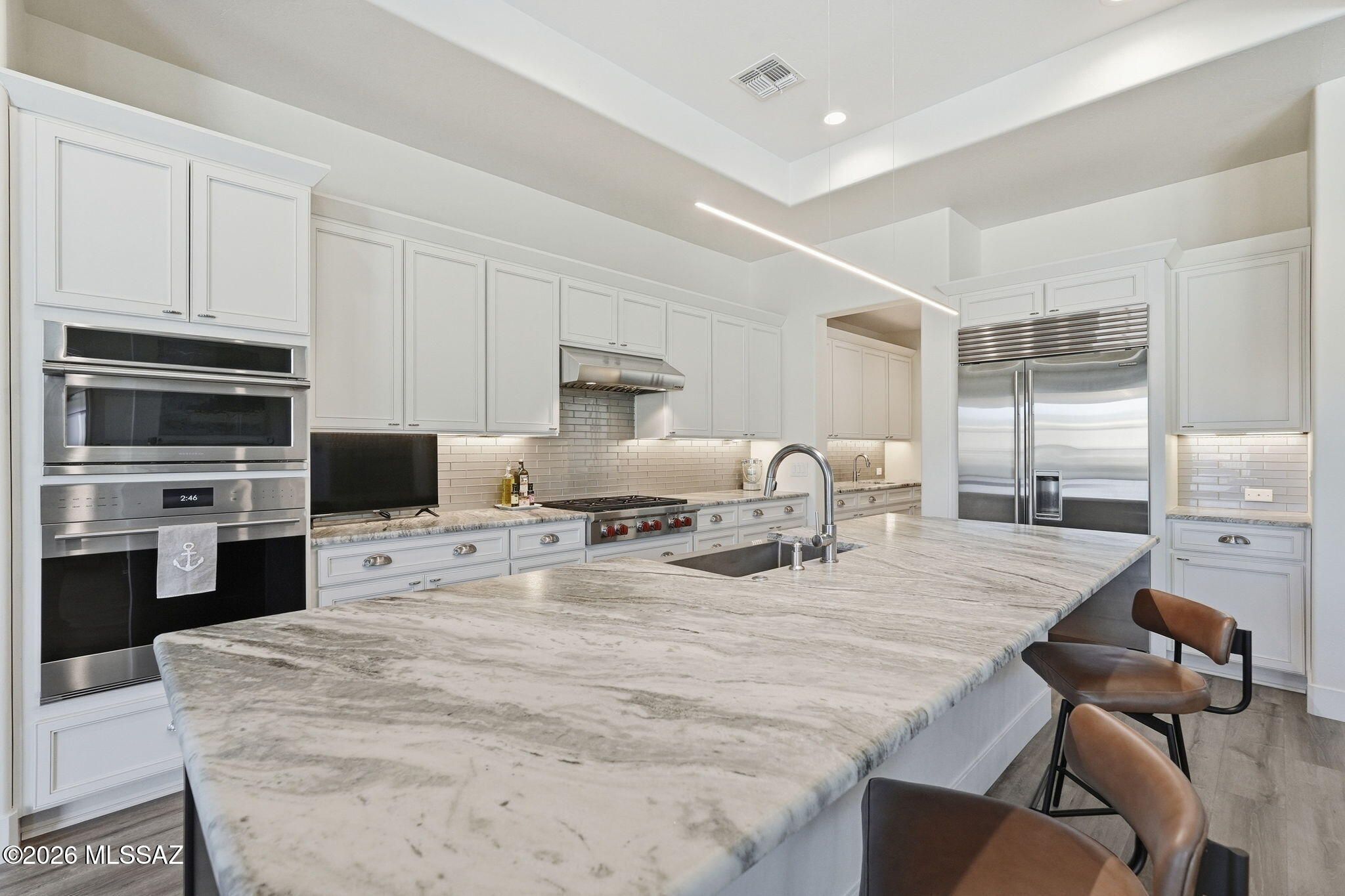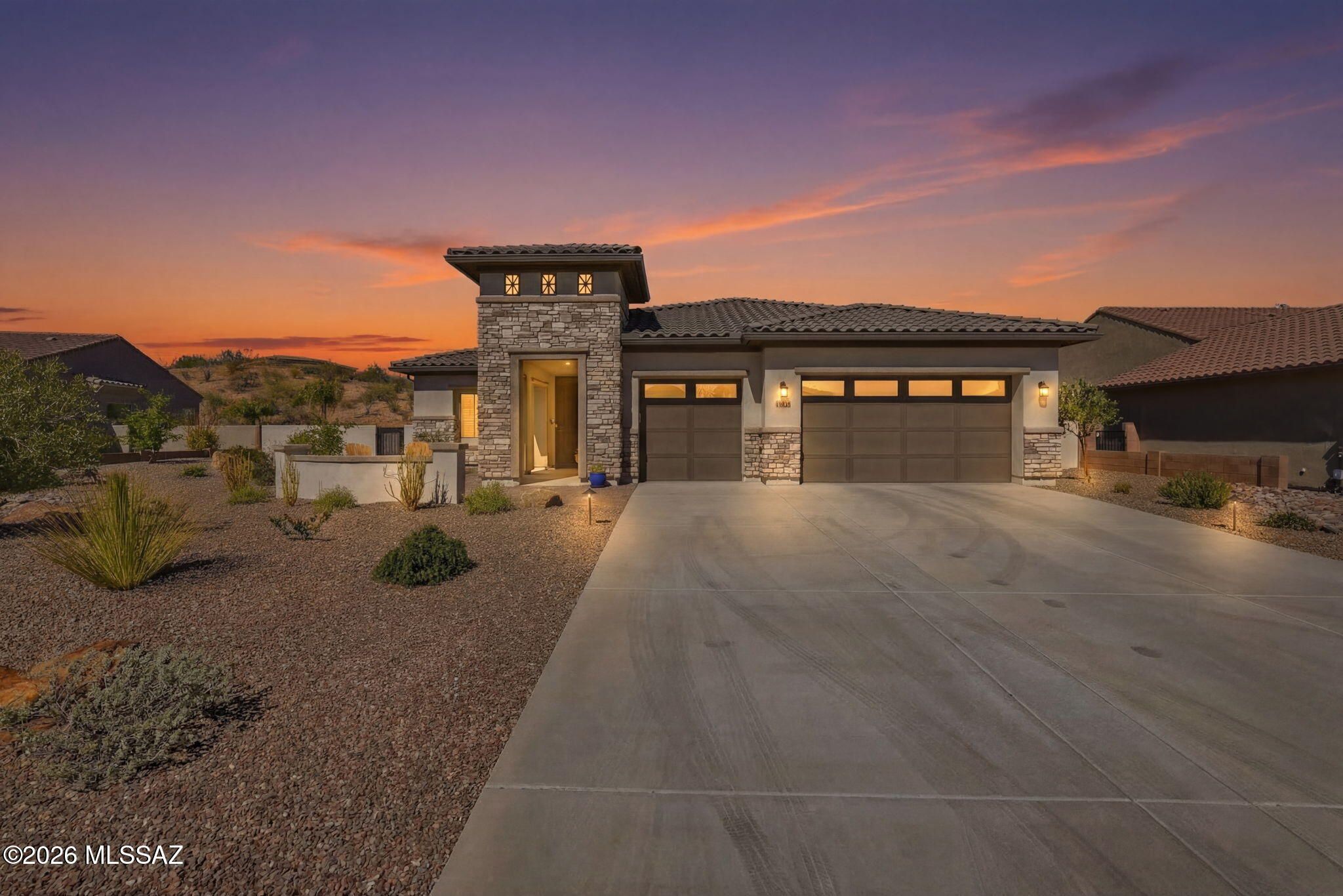 Beautifully appointed and landscaped 2022 home in The Preserve at SaddleBrooke featuring large 1/4 acre lot. Avalon floor plan with gas fireplace in the great room - light and bright living, dining, and kitchen spaces leading out to pool, desert and mountains out back. The backyard is an oasis with a saltwater pool - baja ledge and in-floor cleaning; hot tub, travertine paver patio, and artificial turf. Gourmet kitchen offers a large island, honed marble counters, Wolf, Sub-Zero, and Miele appliances, wine room, butler and walk-in pantries. Large den with plenty of space for relaxing, TV viewing, and desk area. Primary suite boasts a zero-grade shower and large walk-in closet. Guest room with ensuite bath and walk-in closet. Garage has utility sink, epoxy, and smart access door.