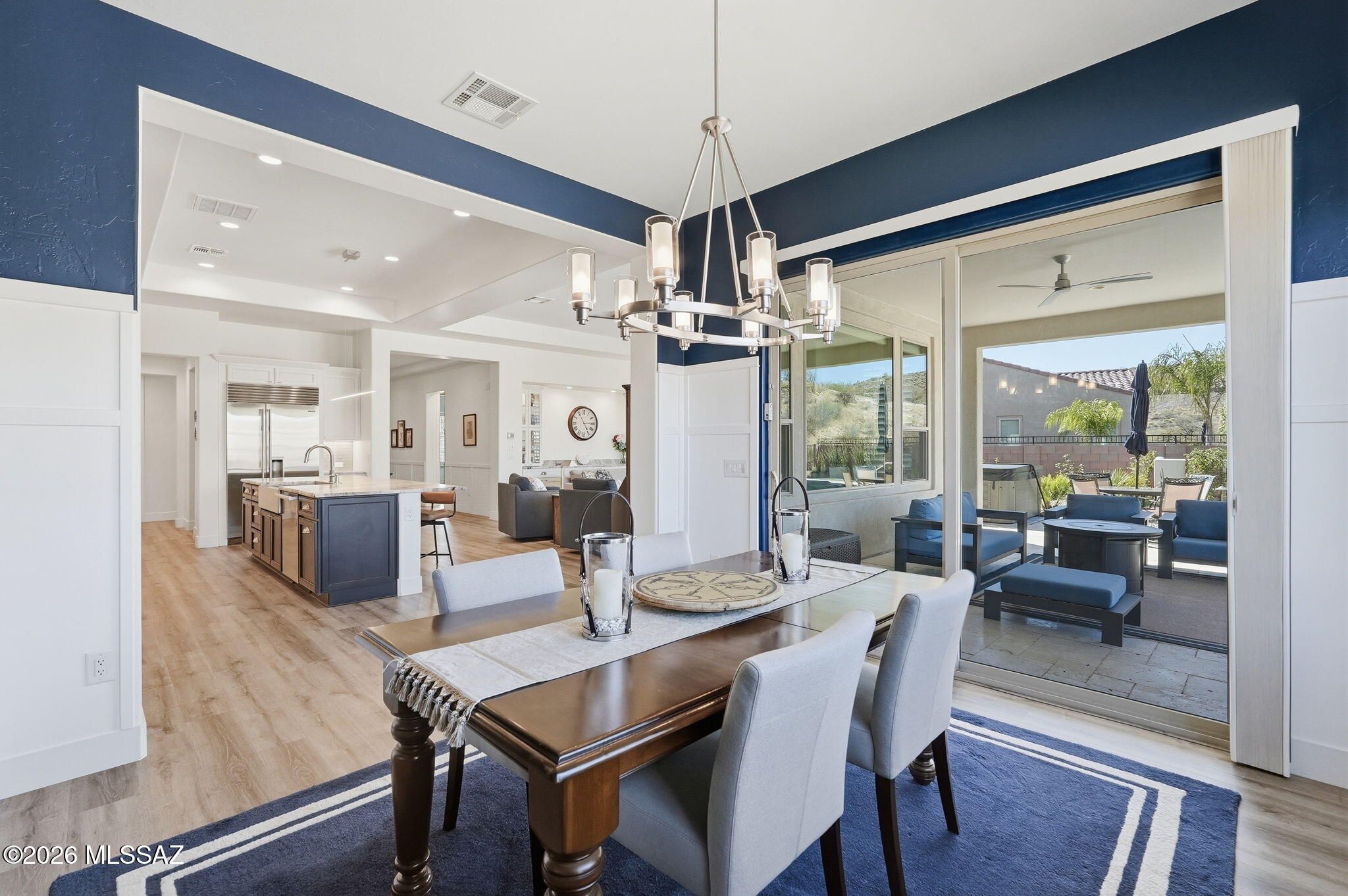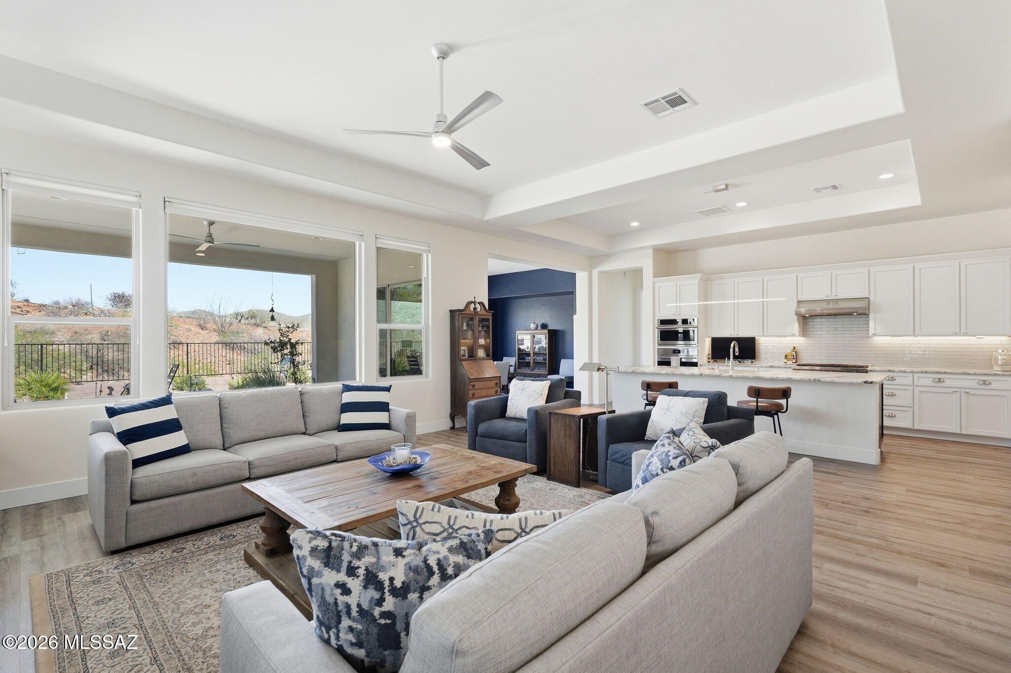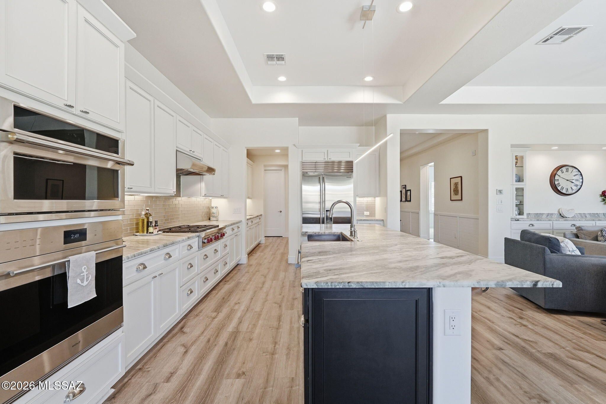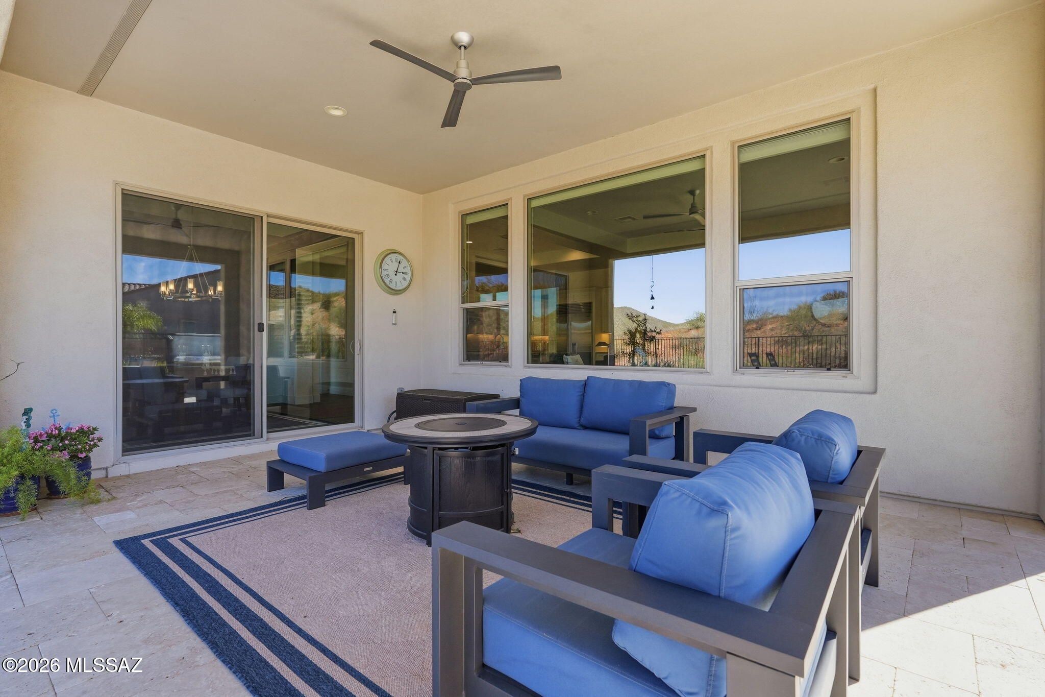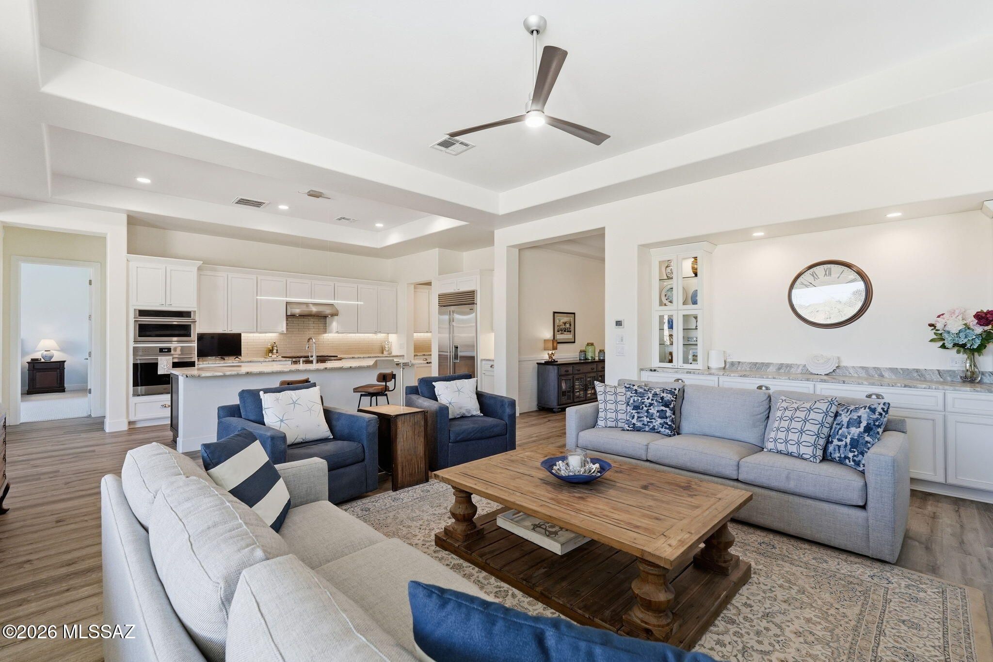 Beautifully appointed and landscaped 2022 home in The Preserve at SaddleBrooke featuring large 1/4 acre lot. Avalon floor plan with gas fireplace in the great room - light and bright living, dining, and kitchen spaces leading out to pool, desert and mountains out back. The backyard is an oasis with a saltwater pool - baja ledge and in-floor cleaning; hot tub, travertine paver patio, and artificial turf. Gourmet kitchen offers a large island, honed marble counters, Wolf, Sub-Zero, and Miele appliances, wine room, butler and walk-in pantries. Large den with plenty of space for relaxing, TV viewing, and desk area. Primary suite boasts a zero-grade shower and large walk-in closet. Guest room with ensuite bath and walk-in closet. Garage has utility sink, epoxy, and smart access door.