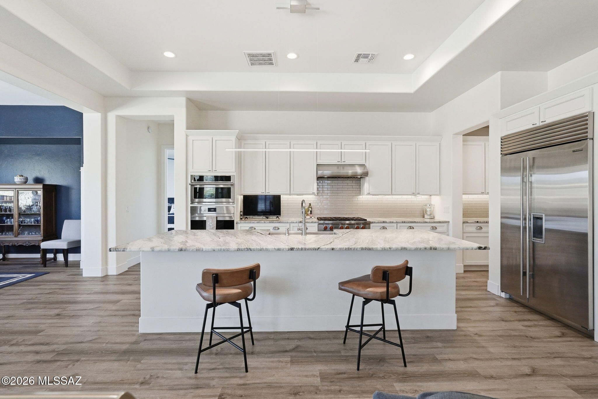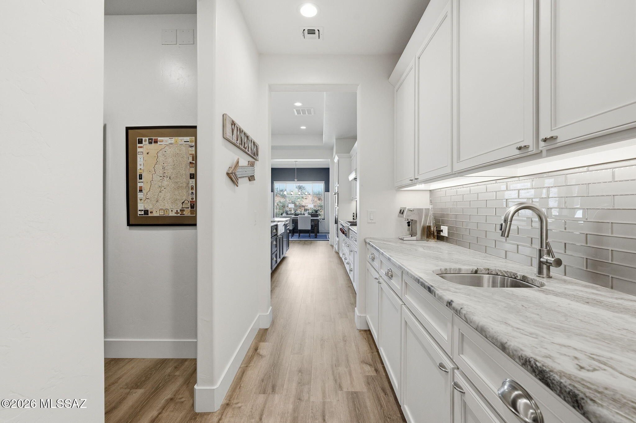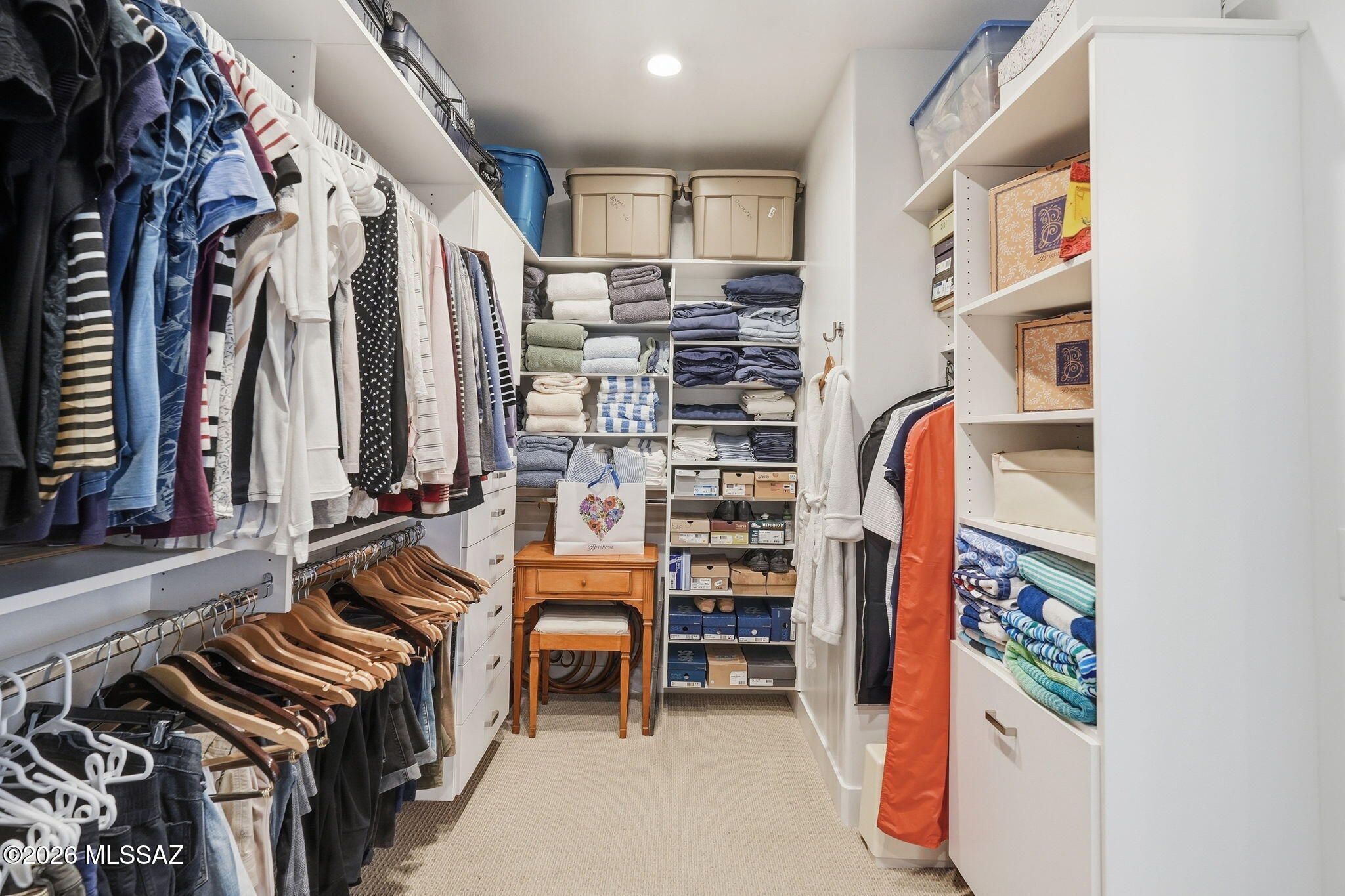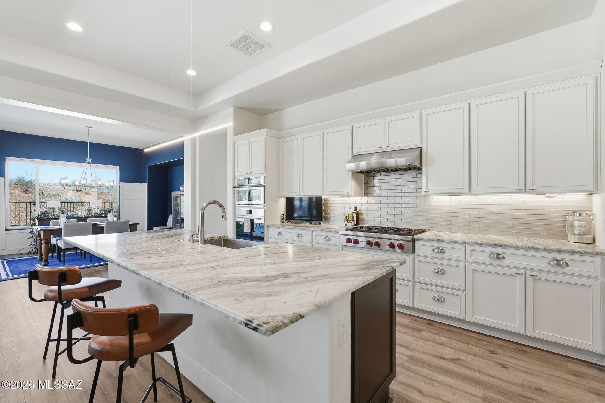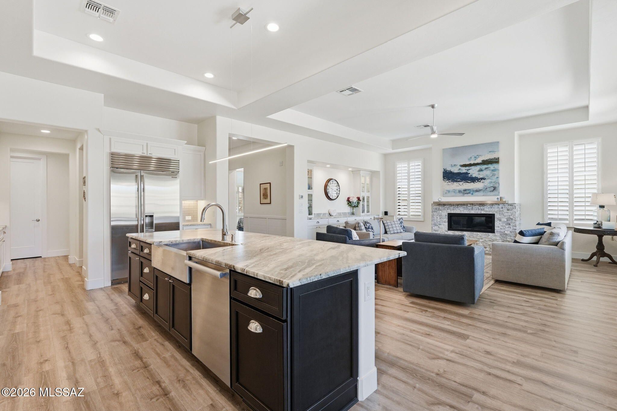 Beautifully appointed and landscaped 2022 home in The Preserve at SaddleBrooke featuring large 1/4 acre lot. Avalon floor plan with gas fireplace in the great room - light and bright living, dining, and kitchen spaces leading out to pool, desert and mountains out back. The backyard is an oasis with a saltwater pool - baja ledge and in-floor cleaning; hot tub, travertine paver patio, and artificial turf. Gourmet kitchen offers a large island, honed marble counters, Wolf, Sub-Zero, and Miele appliances, wine room, butler and walk-in pantries. Large den with plenty of space for relaxing, TV viewing, and desk area. Primary suite boasts a zero-grade shower and large walk-in closet. Guest room with ensuite bath and walk-in closet. Garage has utility sink, epoxy, and smart access door.