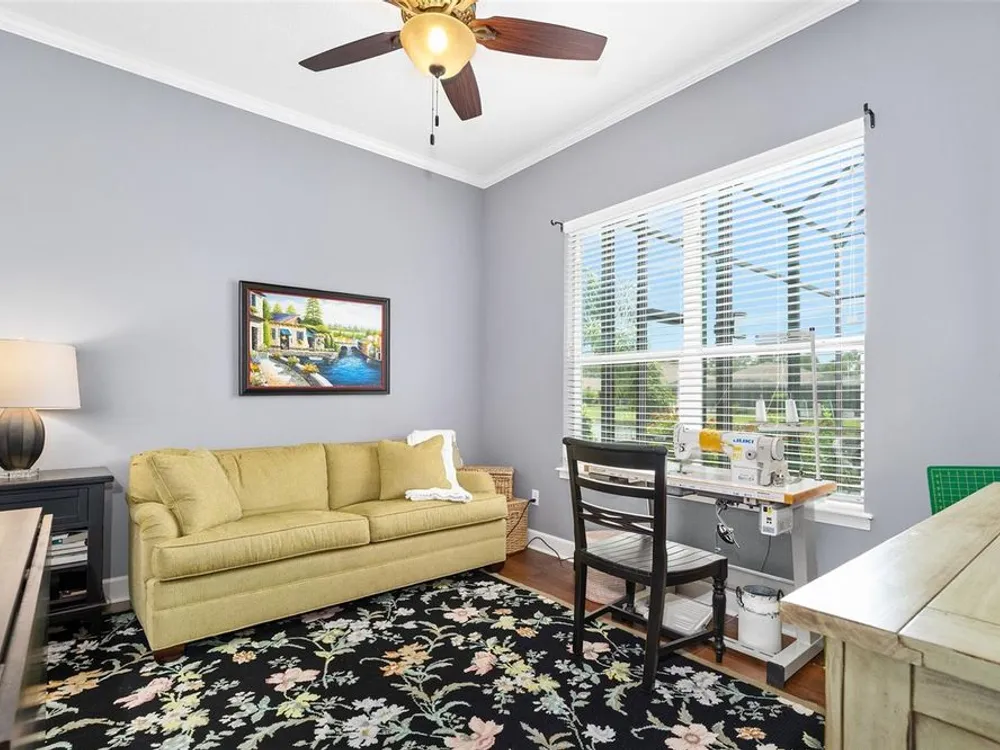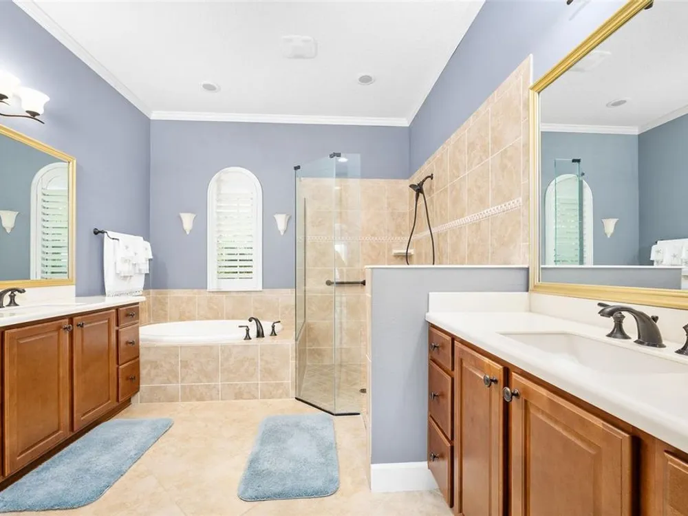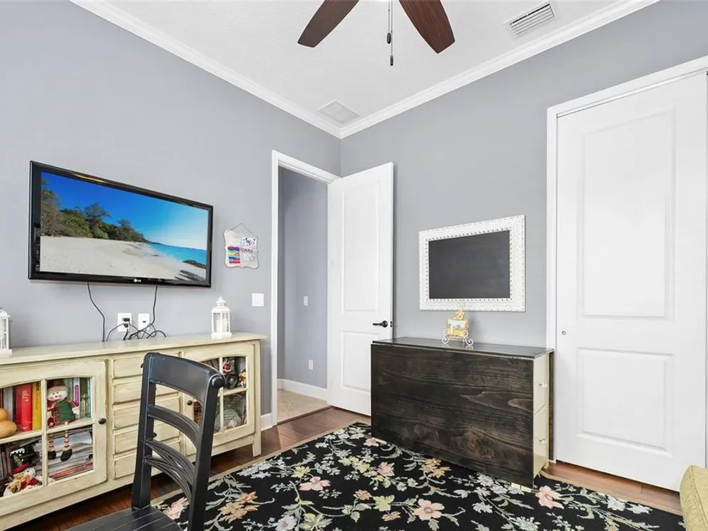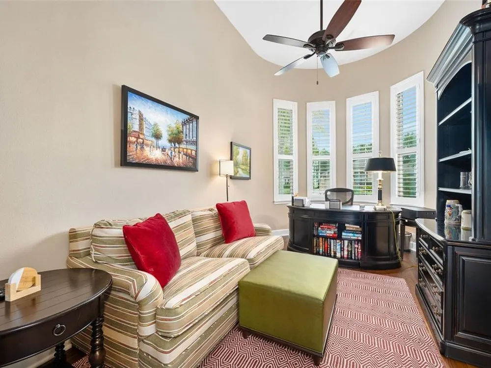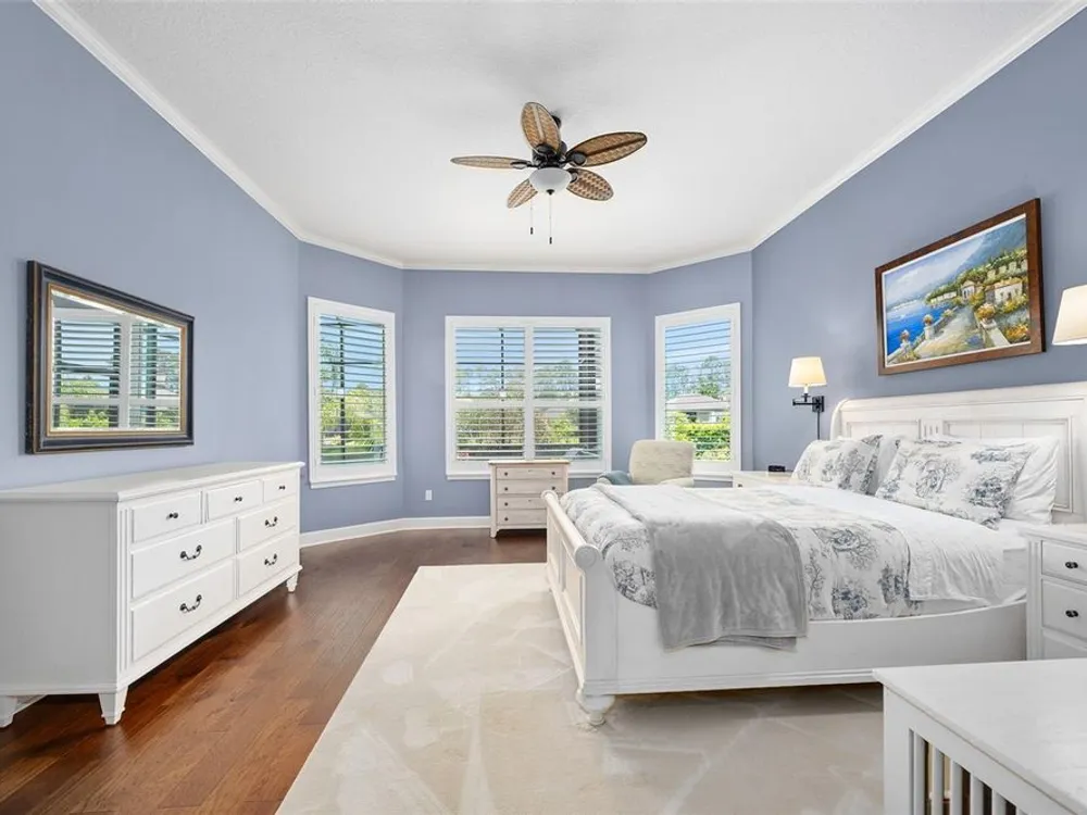 - Ceiling Fan(s), Crown Molding, Eat-in Kitchen, High Ceilings, Open Floorplan, Main Level Primary, Split Bedrooms, Stone Counters, Thermostat, Tray Ceiling(s), Walk-In Closet(s), Window Treatments
