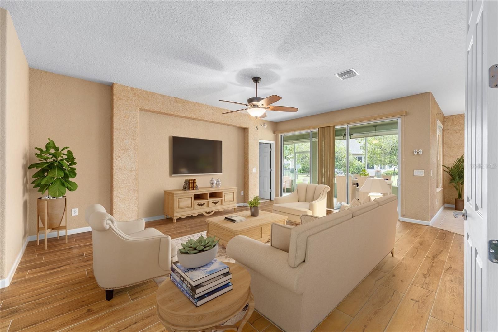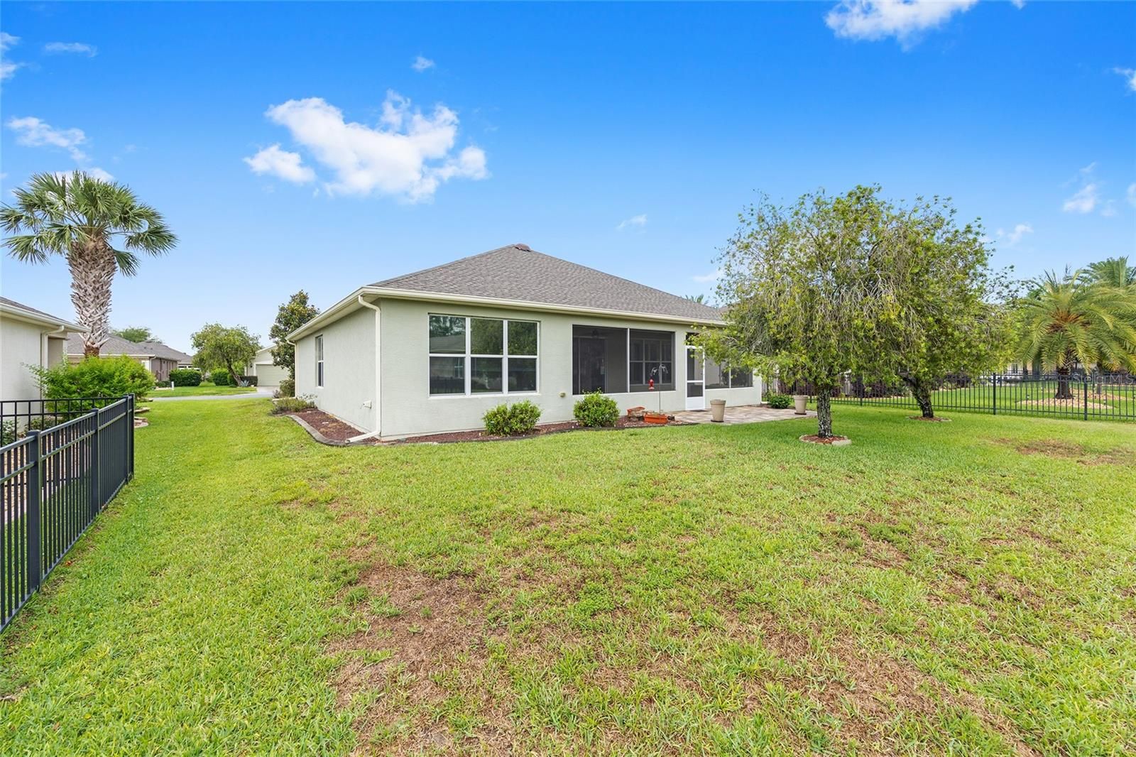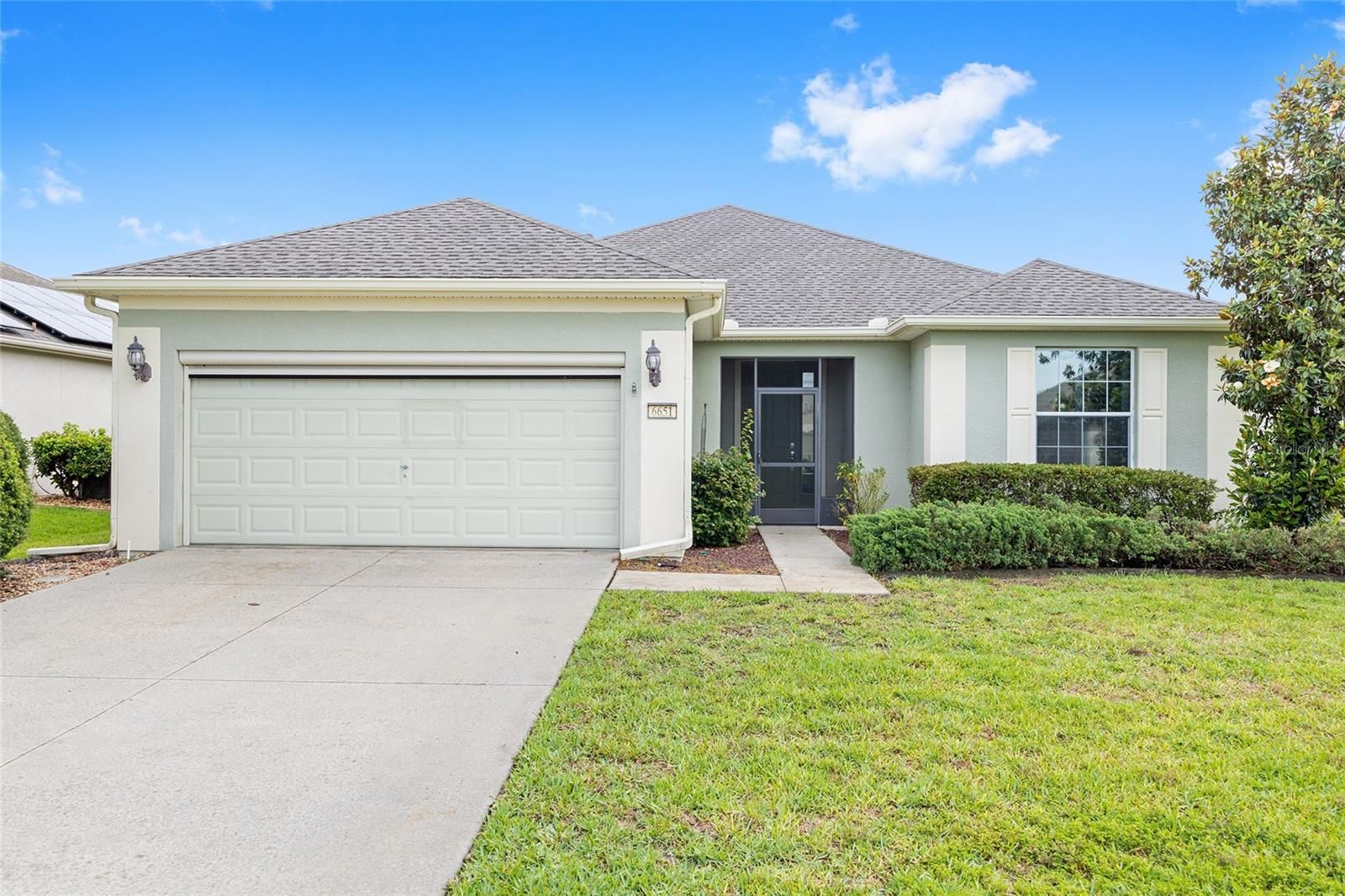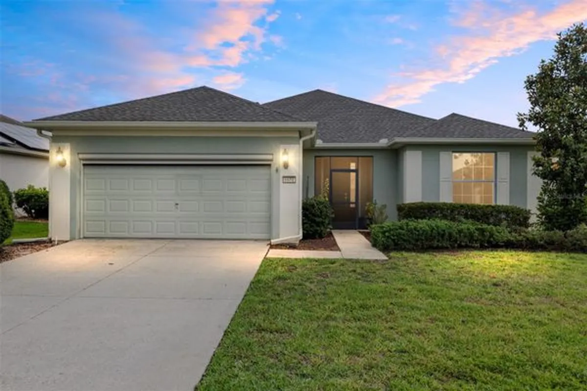 One or more photo(s) has been virtually staged. MOVE-IN READY WITH VERY MOTIVATED SELLERS! Welcome to this beautifully upgraded 2-bedroom, 2-bathroom home with a versatile flex room, located in the sought-after 55+ community of Del Webb Stone Creek. This well-maintained home combines comfort, style, and functionality with new wood-look ceramic tile in the entry, living room, and hallway; tile in the kitchen and bathrooms; and professionally cleaned carpet in the bedrooms and flex room. The freshly painted dining room adds a bright, updated touch to the main living space. The spacious kitchen features solid surface countertops, a breakfast bar, pull-out cabinetry, and a generous dining area that has been newly painted. The split-bedroom floorplan offers privacy, with a primary suite that includes plantation shutters, a walk-in closet with custom built-ins, dual vanities, a walk-in shower, and linen closet. The guest bedroom also features built-ins and plantation shutters, with a nearby bath offering a tub/shower combo and vanity. Other highlights include a laundry room with washer, dryer, and cabinets; a smart panel for connectivity; whole-house water filtration system; and an over-the-air antenna in the attic. The garage boasts a new roll-up screen (2024), epoxy flooring, attic stairs, utility sink, and built-in shelving. Outdoor living is easy with a newly screened lanai featuring a solid knee-wall, sunshades, ceiling fans, and a paver patio. Curbed planting beds and a screened front porch with plantation shutters add charm and curb appeal. Major updates include a new roof (2022), HVAC (2024), hot water heater (2023), and kitchen appliances—range, microwave, dishwasher, and disposal—all replaced in 2024. A transferable termite bond adds peace of mind. Del Webb Stone Creek offers resort-style amenities, including a golf course, pool, fitness center, and a wide range of clubs and activities. Don’t miss your chance to own this move-in-ready, upgraded home in one of Ocala’s premier active adult communities—schedule your private showing today!