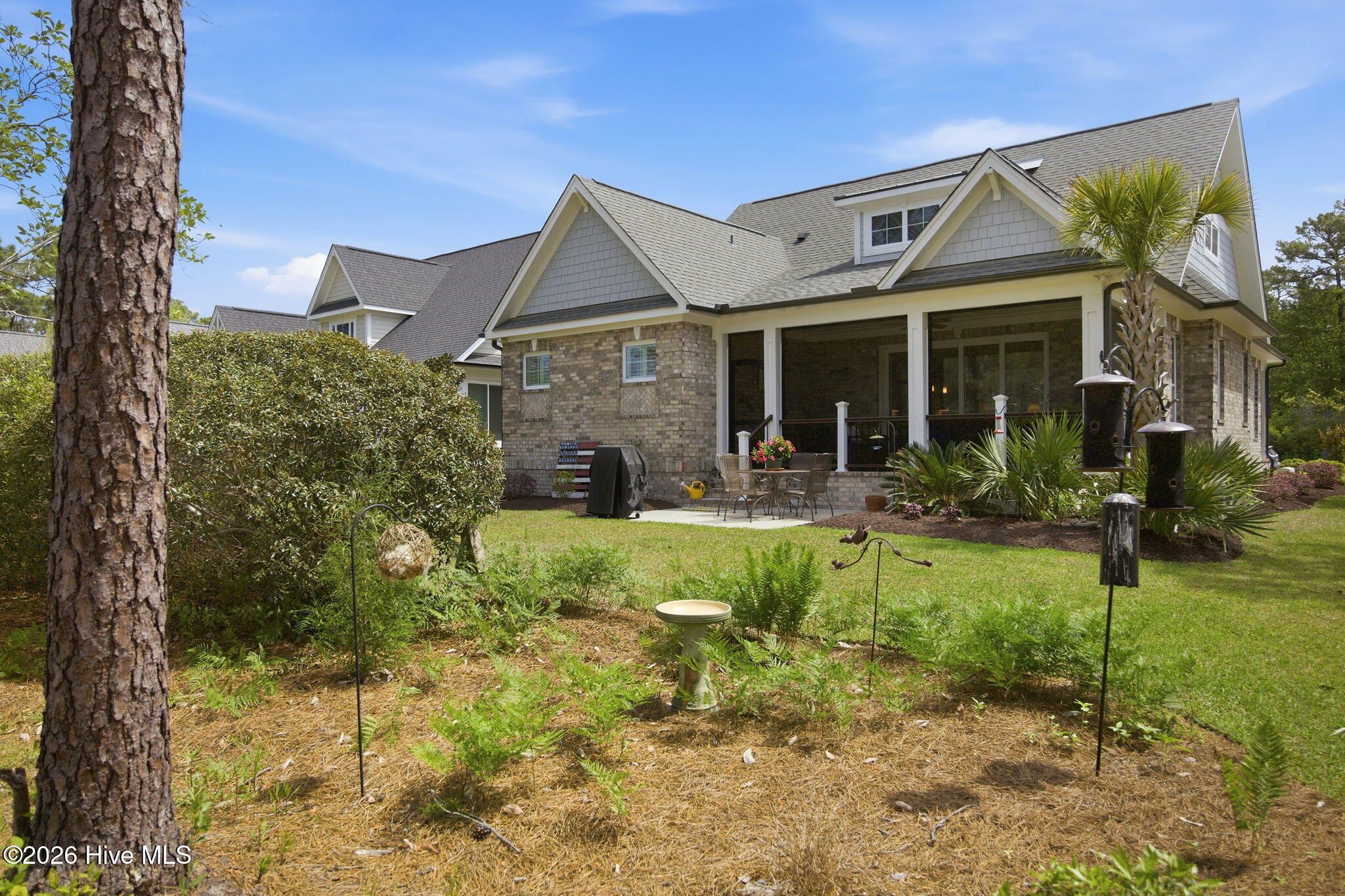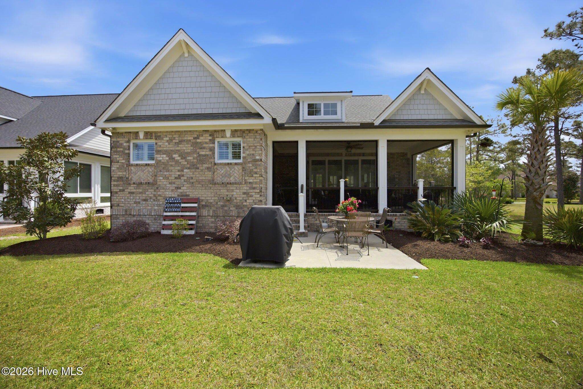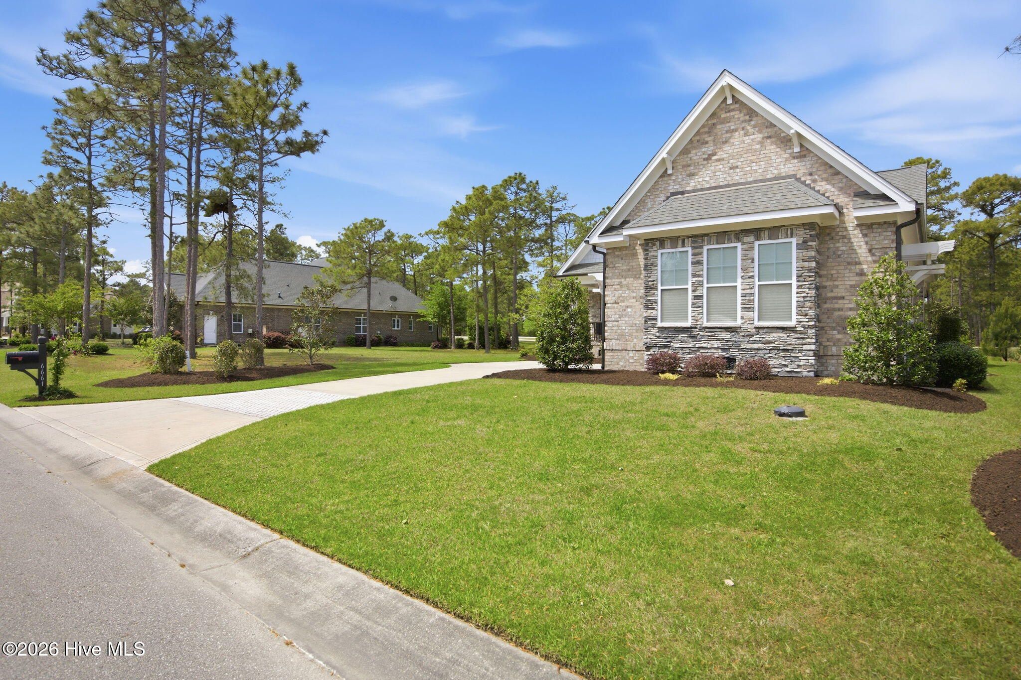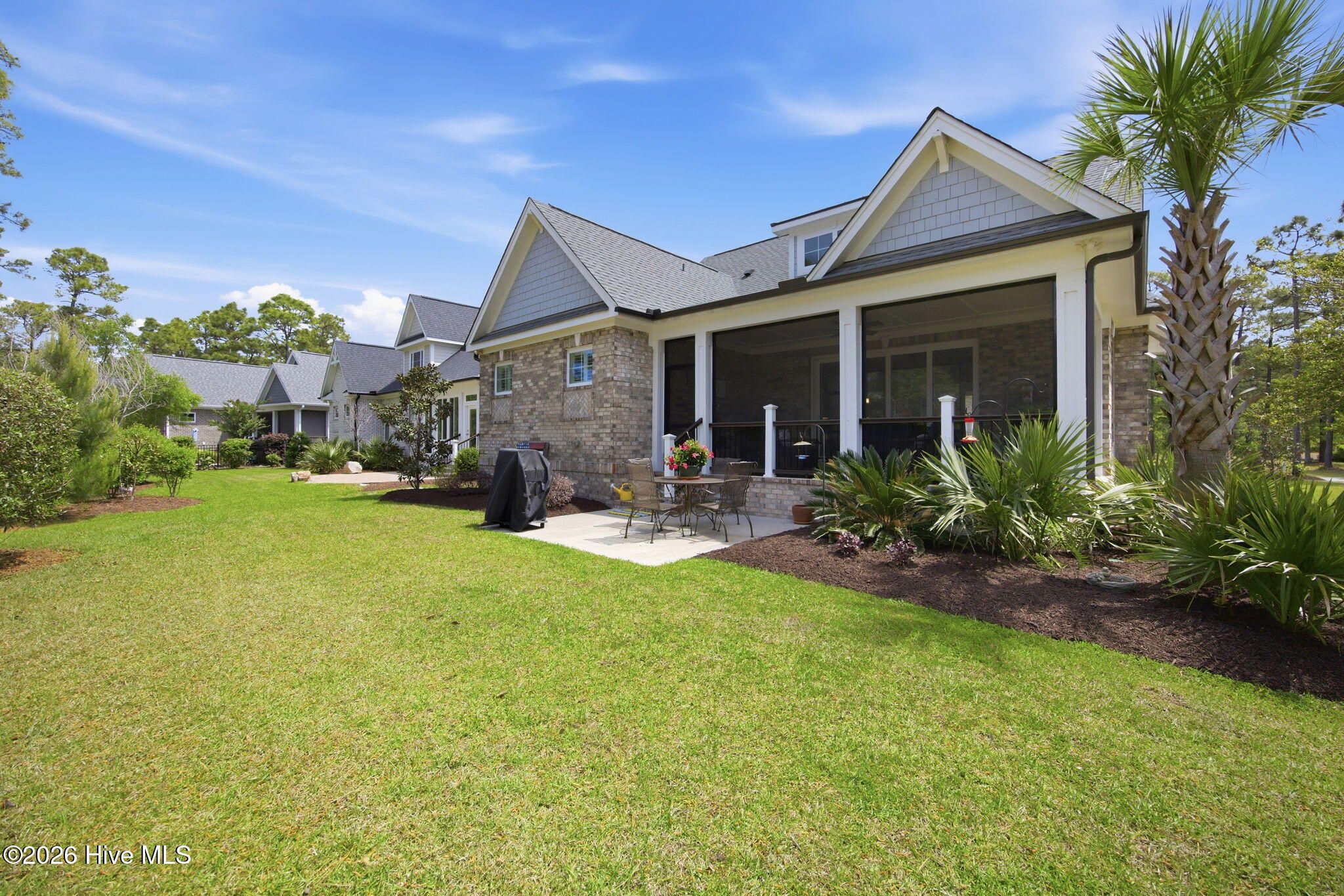 Welcome to this beautifully crafted home where brick and stone accents paired with Hardie siding create timeless curb appeal. A set of craftsman-style front doors with glass detailing opens to a dramatic foyer highlighted by soaring 18-foot ceilings and elegant wainscoting. Thoughtfully designed cased openings guide you into the main living spaces. To one side, a refined dining room features a coffered ceiling and detailed trim, while straight ahead the great room impresses with a 12-foot vaulted ceiling, striking faux beams, and a 36-inch vent-free fireplace with custom mantle and shiplap surround. Engineered hardwood floors flow throughout the main living areas, leading to expansive 12-foot PGT sliding doors that open onto a tiled, screened porch--perfect for enjoying peaceful pond views. The kitchen is both functional and beautifully appointed, centered around a large eat-in island and accented by a classic subway tile backsplash. Features include under-cabinet lighting, a pot filler, a 60/40 stainless farmhouse sink, soft-close cabinetry, a direct vent hood, and a full suite of LG stainless appliances including a convection microwave/oven combo, dishwasher, and 5-burner gas cooktop. A spacious pantry offers ample storage. The owner's suite is a true retreat, featuring a tray ceiling with double crown molding, ambient rope lighting, recessed lighting, USB outlets, and a generous walk-in closet. The spa-like bath includes dual vanities, porcelain tile flooring, and a zero-entry shower with bench seating, custom tile work, and a LED-lit niche. Additional highlights include a large laundry room with built-ins, utility sink, and adjacent mudroom space, as well as solid core doors throughout, a HERS energy rating, and a tankless water heater. Outdoor living is equally inviting with a screened and tiled rear porch complete with ceiling fan and lighting, 2 car garage with epoxy coated floor, an upgraded landscaping package, full irrigation system with drip lines, and a 12' x 12' patio--perfect for relaxing or entertaining. You'll appreciate the convenience of the extra-wide driveway, providing ample space for easy entry and exit at your new home. Property is located just a short stroll to the amenities center. Located in the golf course community of Ocean Ridge, an exceptional coastal Carolina location along with a private oceanfront Beach Club on Sunset Beach--recognized by National Geographic as one of the top beaches in the world. Residents enjoy an unmatched amenity package including 72 holes of championship golf, multiple clubhouses with dining, an owners' lounge, walking trails, a fitness and cardio center, indoor, outdoor, and children's pools, tennis and pickleball courts, parks, a community pavilion, and over 100 clubs and activities. Ocean Ridge has also been recognized as one of the ''Top 100 Communities in America'' by Where to Retire.