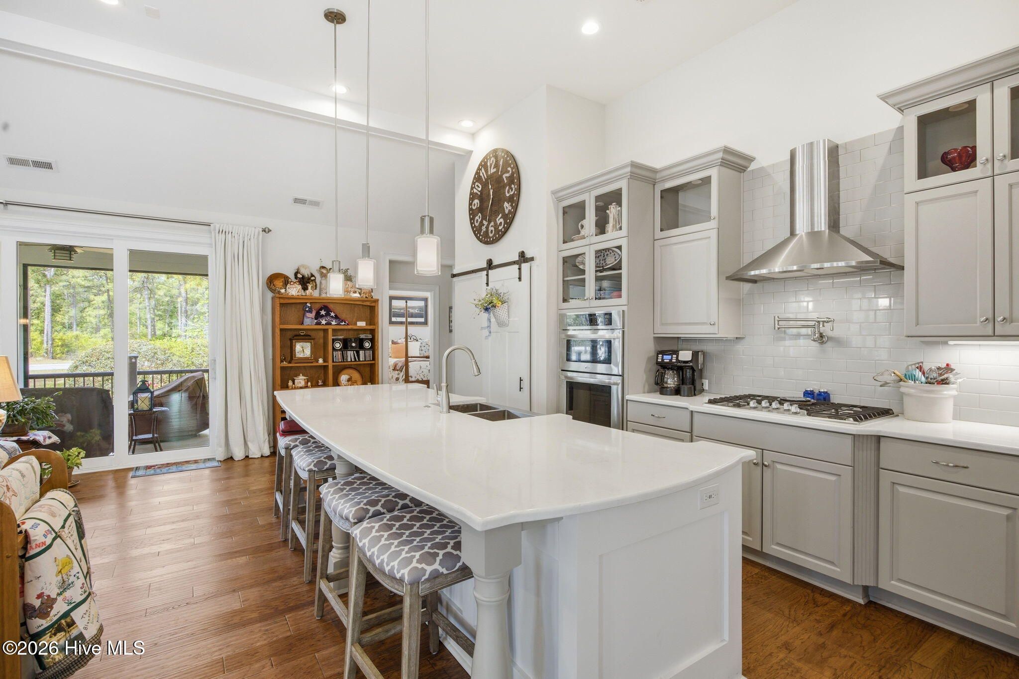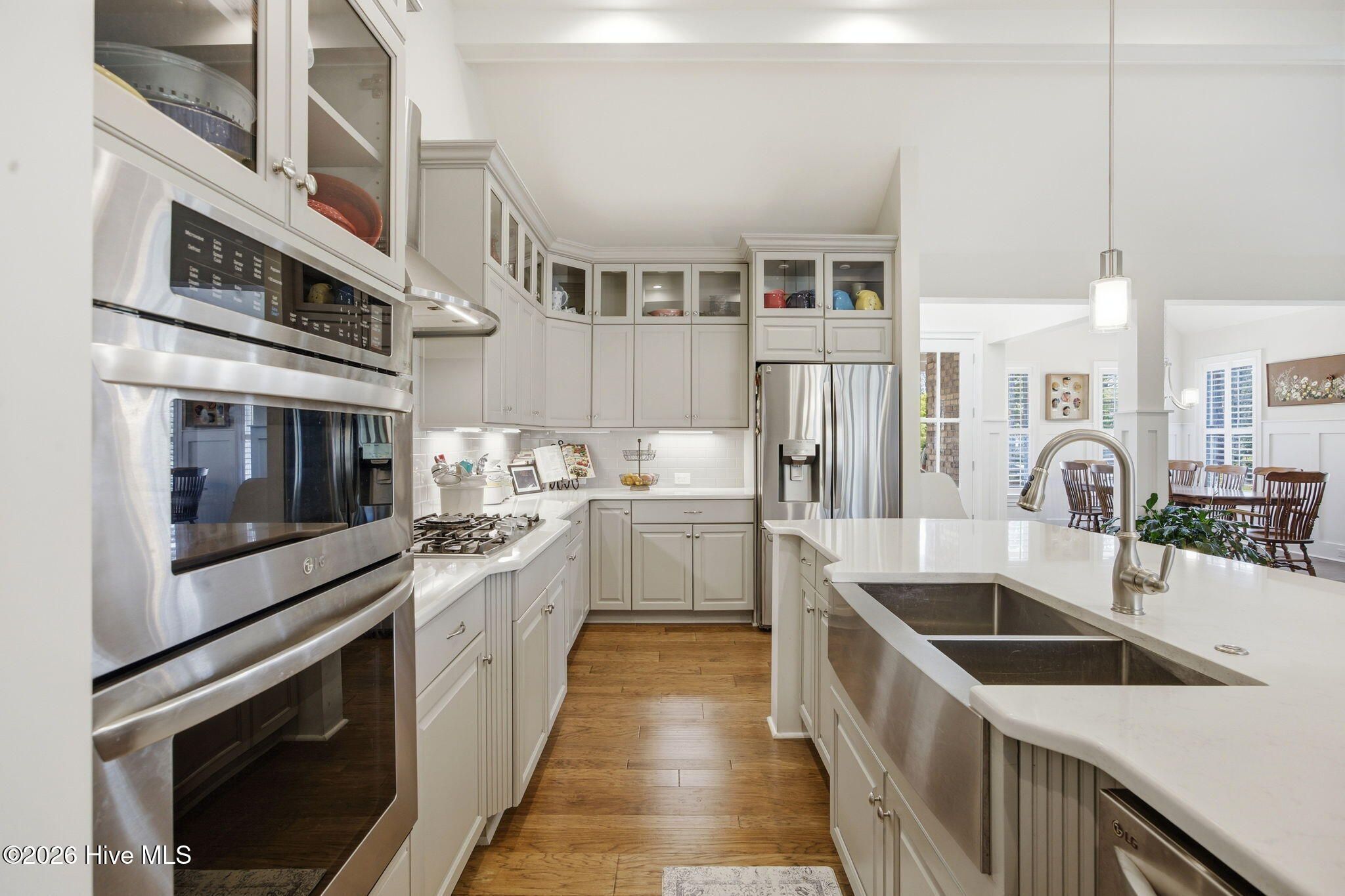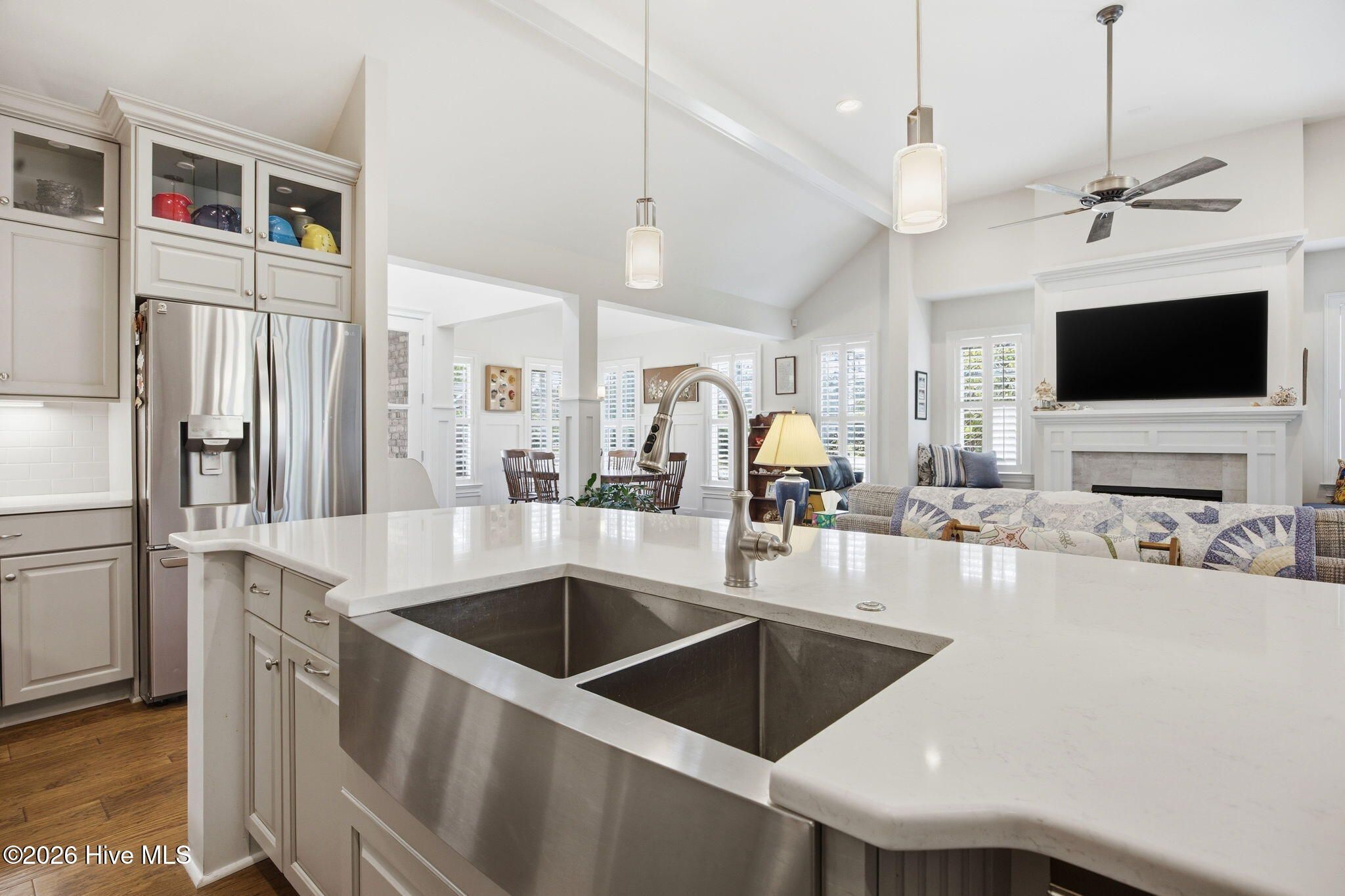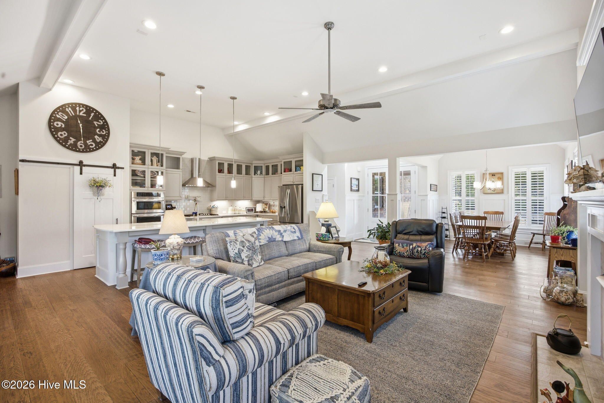 Welcome to this beautifully crafted home where brick and stone accents paired with Hardie siding create timeless curb appeal. A set of craftsman-style front doors with glass detailing opens to a dramatic foyer highlighted by soaring 18-foot ceilings and elegant wainscoting. Thoughtfully designed cased openings guide you into the main living spaces. To one side, a refined dining room features a coffered ceiling and detailed trim, while straight ahead the great room impresses with a 12-foot vaulted ceiling, striking faux beams, and a 36-inch vent-free fireplace with custom mantle and shiplap surround. Engineered hardwood floors flow throughout the main living areas, leading to expansive 12-foot PGT sliding doors that open onto a tiled, screened porch--perfect for enjoying peaceful pond views. The kitchen is both functional and beautifully appointed, centered around a large eat-in island and accented by a classic subway tile backsplash. Features include under-cabinet lighting, a pot filler, a 60/40 stainless farmhouse sink, soft-close cabinetry, a direct vent hood, and a full suite of LG stainless appliances including a convection microwave/oven combo, dishwasher, and 5-burner gas cooktop. A spacious pantry offers ample storage. The owner's suite is a true retreat, featuring a tray ceiling with double crown molding, ambient rope lighting, recessed lighting, USB outlets, and a generous walk-in closet. The spa-like bath includes dual vanities, porcelain tile flooring, and a zero-entry shower with bench seating, custom tile work, and a LED-lit niche. Additional highlights include a large laundry room with built-ins, utility sink, and adjacent mudroom space, as well as solid core doors throughout, a HERS energy rating, and a tankless water heater. Outdoor living is equally inviting with a screened and tiled rear porch complete with ceiling fan and lighting, 2 car garage with epoxy coated floor, an upgraded landscaping package, full irrigation system with drip lines, and a 12' x 12' patio--perfect for relaxing or entertaining. You'll appreciate the convenience of the extra-wide driveway, providing ample space for easy entry and exit at your new home. Property is located just a short stroll to the amenities center. Located in the golf course community of Ocean Ridge, an exceptional coastal Carolina location along with a private oceanfront Beach Club on Sunset Beach--recognized by National Geographic as one of the top beaches in the world. Residents enjoy an unmatched amenity package including 72 holes of championship golf, multiple clubhouses with dining, an owners' lounge, walking trails, a fitness and cardio center, indoor, outdoor, and children's pools, tennis and pickleball courts, parks, a community pavilion, and over 100 clubs and activities. Ocean Ridge has also been recognized as one of the ''Top 100 Communities in America'' by Where to Retire.